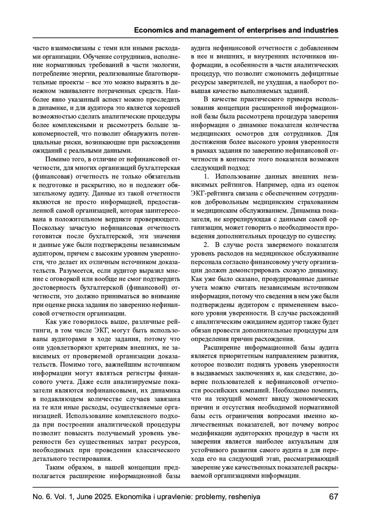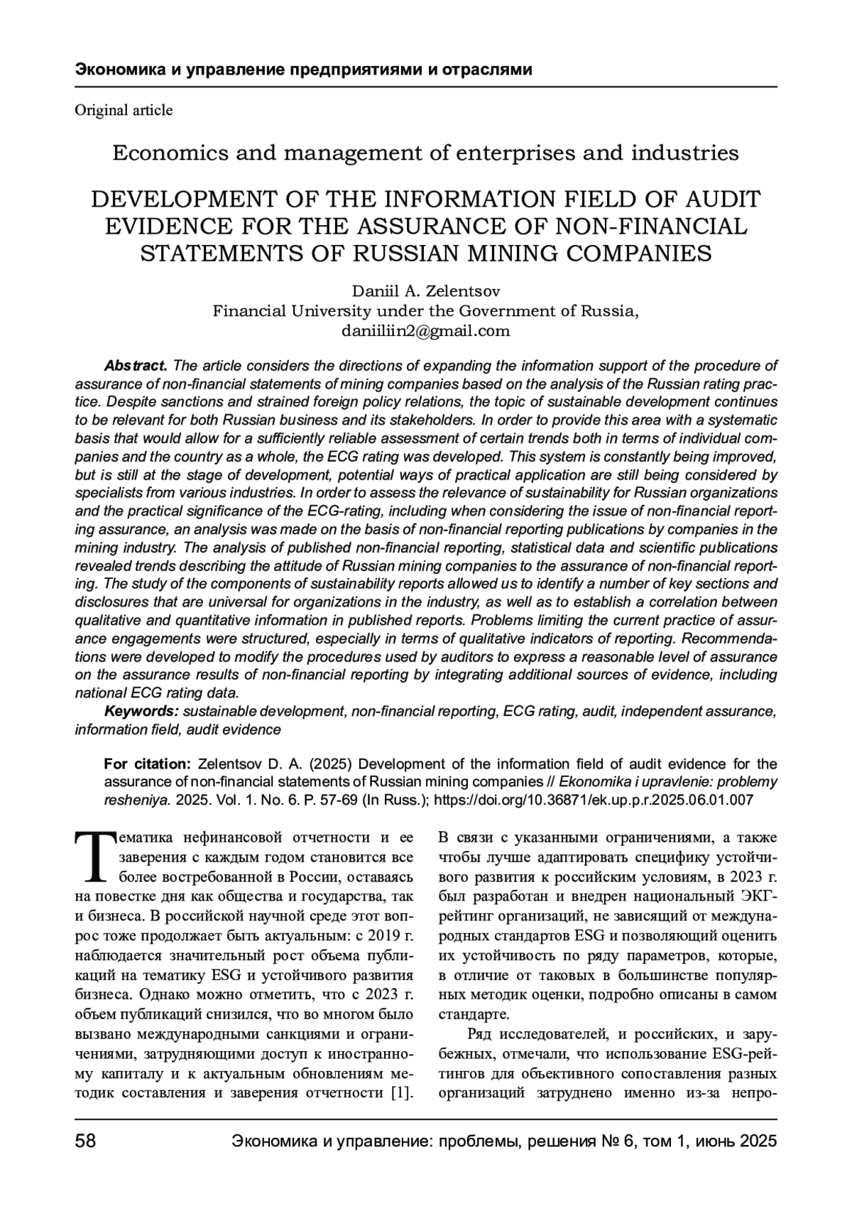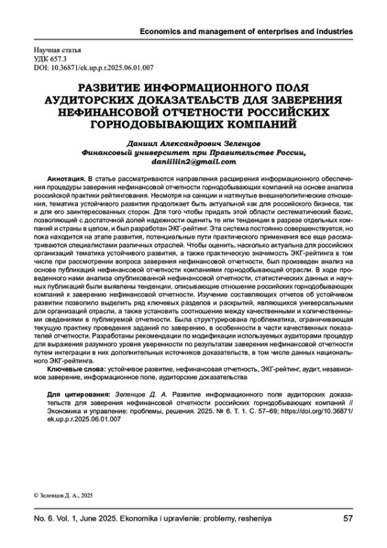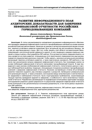 В статье рассматриваются направления расширения информационного обеспечения процедуры заверения нефинансовой отчетности горнодобывающих компаний на основе анализа российской практики рейтингования. Несмотря на санкции и натянутые внешнеполитические отношения, тематика устойчивого развития продолжает быть актуальной как для российского бизнеса, так и для его заинтересованных сторон. Для того чтобы придать этой области систематический базис, позволяющий с достаточной долей надежности оценить те или тенденции в разрезе отдельных компаний и страны в целом, и был разработан ЭКГ-рейтинг. Эта система постоянно совершенствуется, но пока находится на этапе развития, потенциальные пути практического применения все еще рассматриваются специалистами различных отраслей. Чтобы оценить, насколько актуальна для российских организаций тематика устойчивого развития, а также практическую значимость ЭКГ-рейтинга в том числе при рассмотрении вопроса заверения нефинансовой отчетности, был произведен анализ на основе публикаций нефинансовой отчетности компаниями горнодобывающей отрасли. В ходе проведенного нами анализа опубликованной нефинансовой отчетности, статистических данных и научных публикаций были выявлены тенденции, описывающие отношение российских горнодобывающих компаний к заверению нефинансовой отчетности. Изучение составляющих отчетов об устойчивом развитии позволило выделить ряд ключевых разделов и раскрытий, являющихся универсальными для организаций отрасли, а также установить соотношение между качественными и количественными сведениями в публикуемой отчетности. Была структурирована проблематика, ограничивающая текущую практику проведения заданий по заверению, в особенности в части качественных показателей отчетности. Разработаны рекомендации по модификации используемых аудиторами процедур для выражения разумного уровня уверенности по результатам заверения нефинансовой отчетности путем интеграции в них дополнительных источников доказательств, в том числе данных национального ЭКГ-рейтинга.