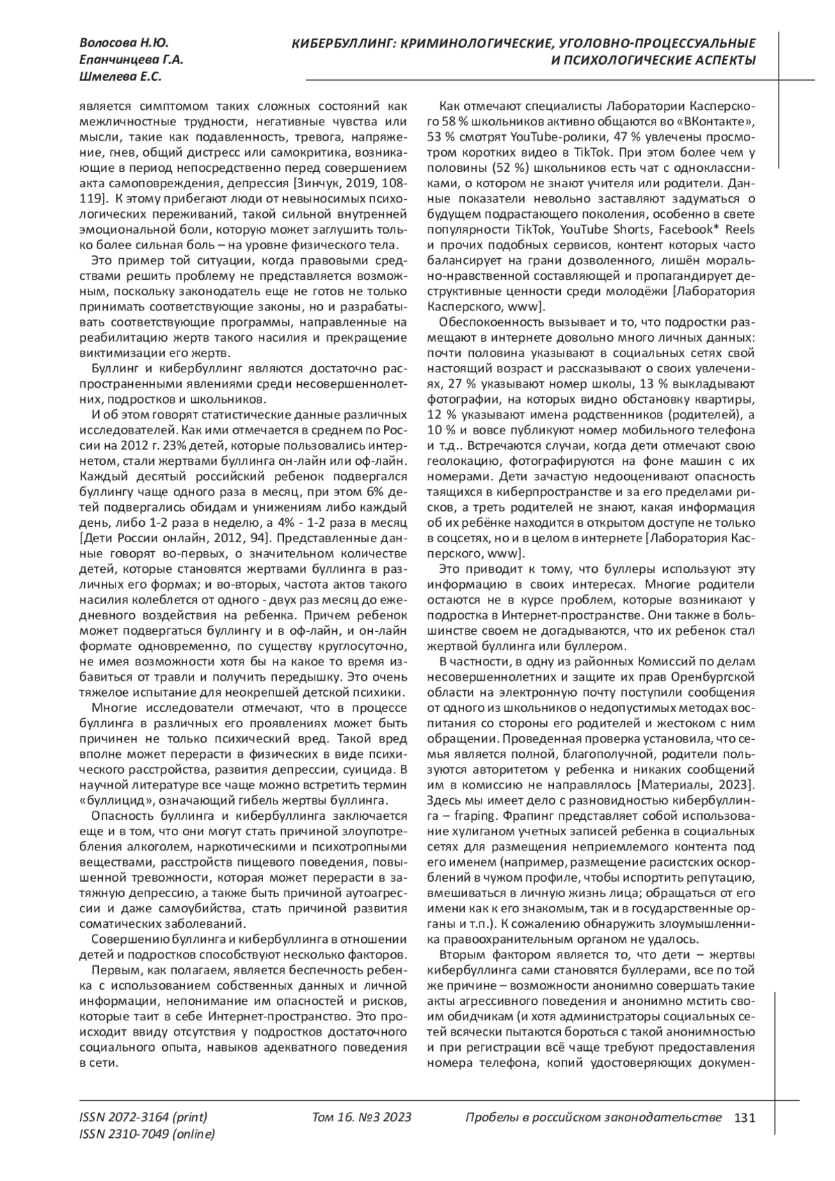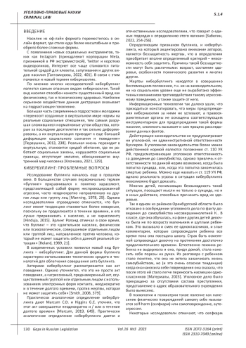 Zabelin S.E. The phenomenon of cyberbullying in the modern world / S.E. Zabelin // Substantive and procedural aspects of modern education: materials of the IV International Scientific and Practical Conference / Ed.-comp. I.A. Romanovskaya, E.A. Tarabanovskaya. - Astrakhan, 2022. - pp. 254-256. EDN: YBAUZC
