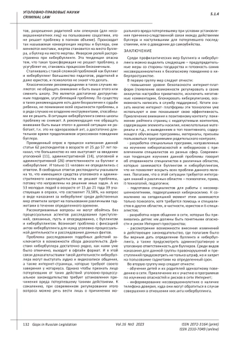 Проведенный опрос в процессе написания данной статьи 62 респондентов в возрасте от 25 до 57 лет показал, что большинство из них выступают за введение уголовной (11), административной (14), уголовной и административной (26) ответственности за буллинг и кибербуллинг. И только 11 человек не определились с ответом. В свободных ответах респонденты указывали на то, что имеющиеся средства уголовного и административного законодательства не решают проблемы, потому что направлены на решение иных задач. А из 53 молодых людей в возрасте от 15 до 21 года 39 участвующих в опросе, что составляет 73,58%, на вопрос о виде наказания за кибербулинг среди действенных мер отметили запрет на пользование различными гаджетами в течении определенного времени.