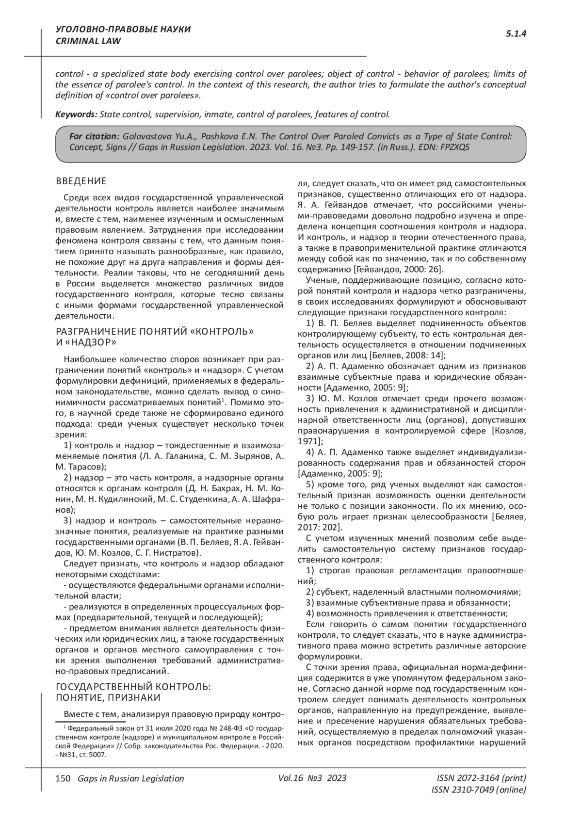 В статье рассматриваются контроль за условно-досрочно освобожденными, его основные признаки и понятие с точки зрения одного из видов государственного контроля. Целью исследования является выделение системы самостоятельных признаков контроля за условно-досрочно освобожденными осужденными, исходя из которых формулируется авторское концептуальное определение контроля за условно-досрочно освобожденными. Выводы. В результате проведенного исследования автор приходит к тому, что государственный контроль имеет ряд особых признаков, которые существенно отличают его от надзора. Так, среди особых признаков государственного контроля автором выделяются: строгая правовая регламентация правоотношений, субъект, наделенный властными полномочиями, взаимные субъективные права и обязанности, возможность привлечения к ответственности. С учетом приведенных признаков автор приходит к мнению, что контроль за такой категорией как условно-досрочно освобожденные осужденные является одним из видов государственного контроля, обладающим самостоятельными признаками и выделяет их систему. Так, основными признаками контроля за условно-досрочно освобожденными являются: постановление суда об условно-досрочном освобождении, вступившее в законную силу, как основание возникновения контроля; осуществление контроля в строго регламентированной процессуальной форме; субъект контроля - специализированный государственный орган, осуществляющий контроль за условно-досрочно освобожденными осужденными; объект контроля - поведение условно-досрочно освобожденного осужденного; пределы существования контроля за условно-досрочно освобожденным лицом. В рамках данного исследования автором предпринимается попытка сформулировать авторское концептуальное определение «контроль за условно-досрочно освобожденными осужденными».