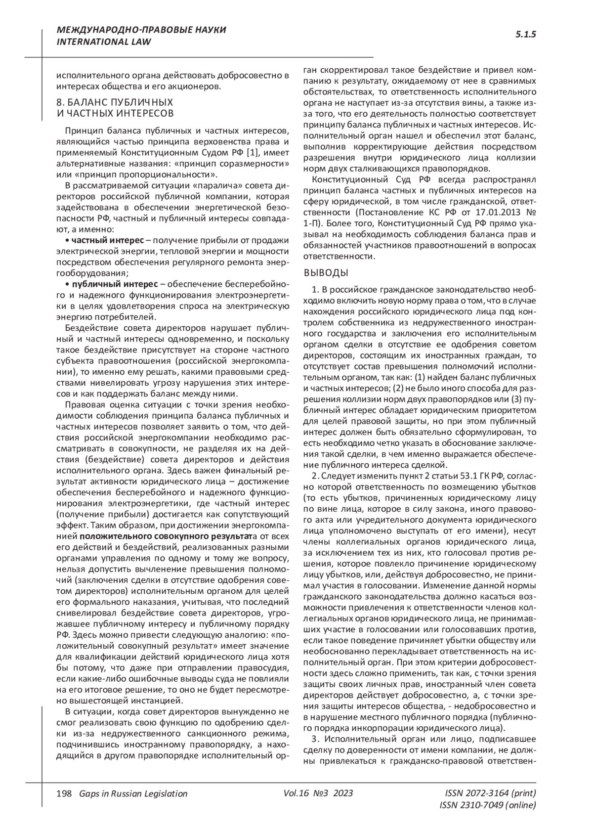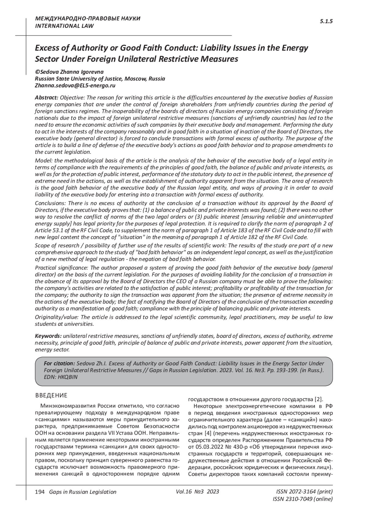 Задача: Причиной написания статьи являются трудности, с которыми столкнулись исполнительные органы российских энергетических компаний, находящихся в период действия иностранных санкционных режимов под контролем иностранных акционеров из недружественных стран. Неработоспособность состоящих из иностранных граждан советов директоров российских энергетических компаний из-за влияния иностранных односторонних мер ограничительного характера (санкций недружественных стран) привела к необходимости обеспечения хозяйственной деятельности таких компаний силами их исполнительного органа и менеджмента. Исполняя обязанность действовать в интересах общества разумно и добросовестно в ситуации бездействия совета директоров, исполнительный орган (генеральный директор) вынужден заключать сделки с формальным превышением полномочий. Цель статьи - выстроить линию защиты действий исполнительного органа как добросовестного поведения и предложить дополнения в действующее законодательство. Модель: Методологическая основа статьи - анализ поведения исполнительного органа юридического лица с точки зрения соблюдения требований принципов добросовестности, баланса публичных и частных интересов, а также на предмет защиты публичного интереса, выполнения установленной законом обязанности действовать в интересах общества, наличия крайней необходимости в действиях, а также установления полномочий, явствующих из обстановки. Областью исследования является добросовестность поведения исполнительного органа российского юридического лица, и способы ее доказывания с целью избежания ответственности исполнительного органа за заключение сделки с формальным превышением полномочий. Выводы: Превышение полномочий при заключении сделки без ее одобрения советом директоров отсутствует, если исполнительны орган докажет, что: (1) был найден баланс публичных и частных интересов; (2) не было иного способа для разрешения коллизии норм двух правопорядков или (3) публичный интерес [обеспечение надежного и бесперебойного энергоснабжения] обладает юридическим приоритетом для целей правовой защиты. Требуется уточнить норму пункта 2 статьи 53.1 ГК РФ, дополнить норму пункта 1 статьи 183 ГК РФ и наполнить новым правовым содержанием понятие «обстановка» в смысле пункта 1 статьи 182 ГК РФ. Рамки исследования/возможность последующего использования результатов научной работы: Результаты исследования являются частью нового комплексного подхода к изучению «недобросовестного поведения» как самостоятельного правового понятия, а также к обоснованию нового метода правового регулирования - отрицания недобросовестного поведения. Практическое значение: Автором предложена система доказывания добросовестности поведения исполнительного органа (генерального директора) на основе действующего законодательства. Для целей избежания ответственности за заключение сделки при отсутствии ее одобрения советом директоров генеральный директор российской компании должен смочь доказать следующее: деятельность общества связана с удовлетворением публичного интереса; прибыльность или выгодность сделки для общества; полномочия по подписанию сделки, явствовали из обстановки; наличие крайней необходимости в действиях исполнительного органа; факт уведомления совет