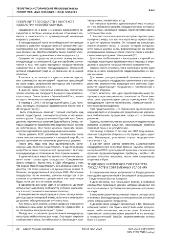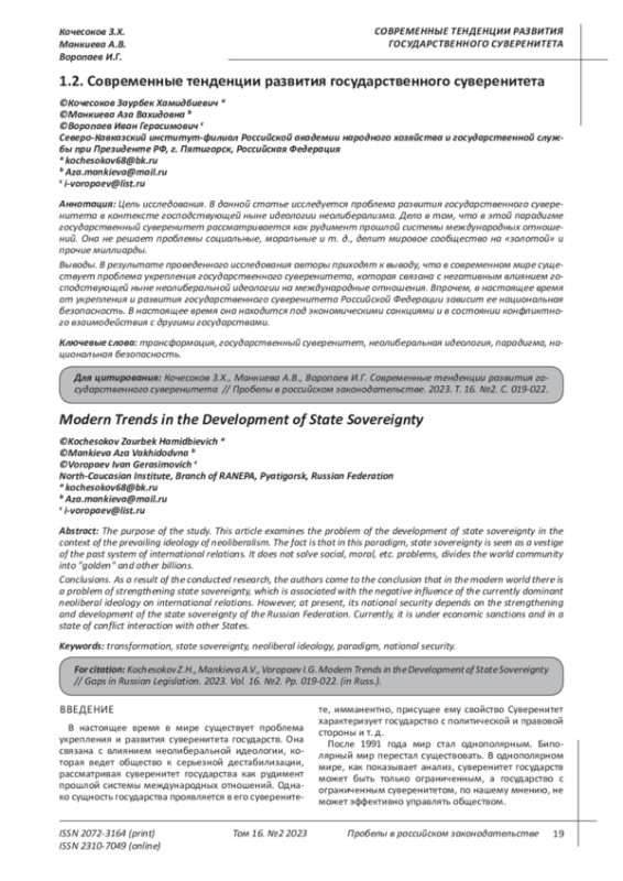 Цель исследования. В данной статье исследуется проблема развития государственного суверенитета в контексте господствующей ныне идеологии неолиберализма. Дело в том, что в этой парадигме государственный суверенитет рассматривается как рудимент прошлой системы международных отношений. Она не решает проблемы социальные, моральные и т. д., делит мировое сообщество на «золотой» и прочие миллиарды. Выводы. В результате проведенного исследования авторы приходят к выводу, что в современном мире существует проблема укрепления государственного суверенитета, которая связана с негативным влиянием господствующей ныне неолиберальной идеологии на международные отношения. Впрочем, в настоящее время от укрепления и развития государственного суверенитета Российской Федерации зависит ее национальная безопасность. В настоящее время она находится под экономическими санкциями и в состоянии конфликтного взаимодействия с другими государствами.