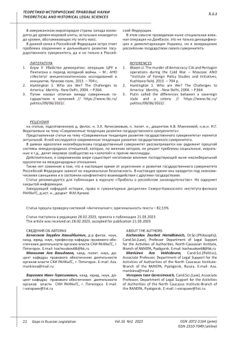 Цель исследования. В данной статье исследуется проблема государственного суверенитета. Для этого анализируются особенности современных глобализационных процессов. Цель исследования - установить, что государственный суверенитет других стран сейчас целенаправленно разрушается в интересах Соединенных Штатов, используя такое явление современной политико-правовой жизни, как глобализация. Выводы. В результате проведенного исследования авторы приходят к выводу, что стремление США к уничтожению государственного суверенитета других стран обусловлено их попытками сохранить свое мировое господство, которую они теряют. Однополярный мир становится многополярным. Специальная военная операция на Донбассе меняет современный мир в сторону осознания ценности государственного суверенитета как надежного инструмента против грабежа национального богатства стран, народов, доступа к их национальным ресурсам. В данной связи между государствами могут возникать конфликты с непредсказуемыми последствиями для человеческой цивилизации.