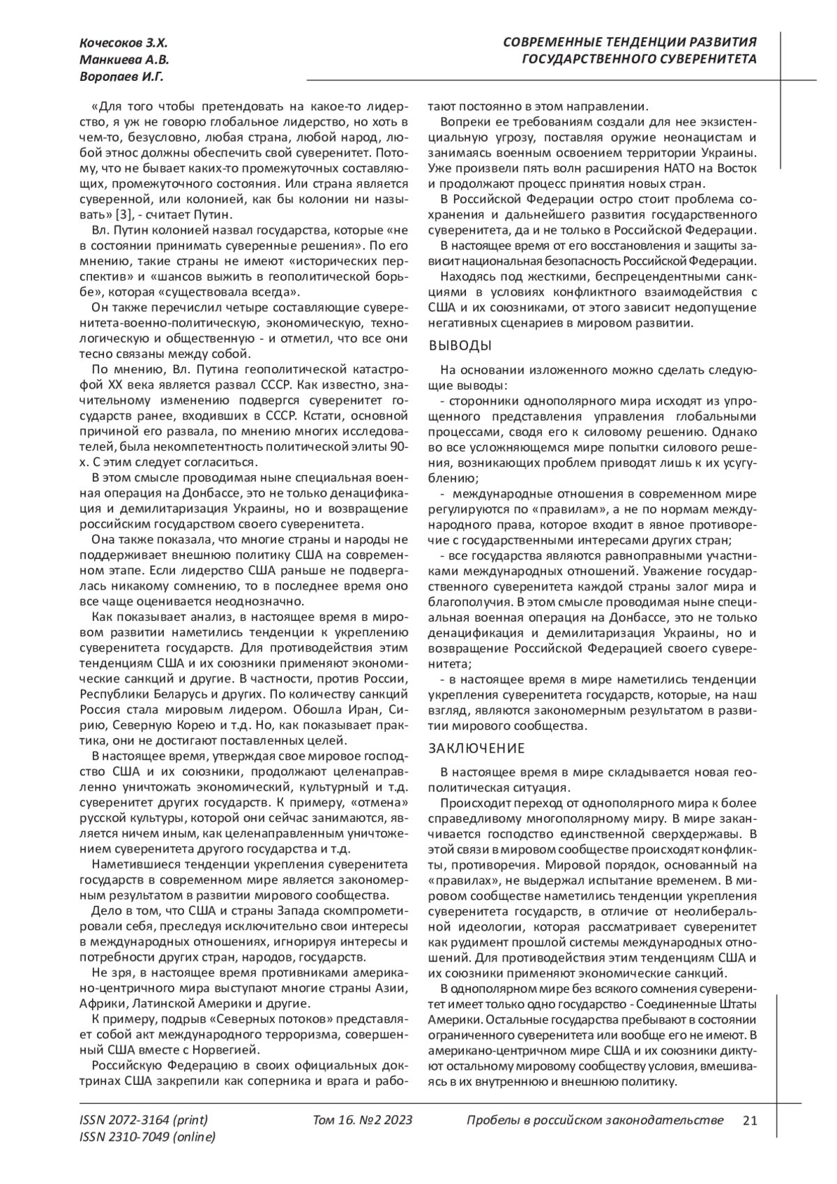 В настоящее время, утверждая свое мировое господство США и их союзники, продолжают целенаправленно уничтожать экономический, культурный и т. д. суверенитет других государств. К примеру, «отмена» русской культуры, которой они сейчас занимаются, является ничем иным, как целенаправленным уничтожением суверенитета другого государства и т. д. Наметившиеся тенденции укрепления суверенитета государств в современном мире является закономерным результатом в развитии мирового сообщества. Дело в том, что США и страны Запада скомпрометировали себя, преследуя исключительно свои интересы в международных отношениях, игнорируя интересы и потребности других стран, народов, государств.