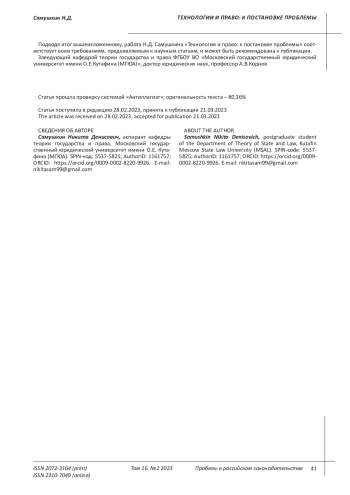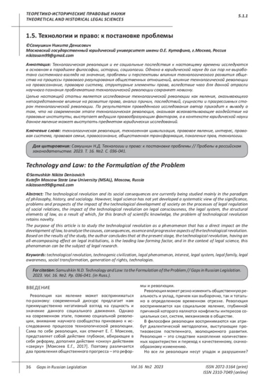 Ladenkov E.V. The influence of technological revolutions on law // Philosophy of Law. - 2022. - № 1(100). - P. 47.