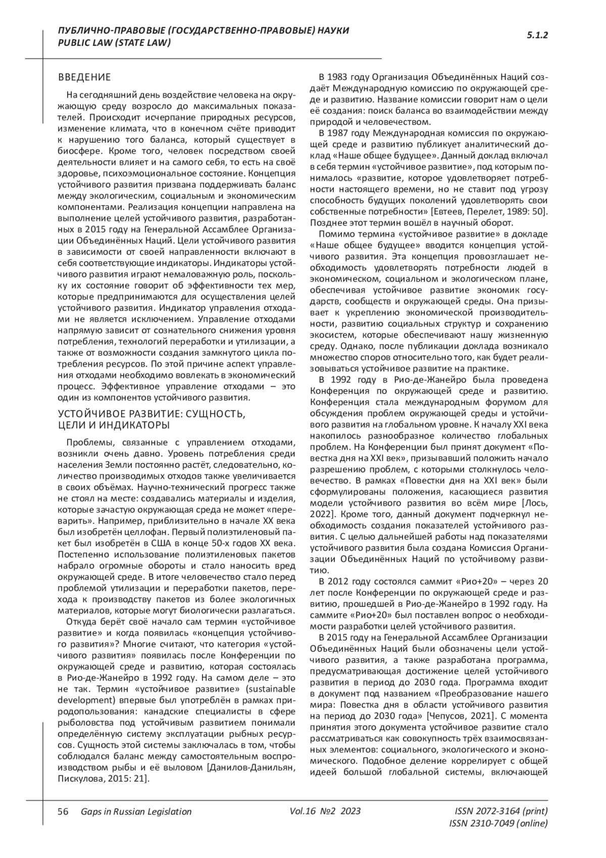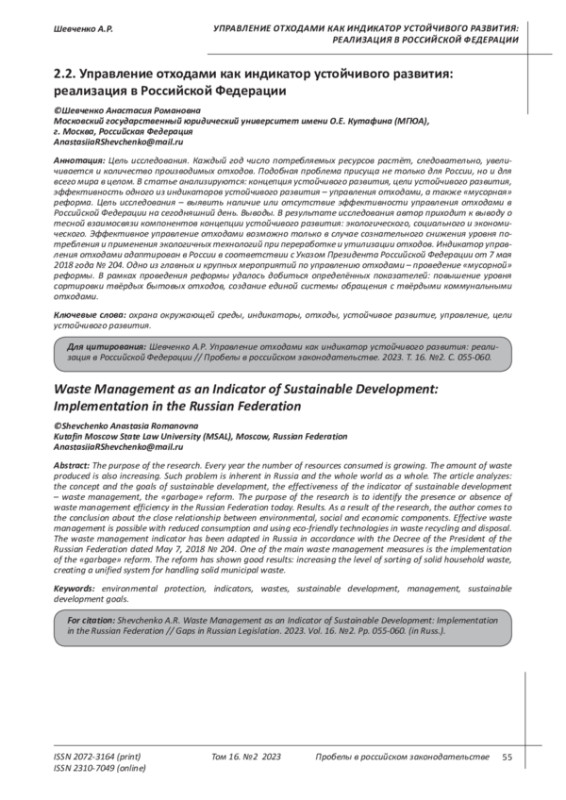 Цель исследования. Каждый год число потребляемых ресурсов растёт, следовательно, увеличивается и количество производимых отходов. Подобная проблема присуща не только для России, но и для всего мира в целом. В статье анализируются: концепция устойчивого развития, цели устойчивого развития, эффективность одного из индикаторов устойчивого развития - управления отходами, а также «мусорная» реформа. Цель исследования - выявить наличие или отсутствие эффективности управления отходами в Российской Федерации на сегодняшний день. Выводы. В результате исследования автор приходит к выводу о тесной взаимосвязи компонентов концепции устойчивого развития: экологического, социального и экономического. Эффективное управление отходами возможно только в случае сознательного снижения уровня потребления и применения экологичных технологий при переработке и утилизации отходов. Индикатор управления отходами адаптирован в России в соответствии с Указом Президента Российской Федерации от 7 мая 2018 года № 204. Одно из главных и крупных мероприятий по управлению отходами - проведение «мусорной» реформы. В рамках проведения реформы удалось добиться определённых показателей: повышение уровня сортировки твёрдых бытовых отходов, создание единой системы обращения с твёрдыми коммунальными отходами.