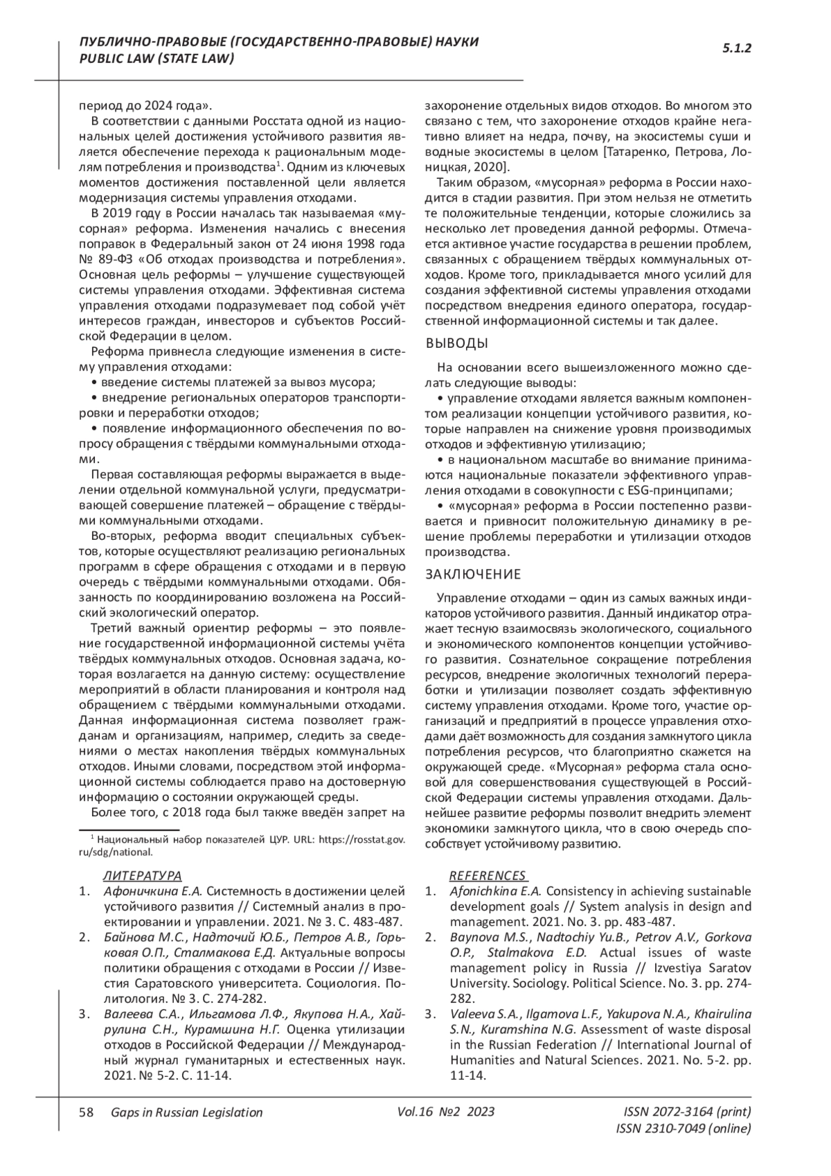 2. Байнова М.С., Надточий Ю.Б., Петров А.В., Горьковая О.П., Сталмакова Е.Д. Актуальные вопросы политики обращения с отходами в России // Известия Саратовского университета. Социология. Политология. № 3. С. 274-282. EDN: IMVYUY