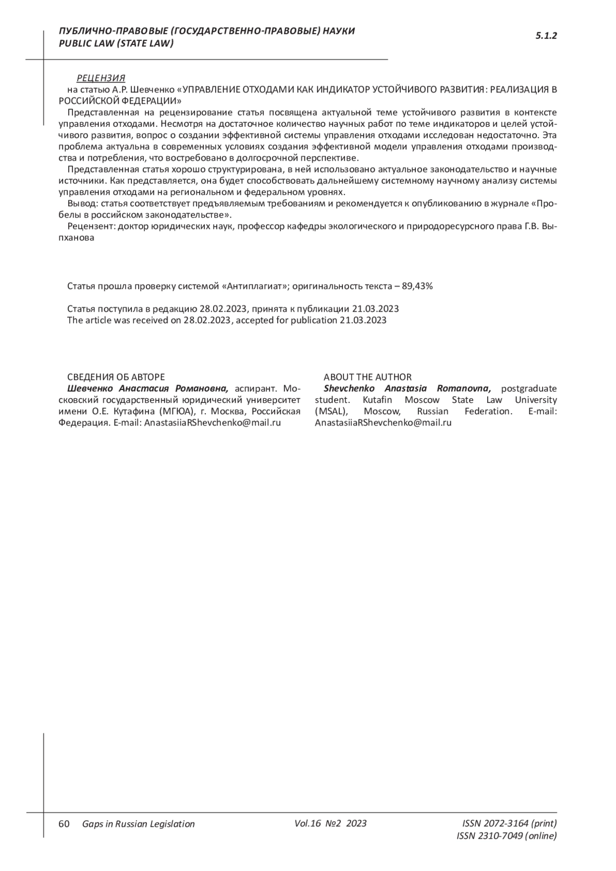 Baynova M.S., Nadtochiy Yu.B., Petrov A.V., Gorkova O.P., Stalmakova E.D. Actual issues of waste management policy in Russia // Izvestiya Saratov University. Sociology. Political Science. No. 3. pp. 274-282.