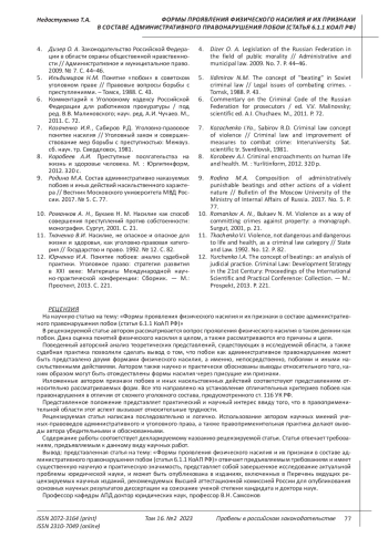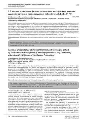 Rodina M.A. Composition of administratively punishable beatings and other actions of a violent nature // Bulletin of the Moscow University of the Ministry of Internal Affairs of Russia. 2017. No. 5. P. 77. EDN: ZQJEKP
