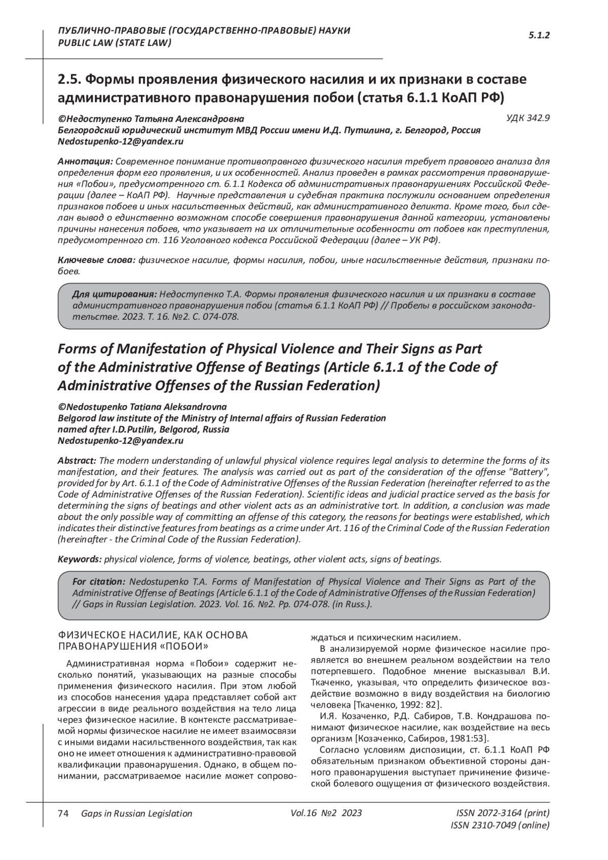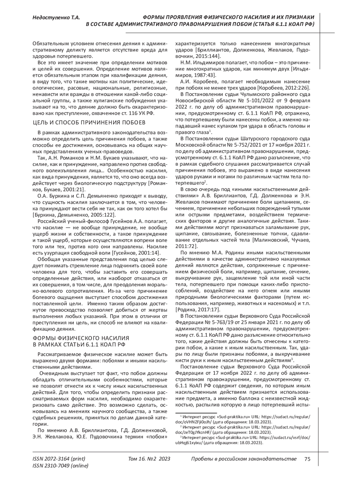 9. Родина М.А. Состав административно наказуемых побоев и иных действий насильственного характера // Вестник Московского университета МВД России. 2017. № 5. С. 77. EDN: ZQJEKP