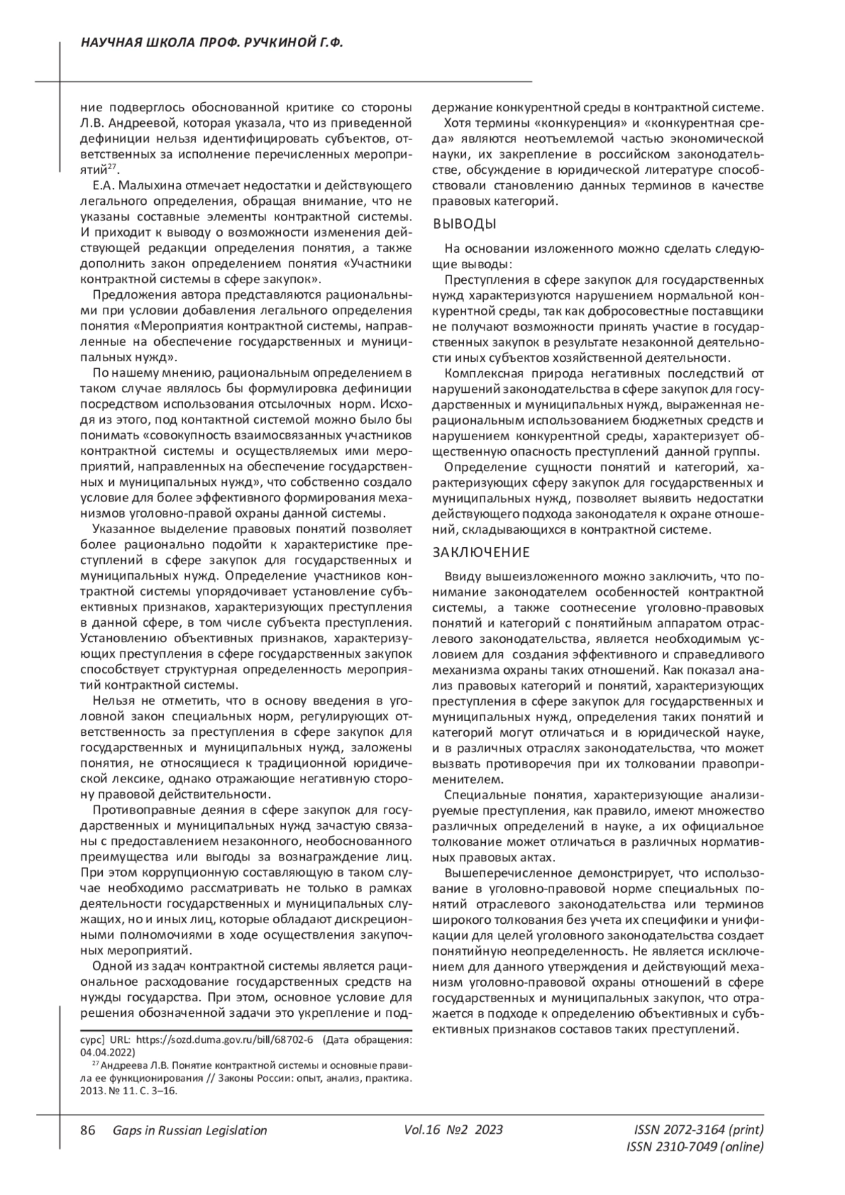 Andreeva L.V. The concept of a contract system and the basic rules of its functioning // Laws of Russia: experience, analysis, practice. 2013. № 11.