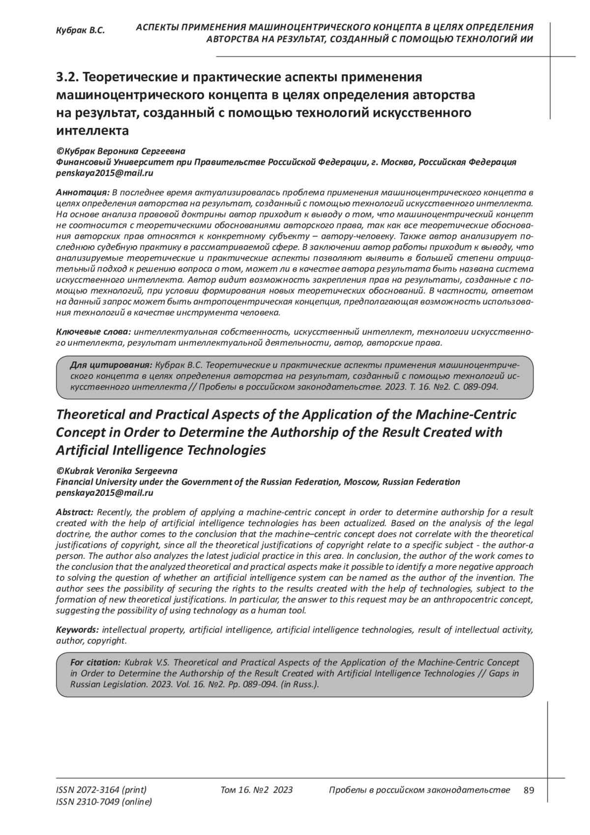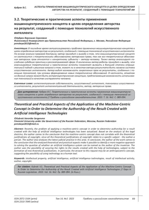 В последнее время актуализировалась проблема применения машиноцентрического концепта в целях определения авторства на результат, созданный с помощью технологий искусственного интеллекта. На основе анализа правовой доктрины автор приходит к выводу о том, что машиноцентрический концепт не соотносится с теоретическими обоснованиями авторского права, так как все теоретические обоснования авторских прав относятся к конкретному субъекту - автору-человеку. Также автор анализирует последнюю судебную практику в рассматриваемой сфере. В заключении автор работы приходит к выводу, что анализируемые теоретические и практические аспекты позволяют выявить в большей степени отрицательный подход к решению вопроса о том, может ли в качестве автора результата быть названа система искусственного интеллекта. Автор видит возможность закрепления прав на результаты, созданные с помощью технологий, при условии формирования новых теоретических обоснований. В частности, ответом на данный запрос может быть антропоцентрическая концепция, предполагающая возможность использования технологий в качестве инструмента человека.