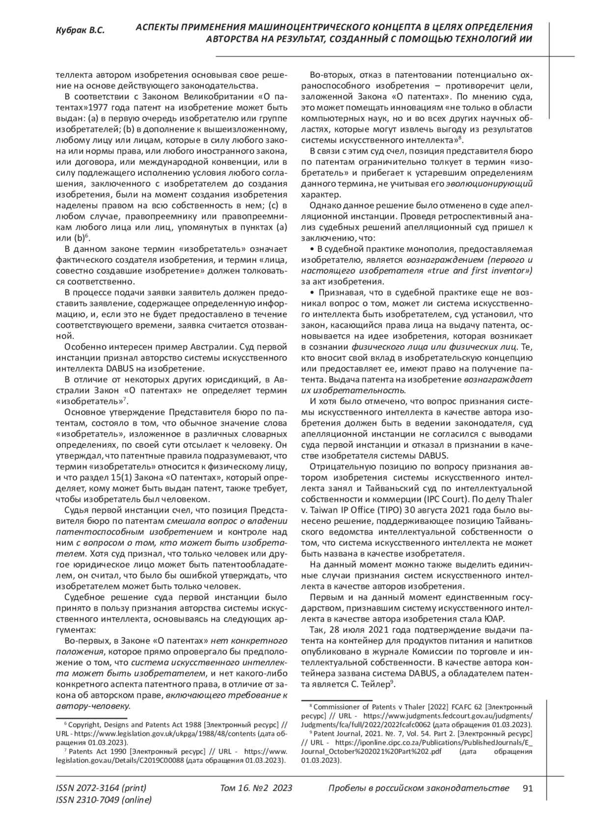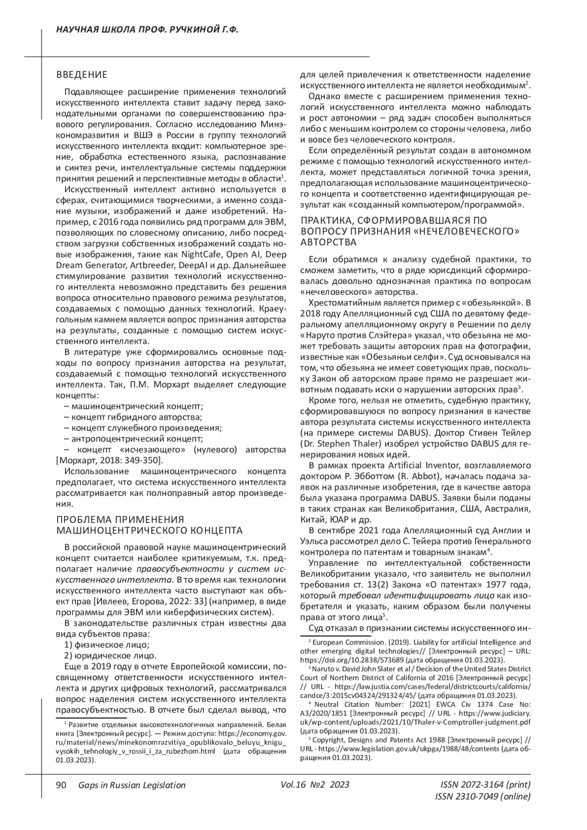 Подавляющее расширение применения технологий искусственного интеллекта ставит задачу перед законодательными органами по совершенствованию правового регулирования. Согласно исследованию Минэкономразвития и ВШЭ в России в группу технологий искусственного интеллекта входит: компьютерное зрение, обработка естественного языка, распознавание и синтез речи, интеллектуальные системы поддержки принятия решений и перспективные методы в области1. Искусственный интеллект активно используется в сферах, считающимися творческими, а именно создание музыки, изображений и даже изобретений. Например, с 2016 года появились ряд программ для ЭВМ, позволяющих по словесному описанию, либо посредством загрузки собственных изображений создать новые изображения, такие как NightCafe, Open AI, Deep Dream Generator, Artbreeder, DeepAI и др. Дальнейшее стимулирование развития технологий искусственного интеллекта невозможно представить без решения вопроса относительно правового режима результатов, создаваемых с помощью данных технологий. Краеугольным камнем является вопрос признания авторства на результаты, созданные с помощью систем искусственного интеллекта.