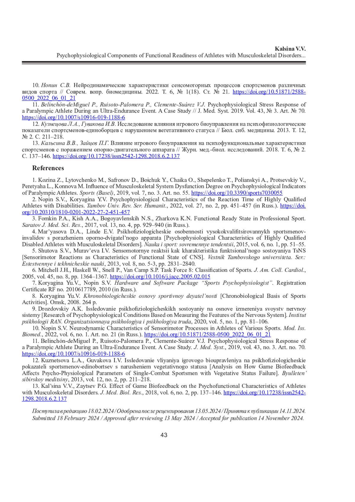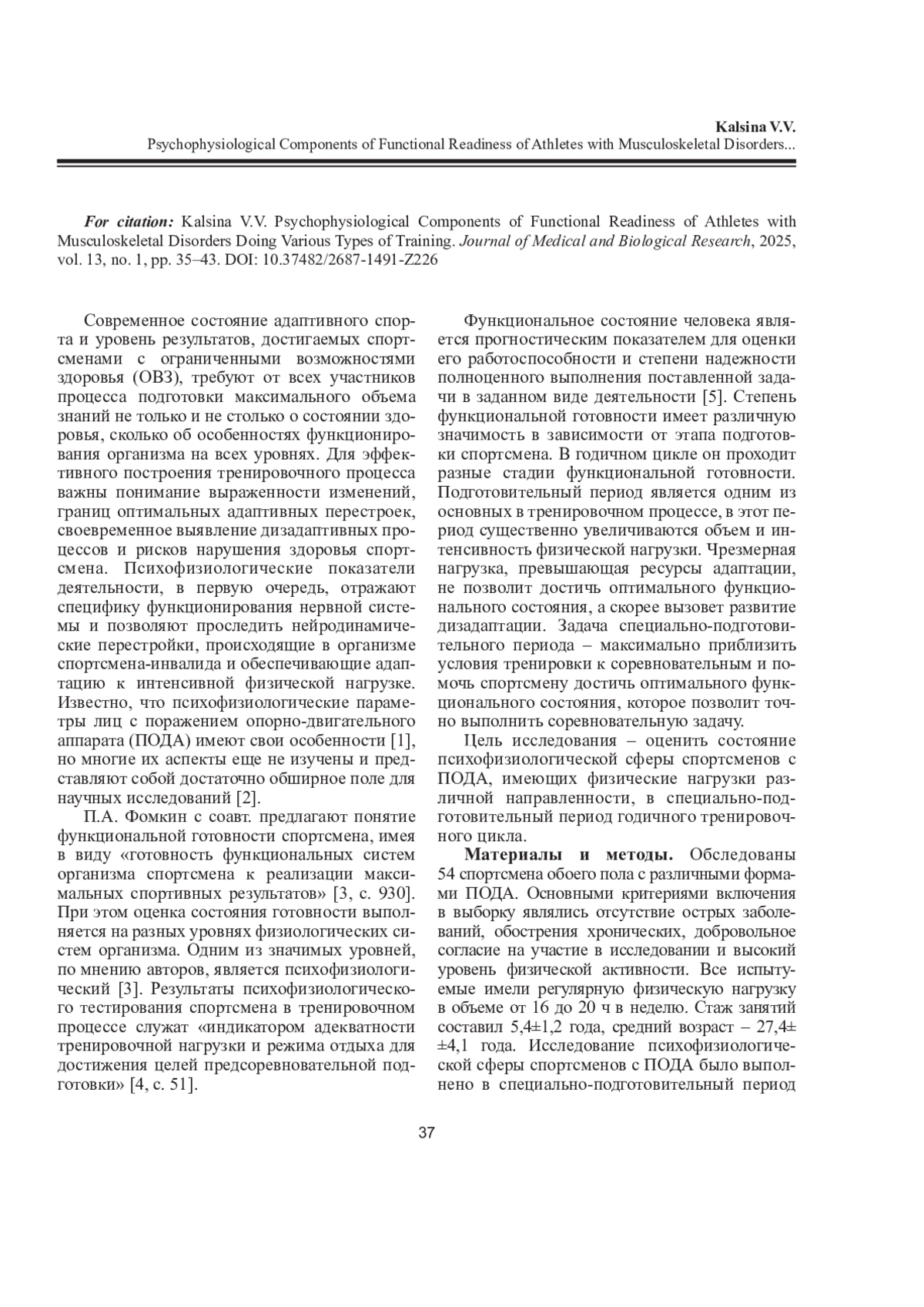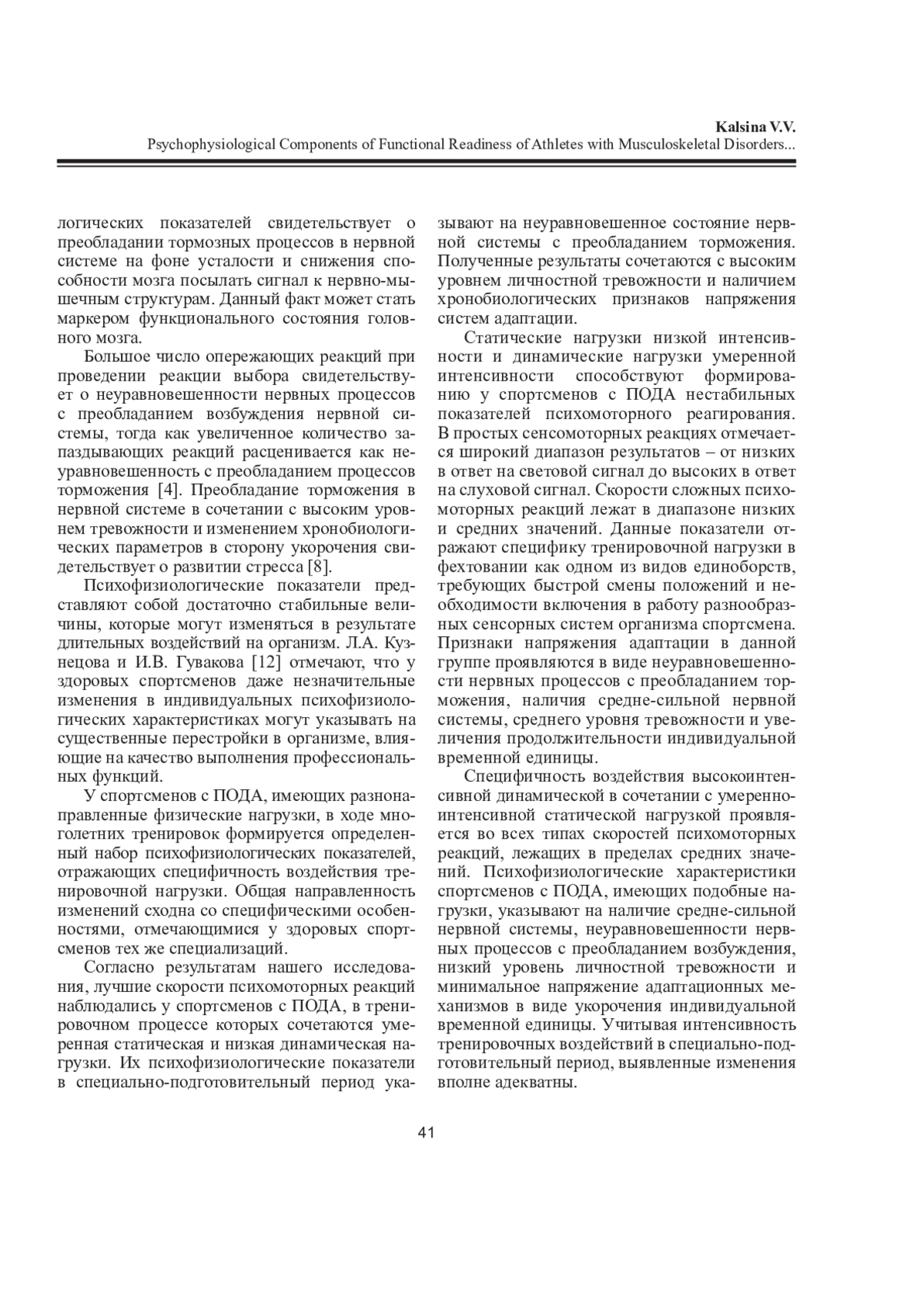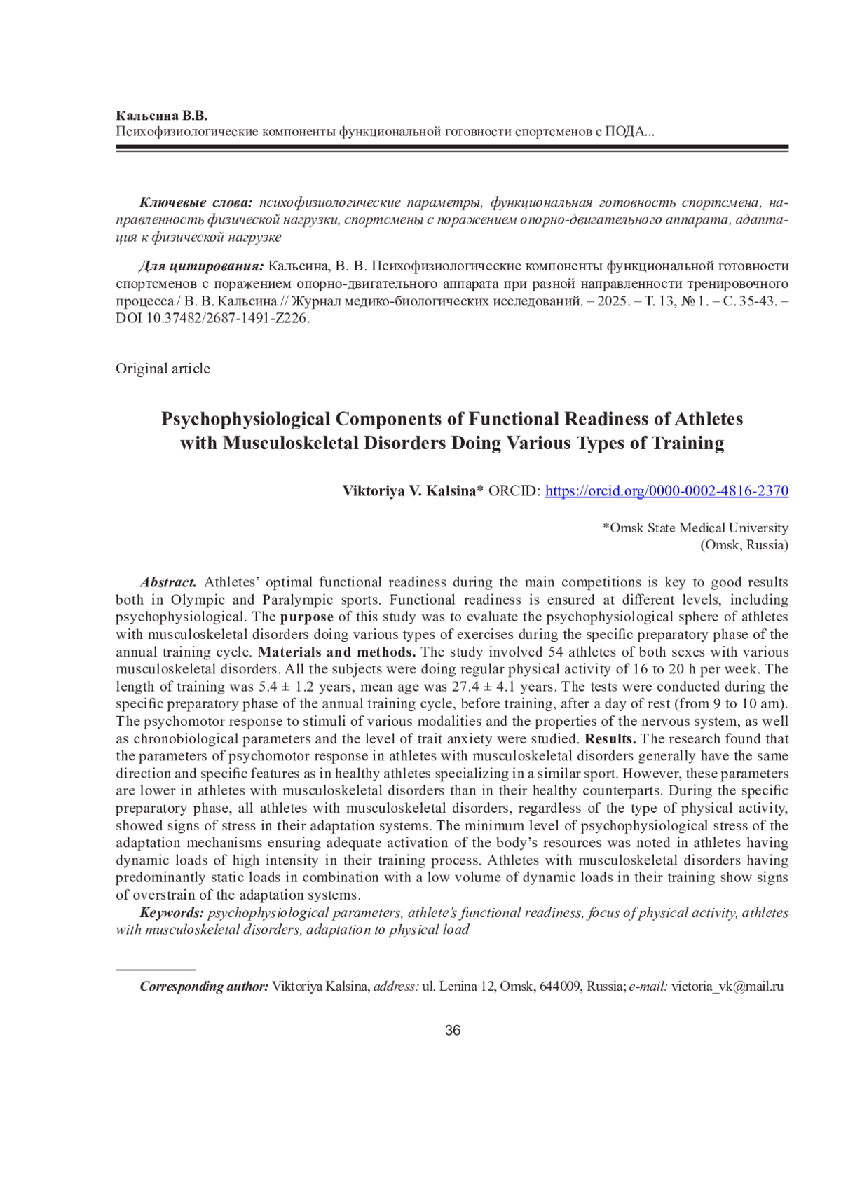 КАЛЬСИНА В. В. ПСИХОФИЗИОЛОГИЧЕСКИЕ КОМПОНЕНТЫ ФУНКЦИОНАЛЬНОЙ ГОТОВНОСТИ СПОРТСМЕНОВ С ПОРАЖЕНИЕМ ОПОРНО-ДВИГАТЕЛЬНОГО АППАРАТА ПРИ РАЗНОЙ НАПРАВЛЕННОСТИ ТРЕНИРОВОЧНОГО ПРОЦЕССА // ЖУРНАЛ МЕДИКО-БИОЛОГИЧЕСКИХ ИССЛЕДОВАНИЙ. 2025. Т. 13 № 1