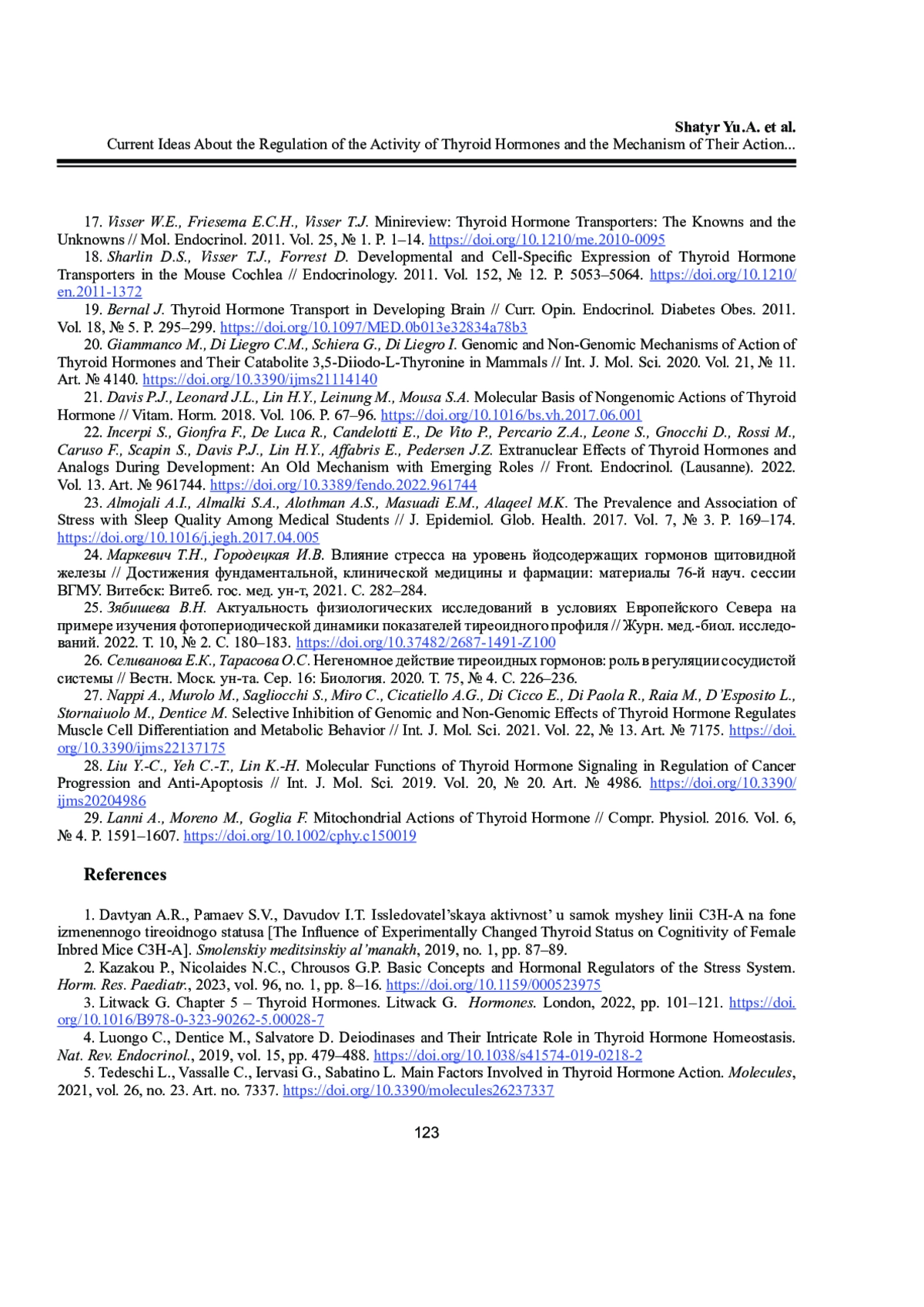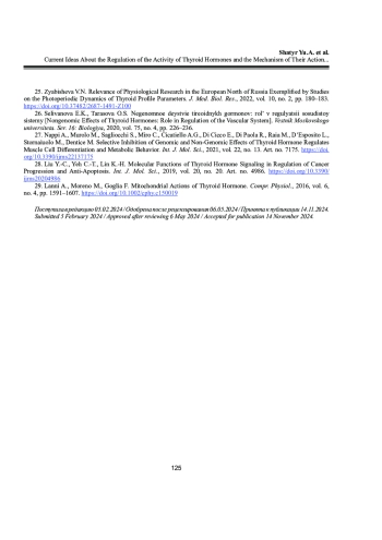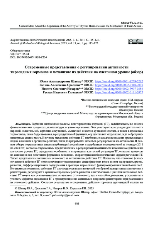 ШАТЫР Ю. А., СРОСЛОВА Г. А., НАЗАРОВ Н. О., ГЛУШАКОВ Р. И. СОВРЕМЕННЫЕ ПРЕДСТАВЛЕНИЯ О РЕГУЛИРОВАНИИ АКТИВНОСТИ ТИРЕОИДНЫХ ГОРМОНОВ И МЕХАНИЗМЕ ИХ ДЕЙСТВИЯ НА КЛЕТОЧНОМ УРОВНЕ (ОБЗОР) // ЖУРНАЛ МЕДИКО-БИОЛОГИЧЕСКИХ ИССЛЕДОВАНИЙ. 2025. Т. 13 № 1