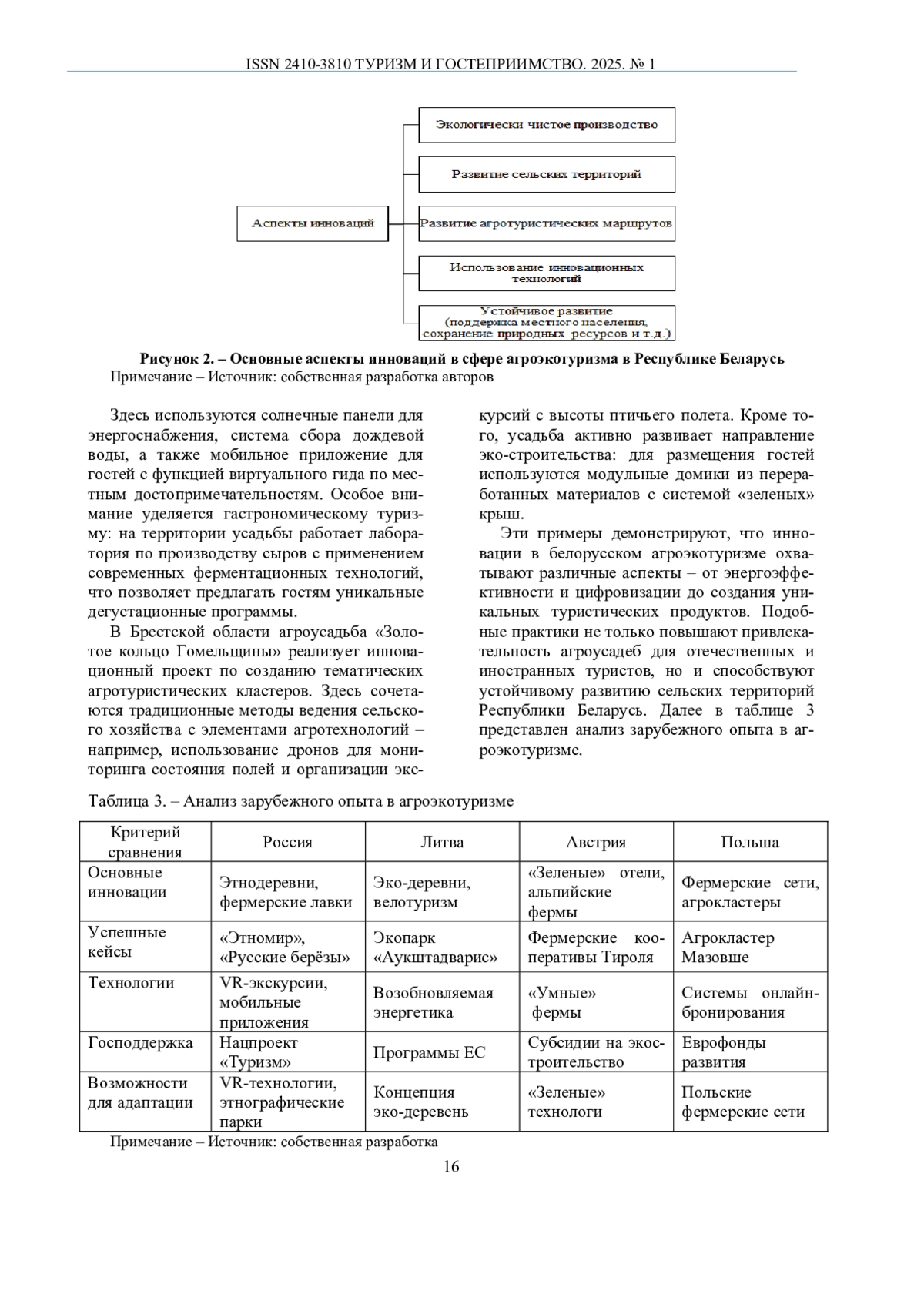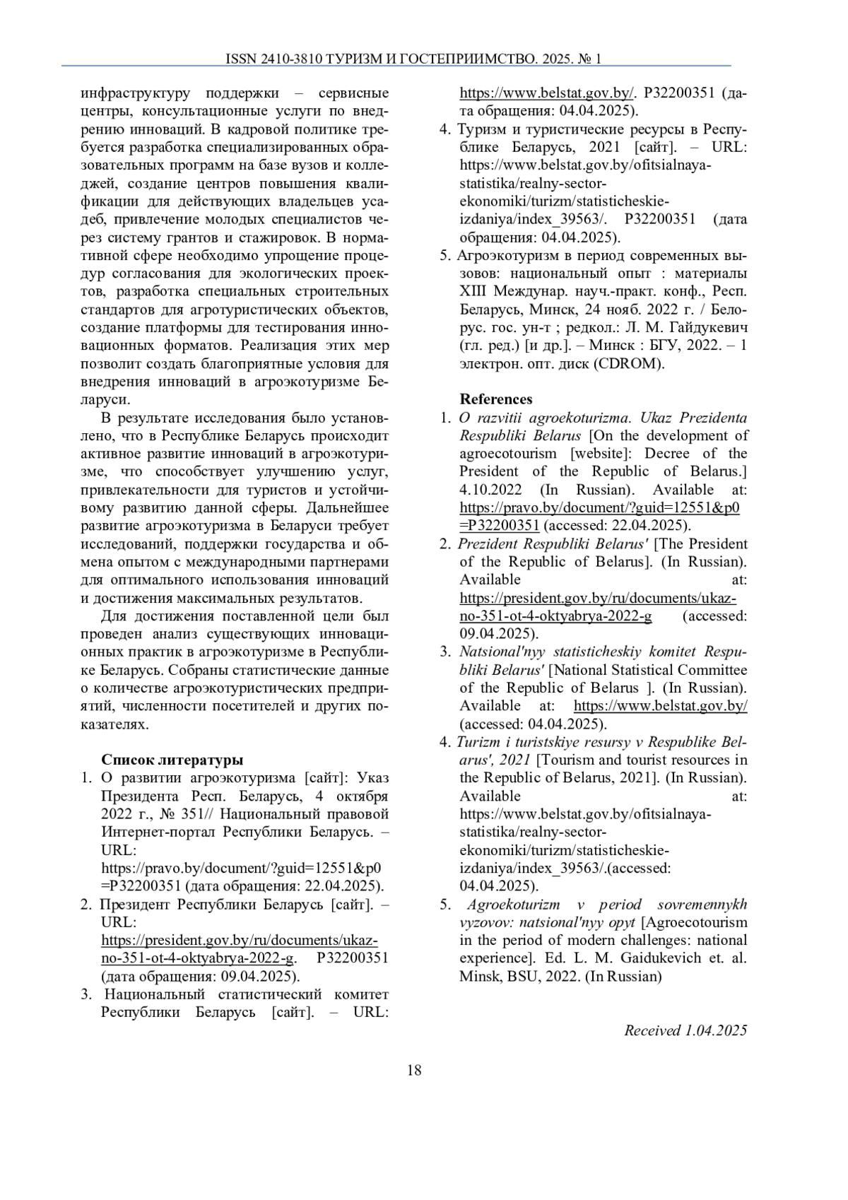 Научная статья посвящена исследованию имплементации инноваций в сфере агроэкотуризма в Республике Беларусь. Целью исследования является анализ существующих инновационных подходов и технологий, применяемых в развитии агроэкотуризма в стране, а также определение их влияния на экономику, устойчивое развитие и привлекательность данного сектора. В работе используются статистические данные и аналитические методы. В результате анализа выявления тенденции развития динамики ключевых показателей в агроэкотуризме в Республике Беларусь за 2020-2023 гг. приведено число субъектов агроэкотуризма по областям в 2024 г., проведен SWOTанализ развития агроэкотуризма в Республике Беларусь, предложены основные аспекты инноваций в сфере агроэкотуризма в Республике Беларусь, проведен анализ зарубежного опыта в агроэкотуризме. В результате исследования выялены основные препятствия для внедрения инноваций в агроэкотуризм Республики Беларусь, предложены меры по их преодолению. В результате исследования было установлено, что в Республике Беларусь происходит активное развитие инноваций в агроэкотуризме, что способствует улучшению услуг, привлекательности для туристов и устойчивому развитию данной сферы.