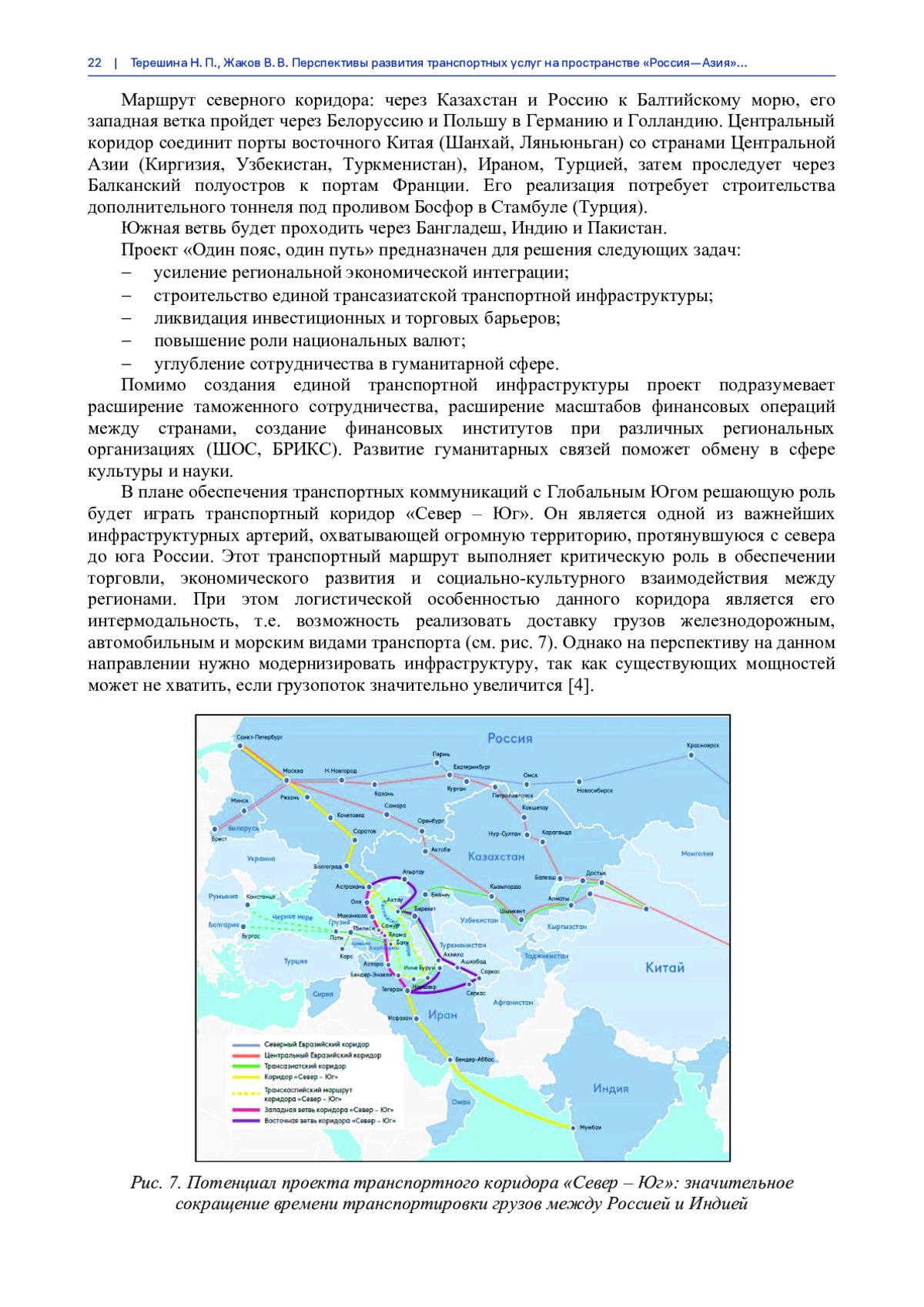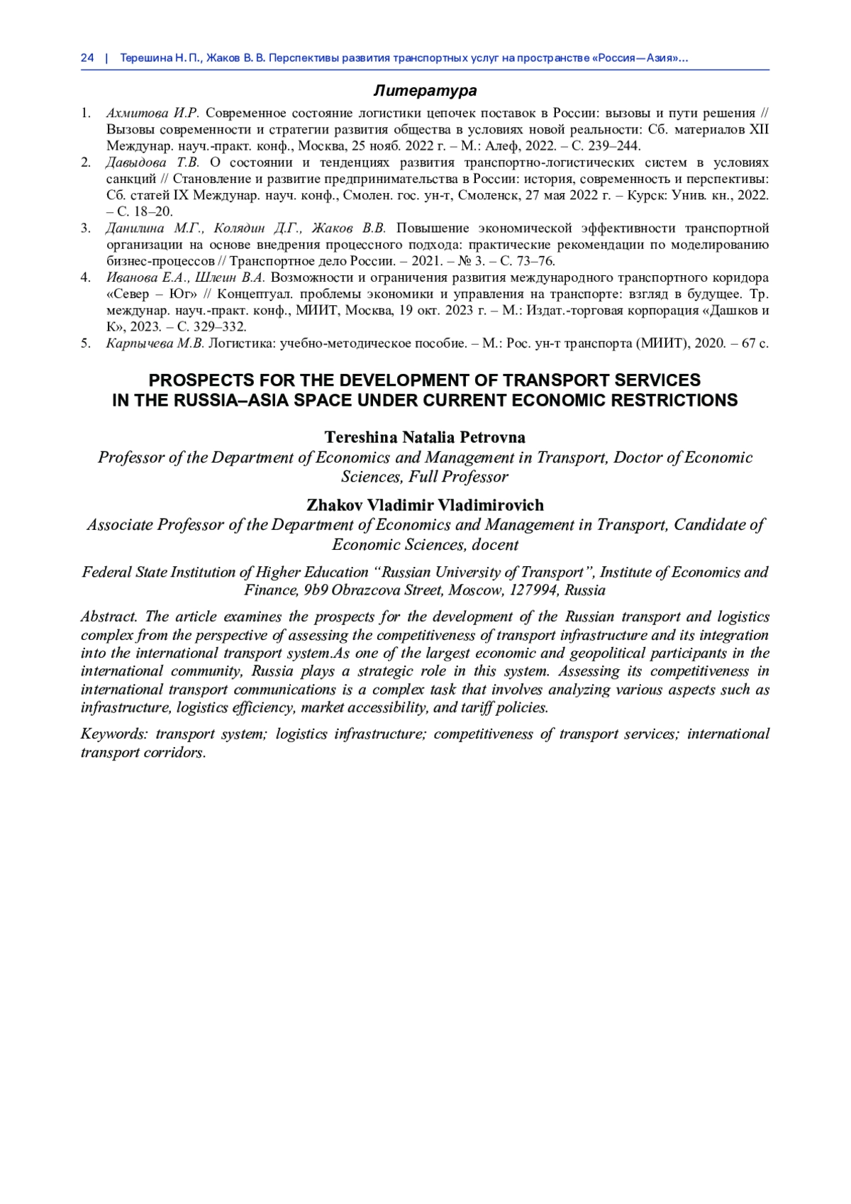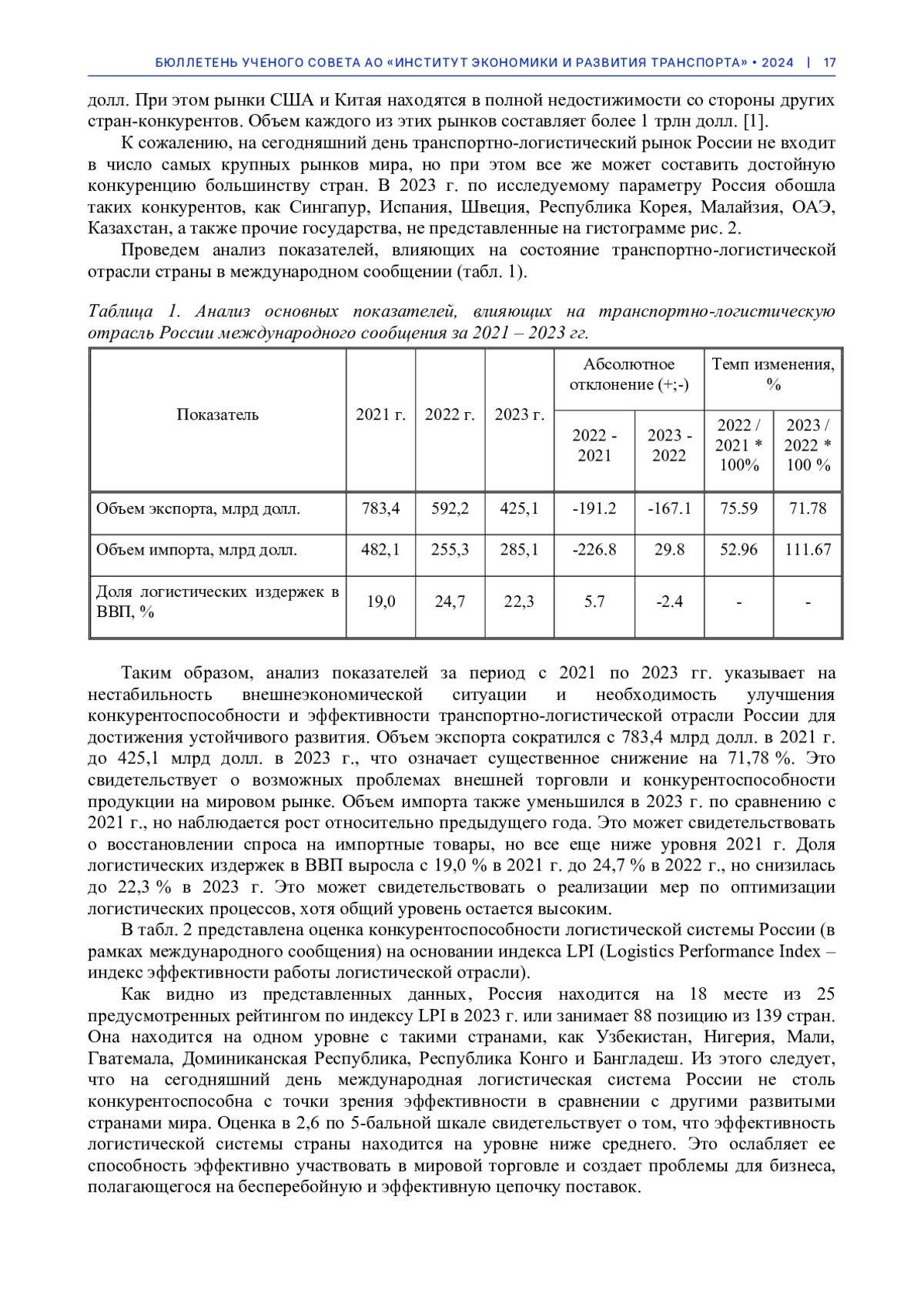 В статье рассмотрены перспективы развития транспортно-логистического комплекса Российской Федерации с позиции оценки уровня конкурентоспособности возможностей транспортной инфраструктуры и ее интеграции в международную транспортную систему. Россия как один из крупнейших экономических и геополитических участников международного сообщества играет стратегическую роль в этой системе. Оценка ее конкурентоспособности в международном транспортном сообщении представляет собой сложную задачу, включающую в себя анализ различных аспектов, таких как инфраструктура, эффективность логистики, доступность рынков и тарифные политики.