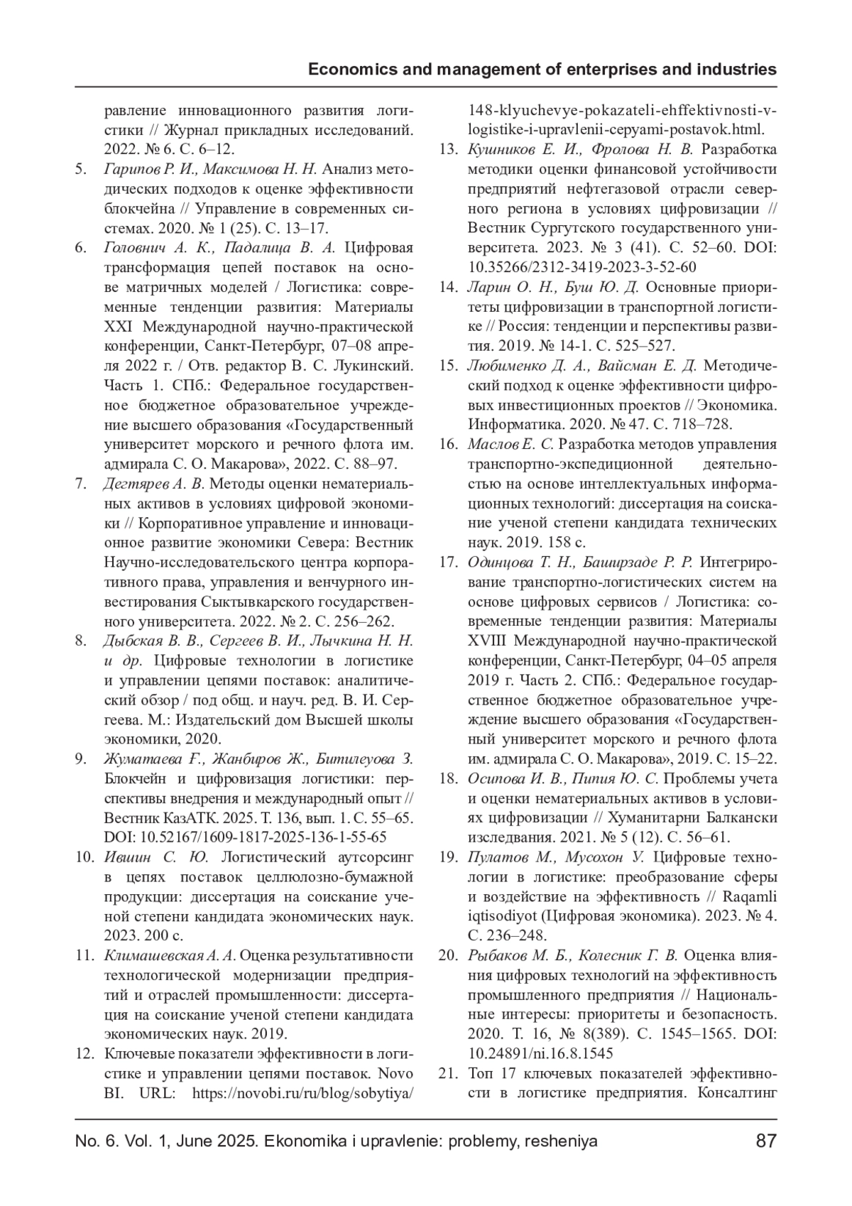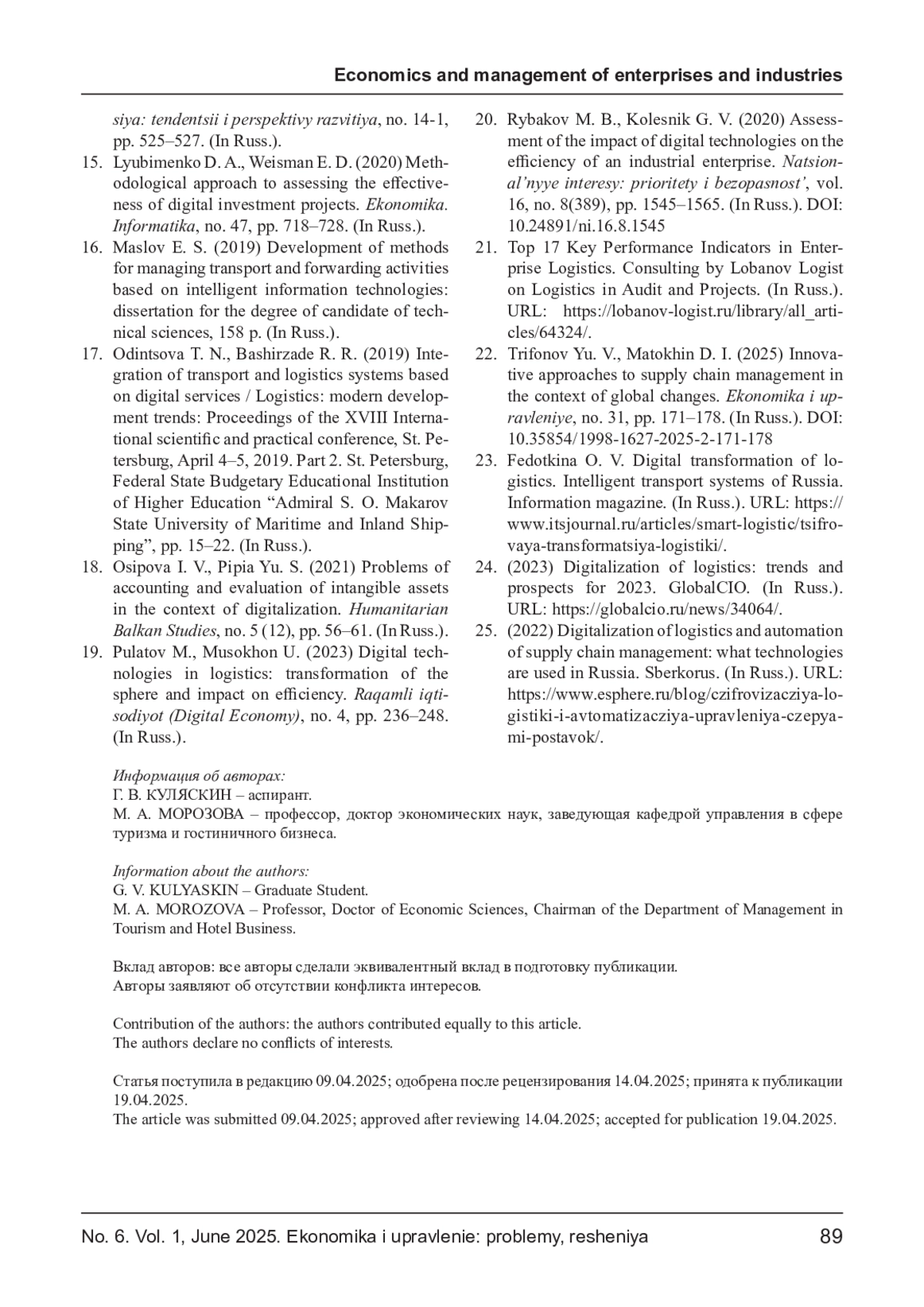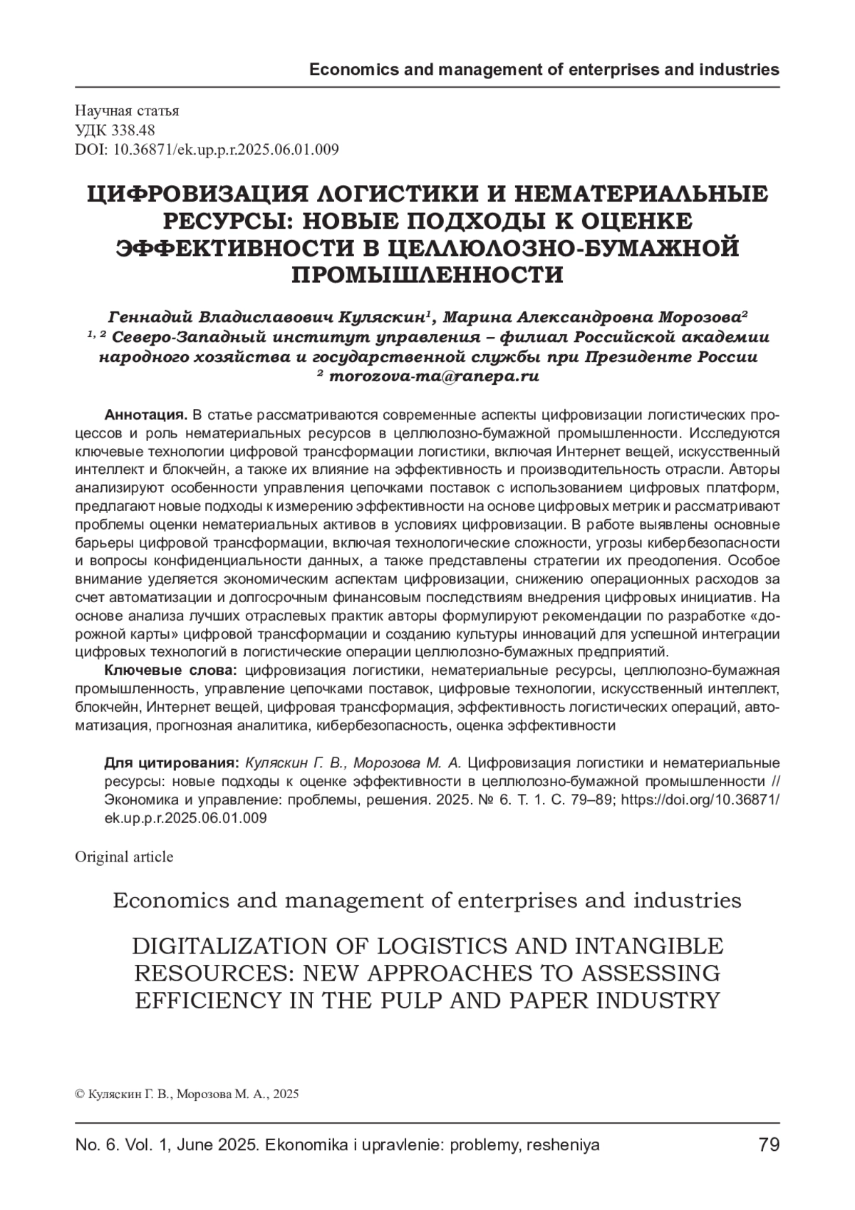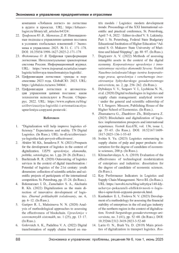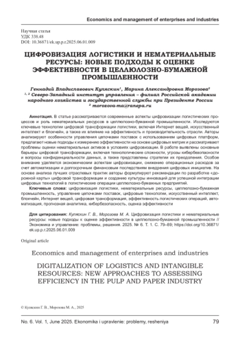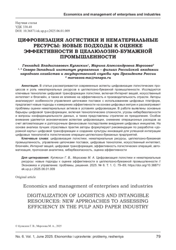КУЛЯСКИН Г. В., МОРОЗОВА М. А. ЦИФРОВИЗАЦИЯ ЛОГИСТИКИ И НЕМАТЕРИАЛЬНЫЕ РЕСУРСЫ: НОВЫЕ ПОДХОДЫ К ОЦЕНКЕ ЭФФЕКТИВНОСТИ В ЦЕЛЛЮЛОЗНО-БУМАЖНОЙ ПРОМЫШЛЕННОСТИ // ЭКОНОМИКА И УПРАВЛЕНИЕ: ПРОБЛЕМЫ, РЕШЕНИЯ. 2025. ТОМ 1 № 6