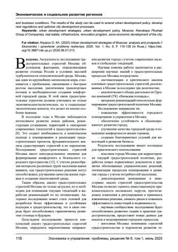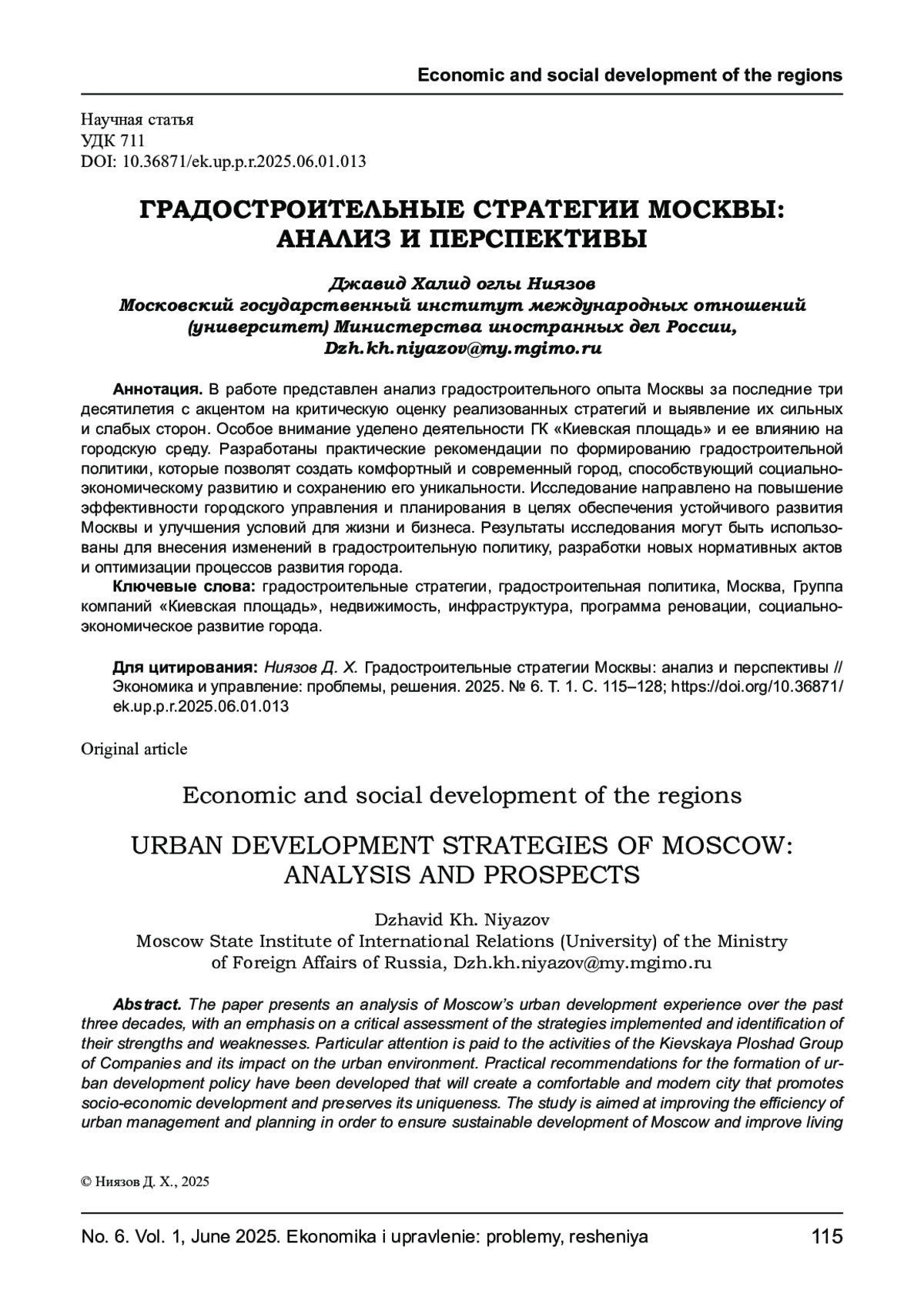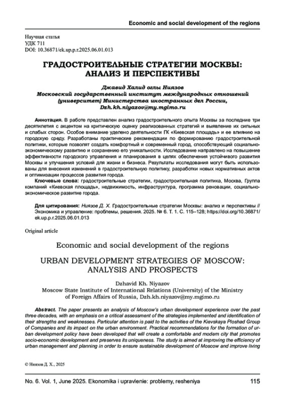 В работе представлен анализ градостроительного опыта Москвы за последние три десятилетия с акцентом на критическую оценку реализованных стратегий и выявление их сильных и слабых сторон. Особое внимание уделено деятельности ГК «Киевская площадь» и ее влиянию на городскую среду. Разработаны практические рекомендации по формированию градостроительной политики, которые позволят создать комфортный и современный город, способствующий социально-экономическому развитию и сохранению его уникальности. Исследование направлено на повышение эффективности городского управления и планирования в целях обеспечения устойчивого развития Москвы и улучшения условий для жизни и бизнеса. Результаты исследования могут быть использованы для внесения изменений в градостроительную политику, разработки новых нормативных актов и оптимизации процессов развития города.