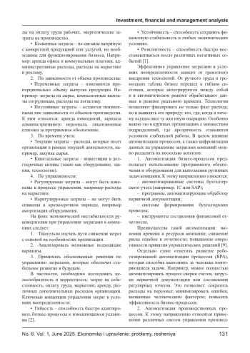 В условиях растущей нестабильности глобальной экономической и политической среды эффективное управление затратами становится главным фактором успешного развития компании. Авторы настоящей статьи отмечают, что современные цифровые решения позволяют детально анализировать структуру затрат, выявлять скрытые расходы и предлагать пути их оптимизации. В статье указаны преимущества и недостатки влияния автоматизации процессов, а также цифровизации данных на управление затратами компаний. Особое внимание уделено современным методам управления затратами, таким как АВС-анализ, бережливое производство и кайзен-костинг. Приведены практические примеры, иллюстрирующие адаптацию российских компаний к современным вызовам. Авторы систематизируют направления, которые должны быть включены в стратегию управления затратами компании. Это позволит компаниям получить конкурентное преимущество, повысить устойчивость к внешним шокам и успешно развиваться даже в условиях экономической нестабильности.