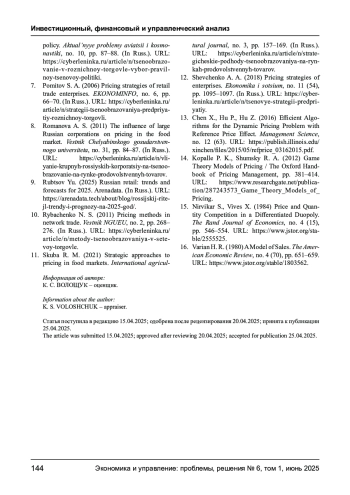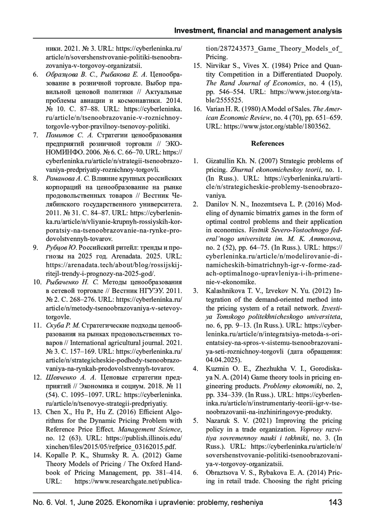 1. Гизатуллин Х. Н. Стратегические проблемы ценообразования // Журнал экономической теории. 2007. № 1. URL: https://cyberleninka.ru/article/n/strategicheskie-problemy-tsenoobrazovaniya. EDN: KYYEHP