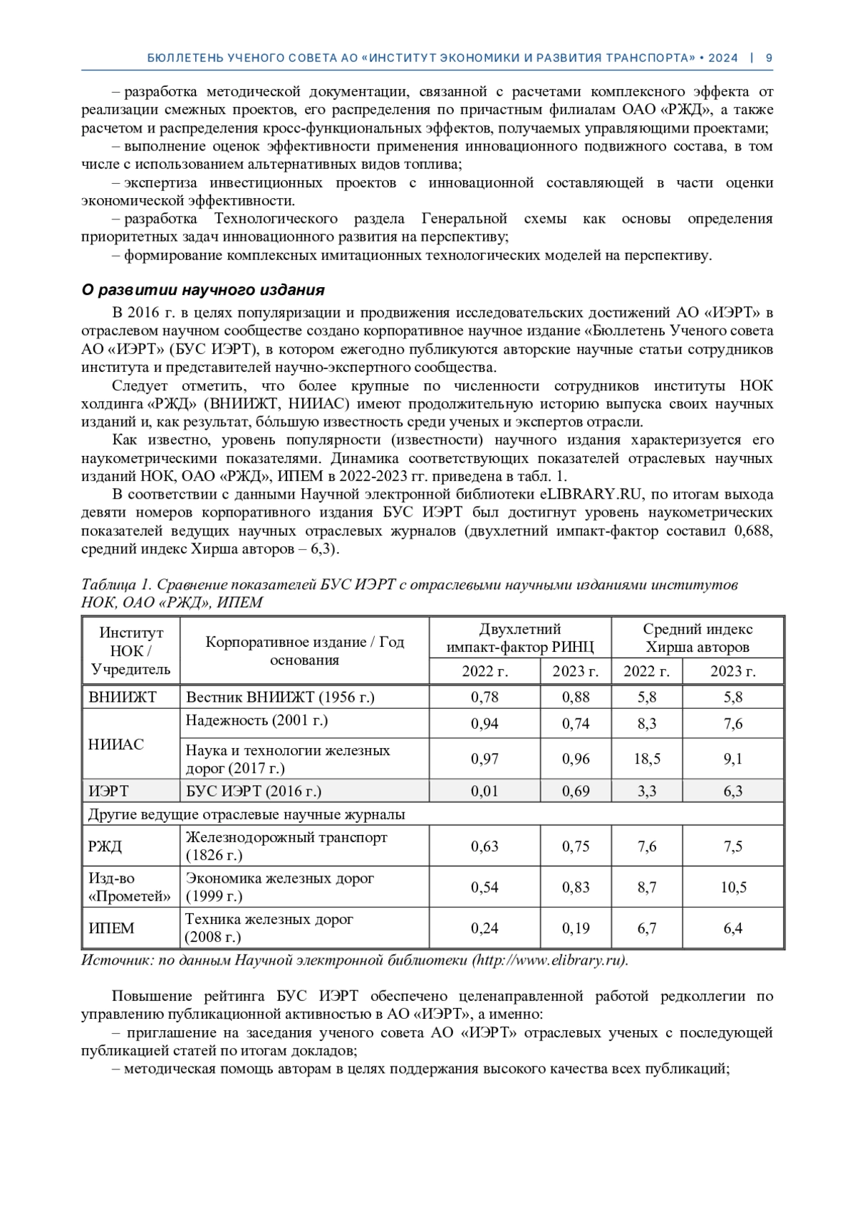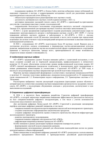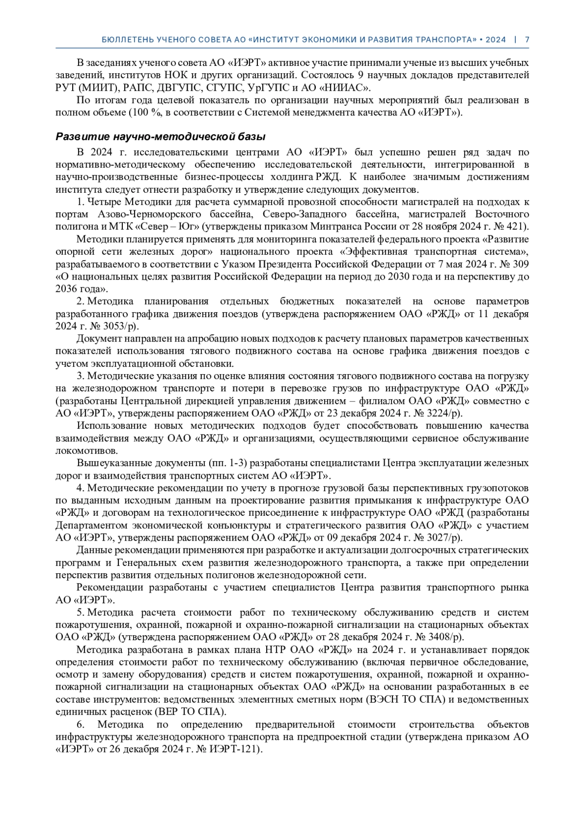 В статье отражены результаты развития научной сферы АО «ИЭРТ» в 2024 г., включая развитие методического и цифрового инструментария, деятельности ученого совета, сотрудничества с научными партнерами, расширение направлений подготовки кадров высшей квалификации и др. Освещена целенаправленная работа, благодаря которой корпоративное издание «Бюллетень ученого совета АО «ИЭРТ» в 2024 г. достигло уровня наукометрических показателей ведущих отраслевых научных журналов (двухлетний импакт-фактор составил 0,69).