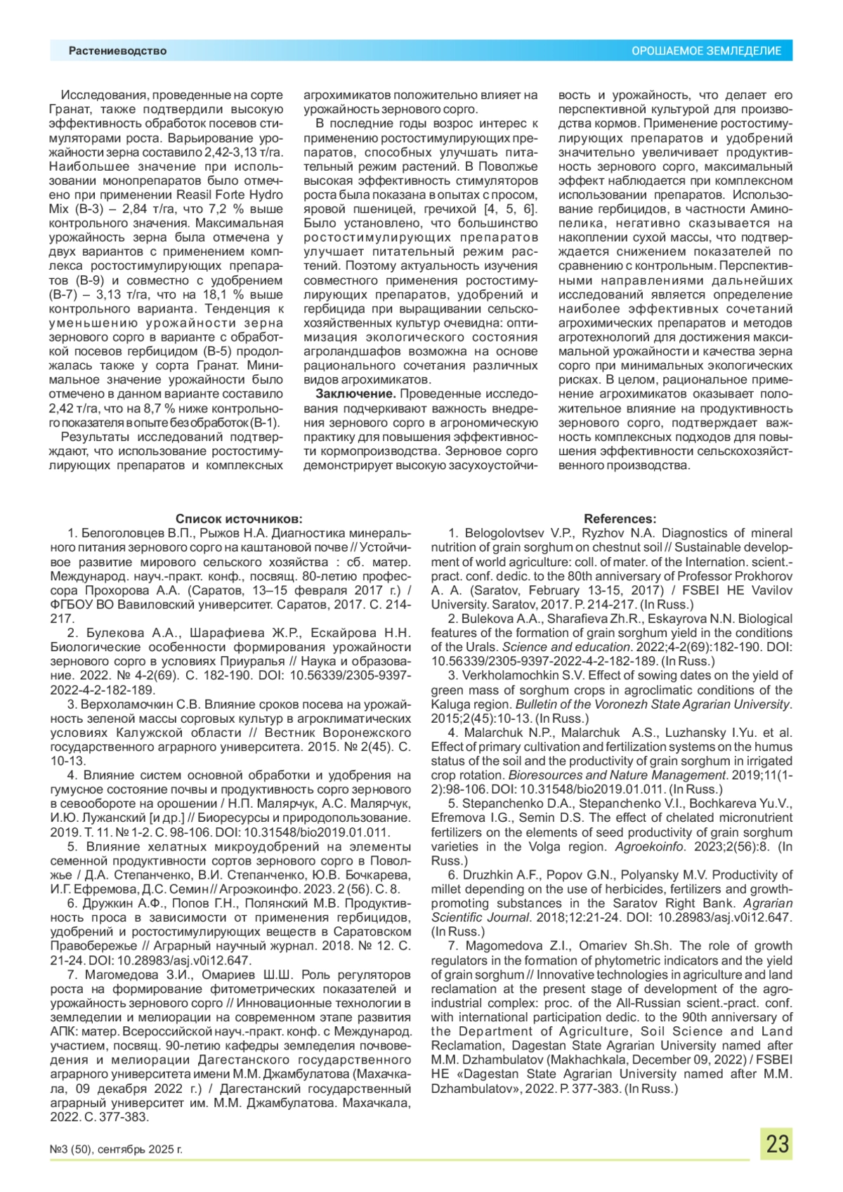 Применение современных агрохимикатов (пестициды, гербициды, удобрения и другие агрохимические препараты), направленное на получение высоких урожаев сельскохозяйственных культур и защиту культур, в настоящее время является чрезвычайно важным вопросом в агрономии. В задачи исследований входила оценка влияния различных агрохимикатов на рост и развитие зернового сорго, урожайность и качество зерна зернового сорго. Материалы и методы. Исследования проводились в Гагаринском районе Саратовской области на черноземе южном в 2021-2023 гг. Почва представлена черноземом южным маломощным, среднесуглинистым, типичным для сухих черноземных степей Юго-Востока России. Результаты и выводы. Было установлено положительное влияние ростостимулирующих препаратов и удобрений на морфометрические показатели зернового сорго по сравнению с контрольным вариантом. Обработка агрохимикатами способствовала ускорению ростовых процессов и увеличению вегетационной массы. Максимальные показатели увеличения урожайности биомассы и зерна были выявлены на вариантах с внесением ростостимулирующих препаратов. Установлено, что раздельное и совместное применение минеральных удобрений, ростовых препаратов и гербицида Аминопелик существенно повлияли на продуктивность зернового сорго. В среднем в 2021-2023 гг. высокая урожайность зерна была достигнута благодаря применению комплекса агрохимических препаратов в период вегетации растений. Разовое применение агрохимикатов способствовало увеличение урожайности зерна сорго на 7-10 %, комплексное применение увеличило урожайность зерна на 16-18 % по сравнению с контрольным вариантом. В целом, результаты исследований подчеркивают важность применения комплексных агрохимических препаратов для повышения урожайности зернового сорго в условиях Саратовской области на черноземе южном.