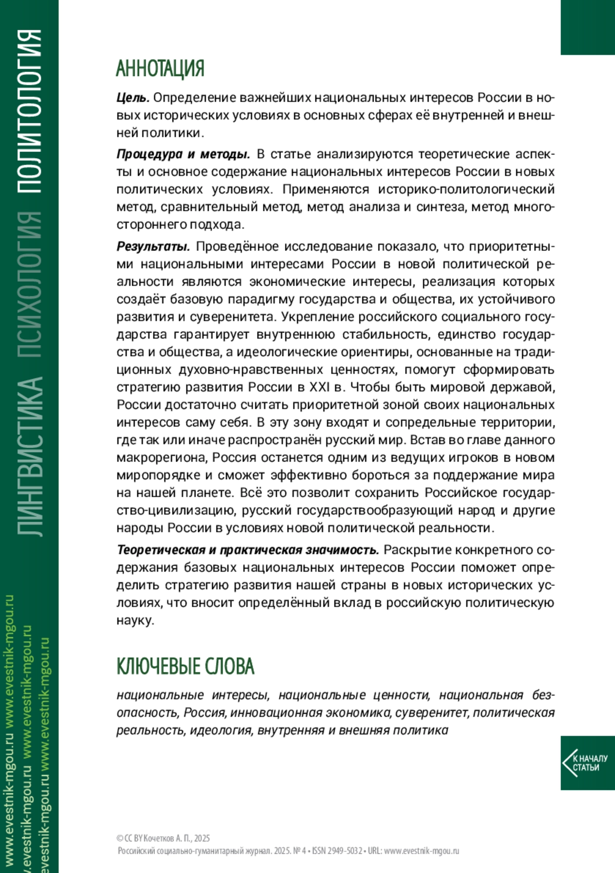 Процедура и методы. В статье анализируются теоретические аспекты и основное содержание национальных интересов России в новых политических условиях. Применяются историко-политологический метод, сравнительный метод, метод анализа и синтеза, метод многостороннего подхода.