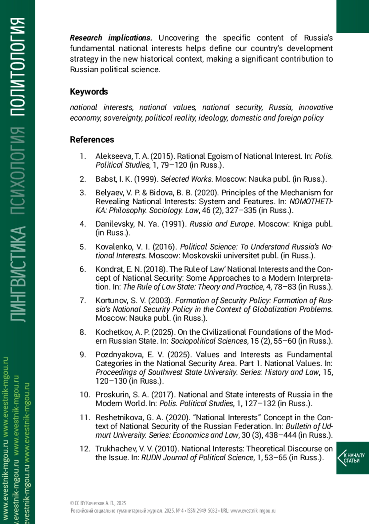 Результаты. Проведённое исследование показало, что приоритетными национальными интересами России в новой политической реальности являются экономические интересы, реализация которых создаёт базовую парадигму государства и общества, их устойчивого развития и суверенитета. Укрепление российского социального государства гарантирует внутреннюю стабильность, единство государства и общества, а идеологические ориентиры, основанные на традиционных духовно-нравственных ценностях, помогут сформировать стратегию развития России в ХХI в. Чтобы быть мировой державой, России достаточно считать приоритетной зоной своих национальных интересов саму себя. В эту зону входят и сопредельные территории, где так или иначе распространён русский мир. Встав во главе данного макрорегиона, Россия останется одним из ведущих игроков в новом миропорядке и сможет эффективно бороться за поддержание мира на нашей планете. Всё это позволит сохранить Российское государство-цивилизацию, русский государствообразующий народ и другие народы России в условиях новой политической реальности.