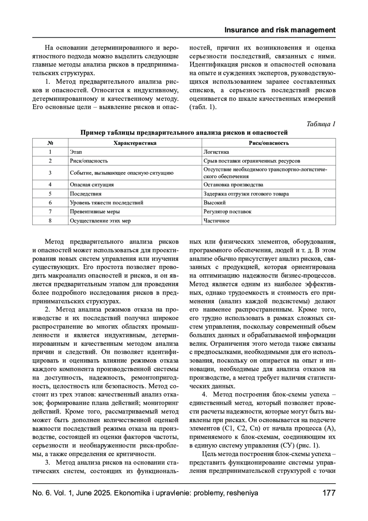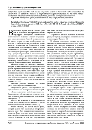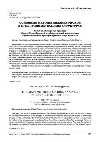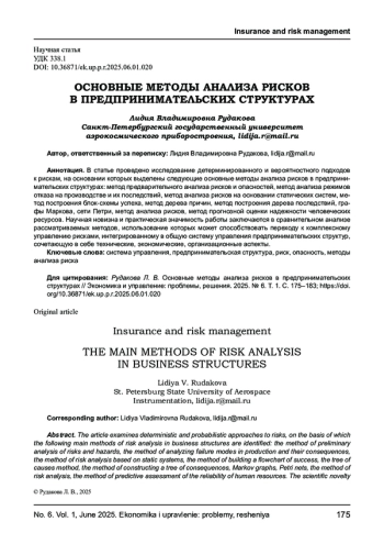 В статье проведено исследование детерминированного и вероятностного подходов к рискам, на основании которых выделены следующие основные методы анализа рисков в предпринимательских структурах: метод предварительного анализа рисков и опасностей, метод анализа режимов отказа на производстве и их последствий, метод анализа рисков на основании статических систем, метод построения блок-схемы успеха, метод дерева причин, метод построения дерева последствий, графы Маркова, сети Петри, метод анализа рисков, метод прогнозной оценки надежности человеческих ресурсов. Научная новизна и практическая значимость работы заключаются в сравнительном анализе рассматриваемых методов, использование которых может способствовать переходу к комплексному управлению рисками, интегрированному в общую систему управления предпринимательских структур, сочетающую в себе технические, экономические, организационные аспекты.