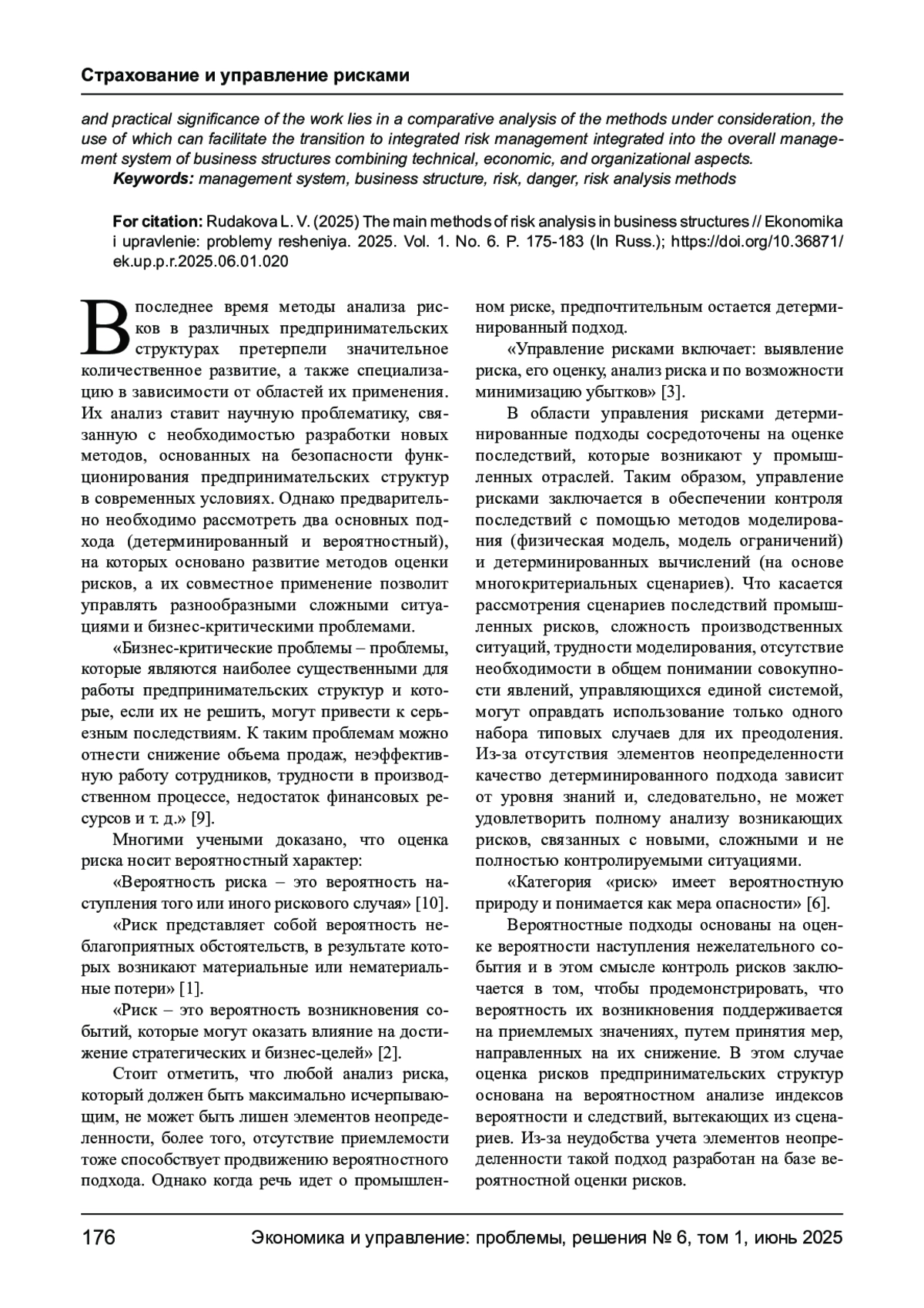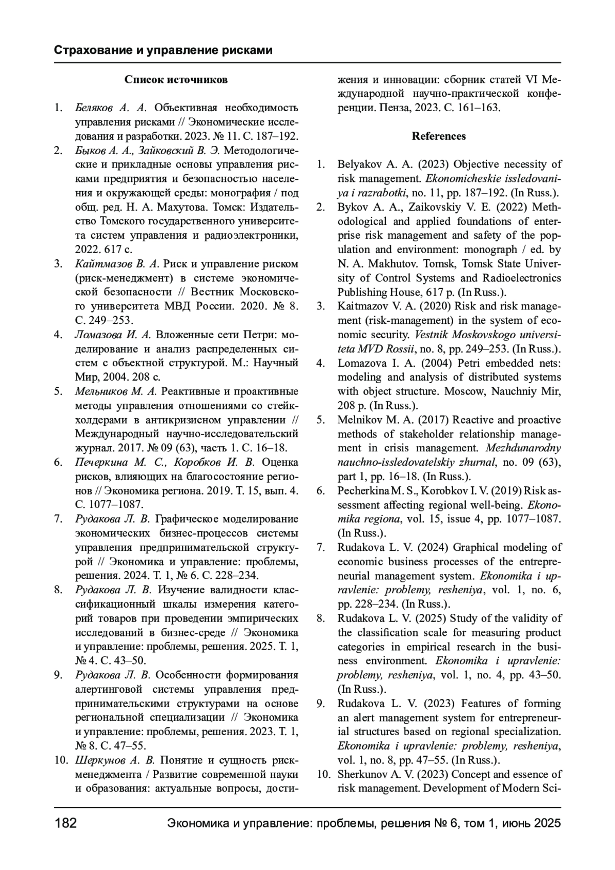 1. Беляков А. А. Объективная необходимость управления рисками // Экономические исследования и разработки. 2023. № 11. С. 187-192. EDN: VXPDVD