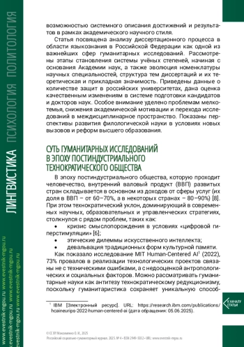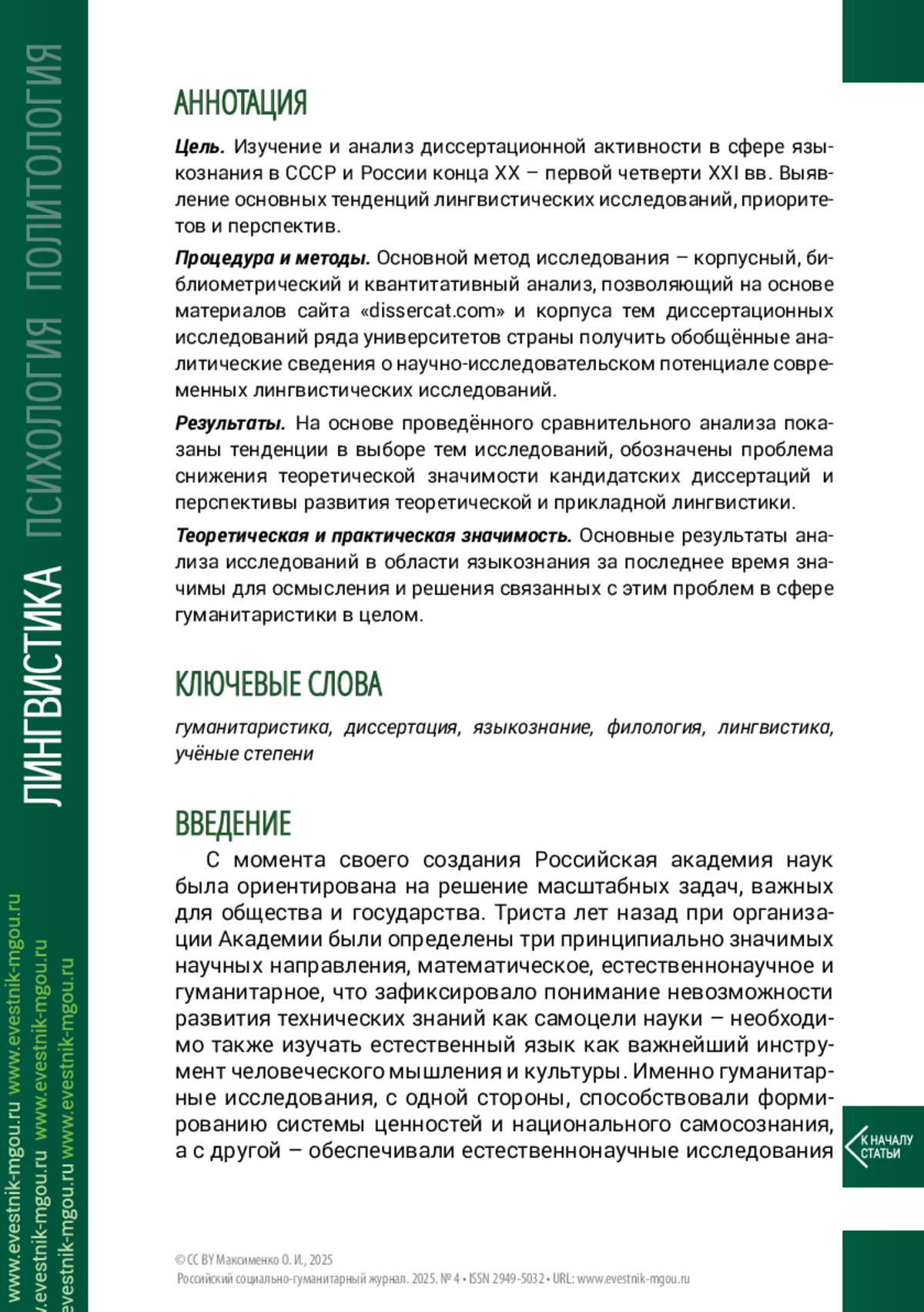 Цель. Изучение и анализ диссертационной активности в сфере языкознания в СССР и России конца XX – первой четверти XXI вв. Выявление основных тенденций лингвистических исследований, приоритетов и перспектив.