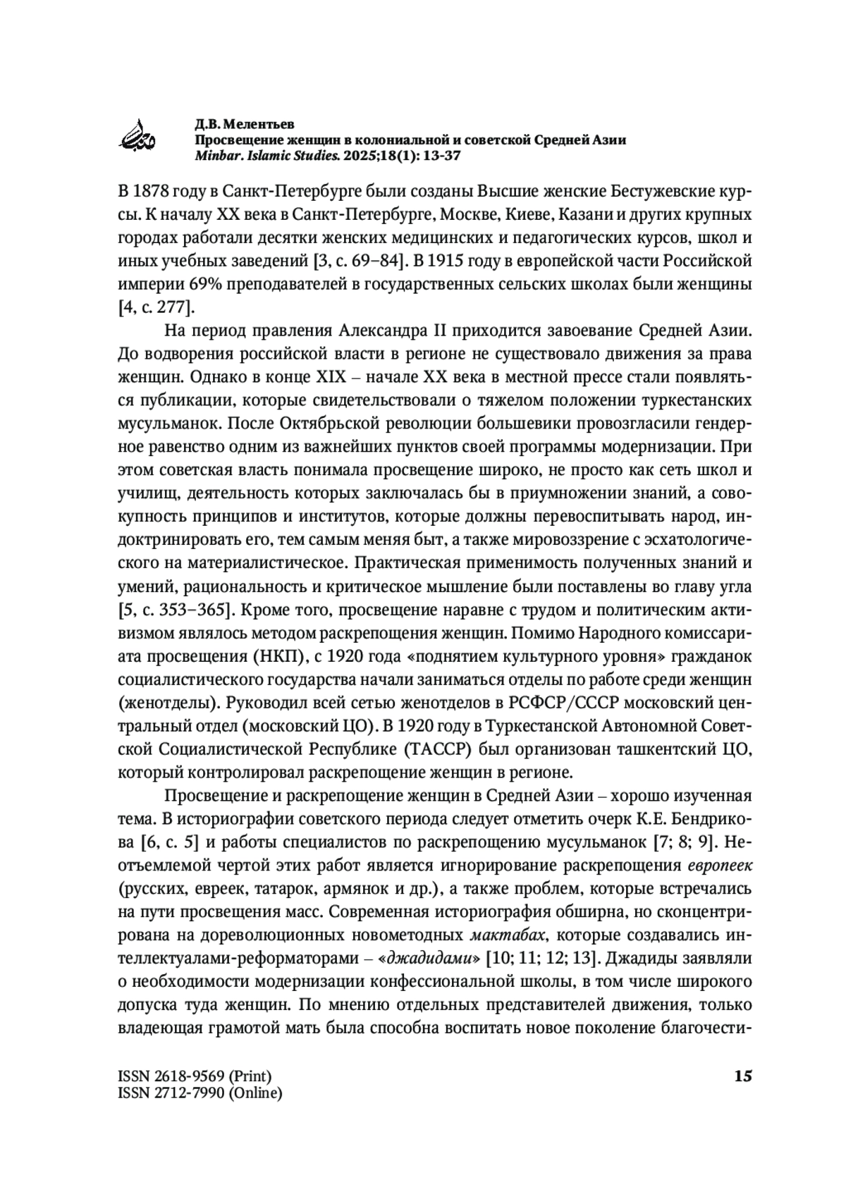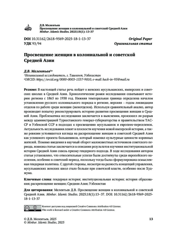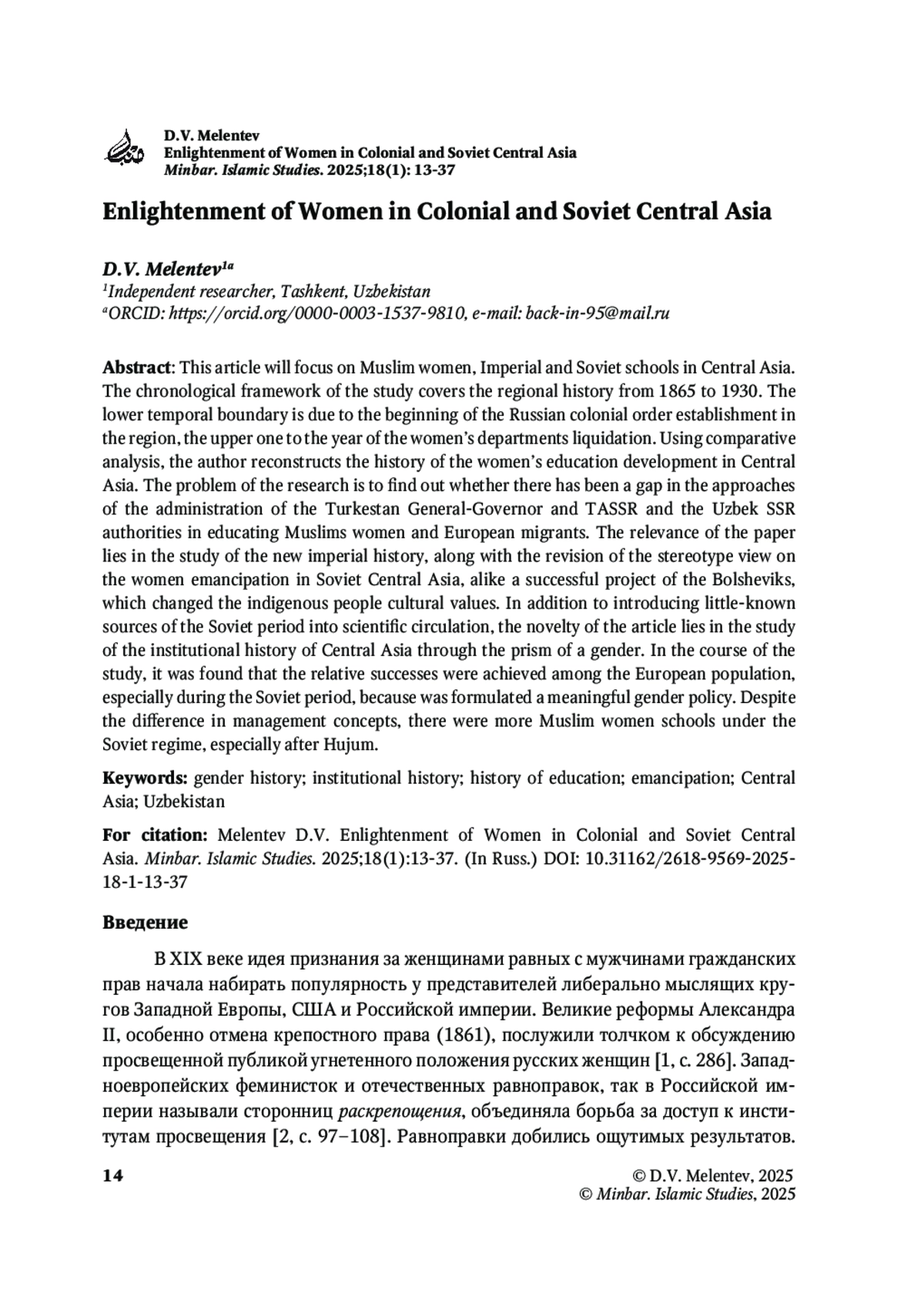 МЕЛЕНТЬЕВ Д. В. ПРОСВЕЩЕНИЕ ЖЕНЩИН В КОЛОНИАЛЬНОЙ И СОВЕТСКОЙ СРЕДНЕЙ АЗИИ // MINBAR. ISLAMIC STUDIES. 2025. № 1, ТОМ 18