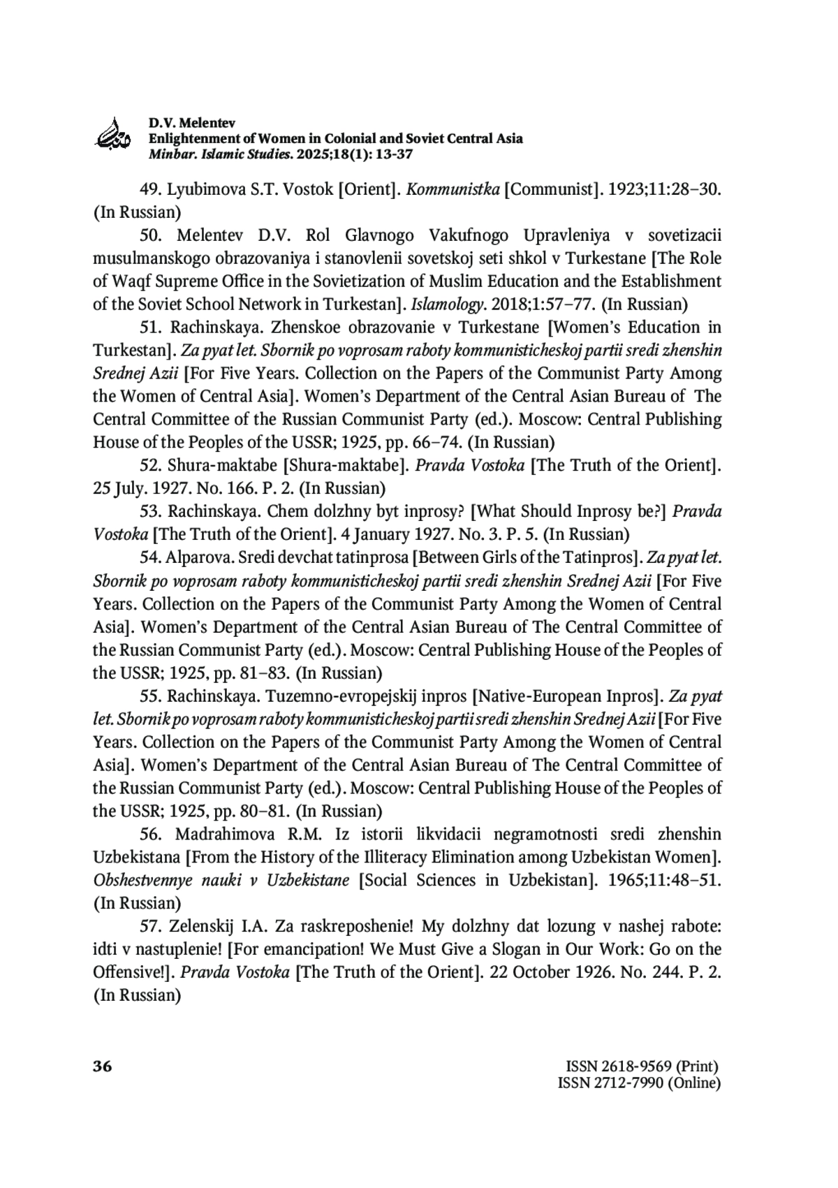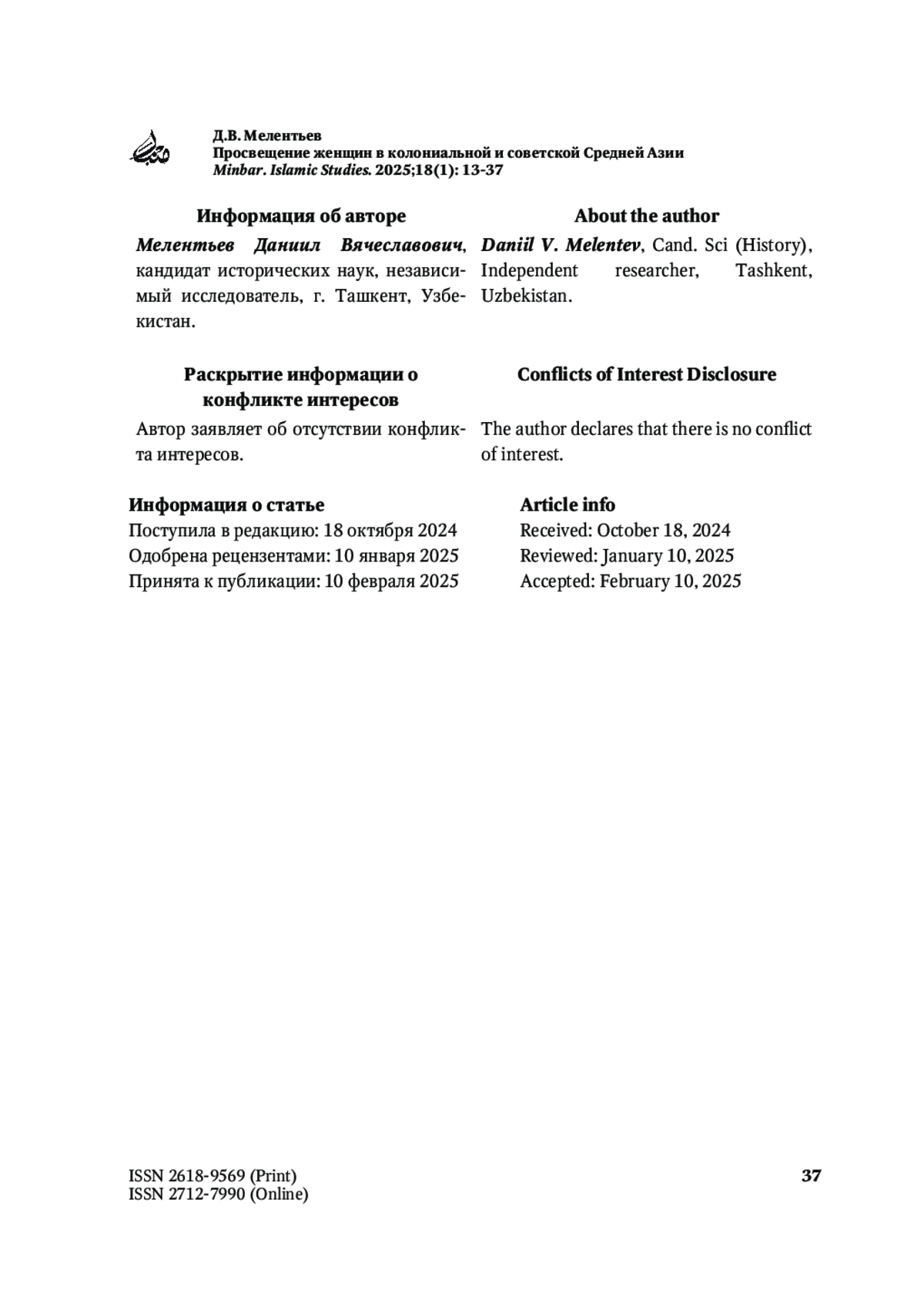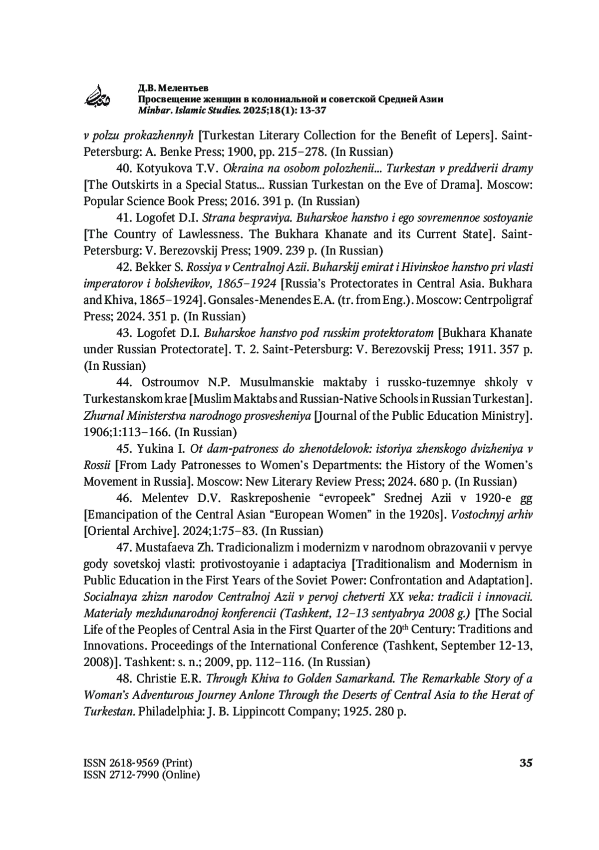 МЕЛЕНТЬЕВ Д. В. ПРОСВЕЩЕНИЕ ЖЕНЩИН В КОЛОНИАЛЬНОЙ И СОВЕТСКОЙ СРЕДНЕЙ АЗИИ // MINBAR. ISLAMIC STUDIES. 2025. № 1, ТОМ 18
