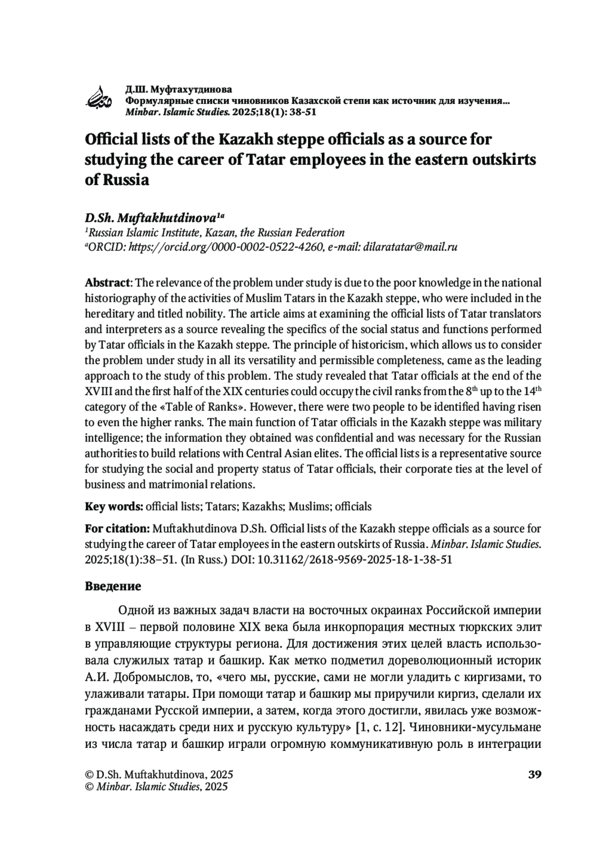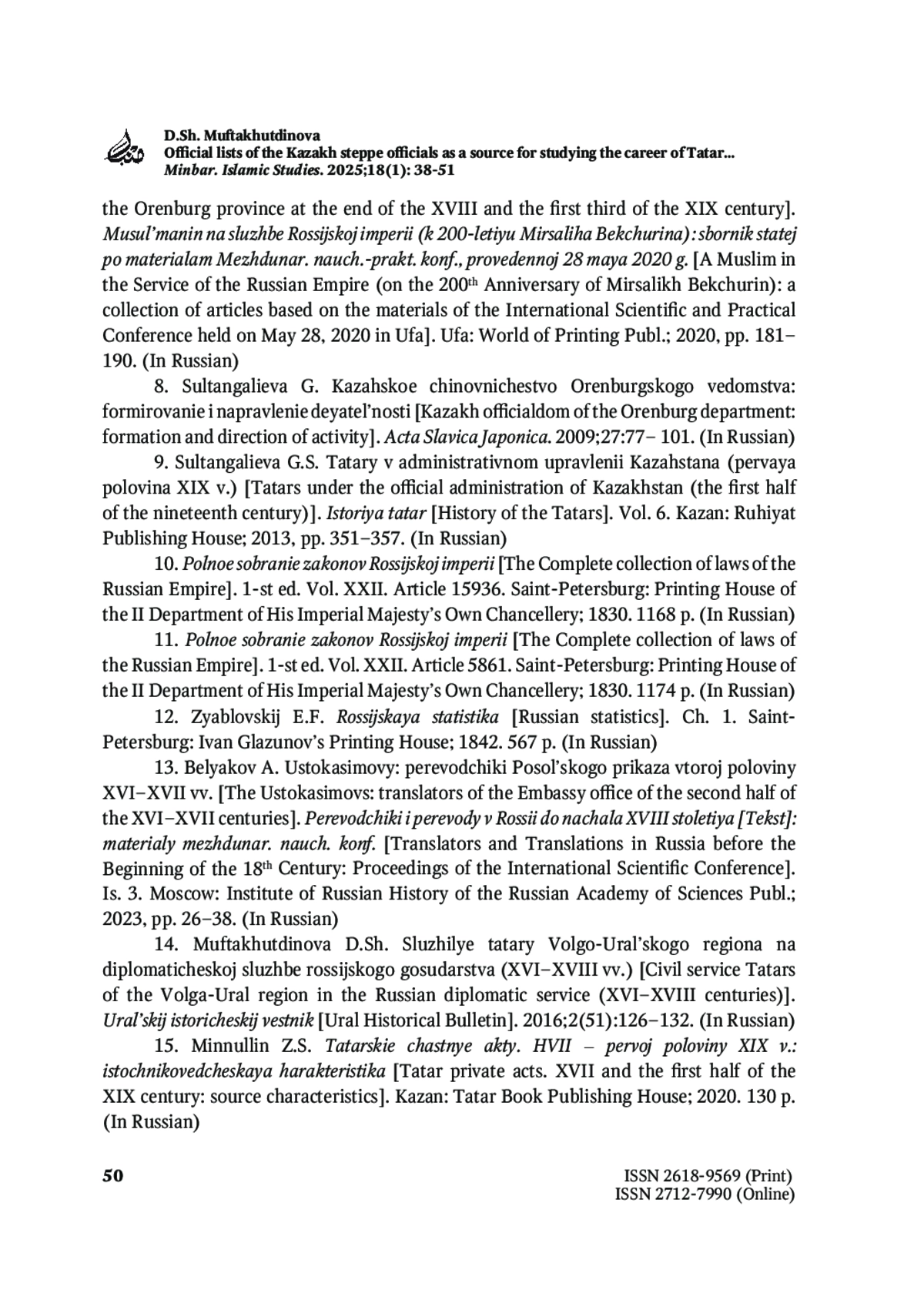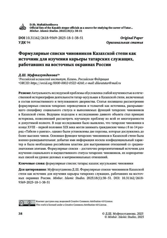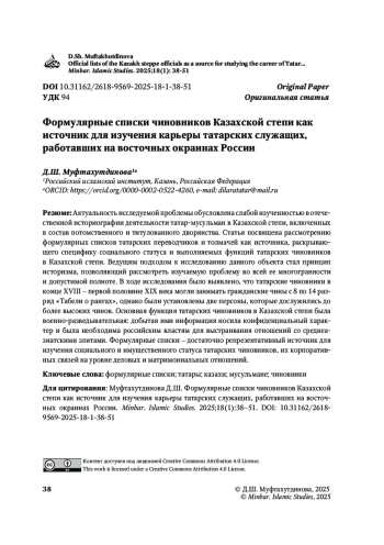 МУФТАХУТДИНОВА Д. Ш. ФОРМУЛЯРНЫЕ СПИСКИ ЧИНОВНИКОВ КАЗАХСКОЙ СТЕПИ КАК ИСТОЧНИК ДЛЯ ИЗУЧЕНИЯ КАРЬЕРЫ ТАТАРСКИХ СЛУЖАЩИХ, РАБОТАВШИХ НА ВОСТОЧНЫХ ОКРАИНАХ РОССИИ // MINBAR. ISLAMIC STUDIES. 2025. № 1, ТОМ 18