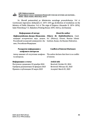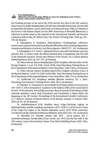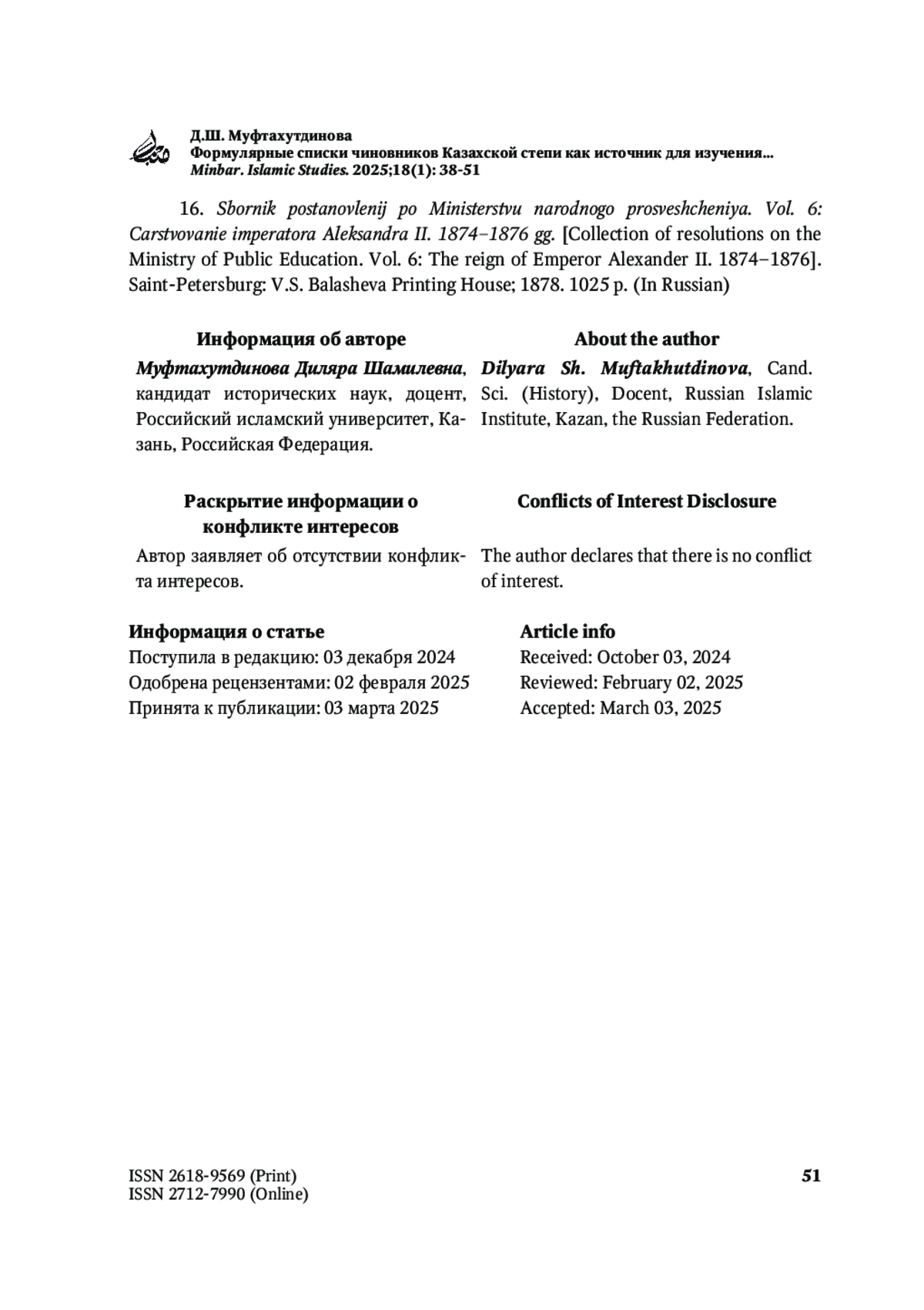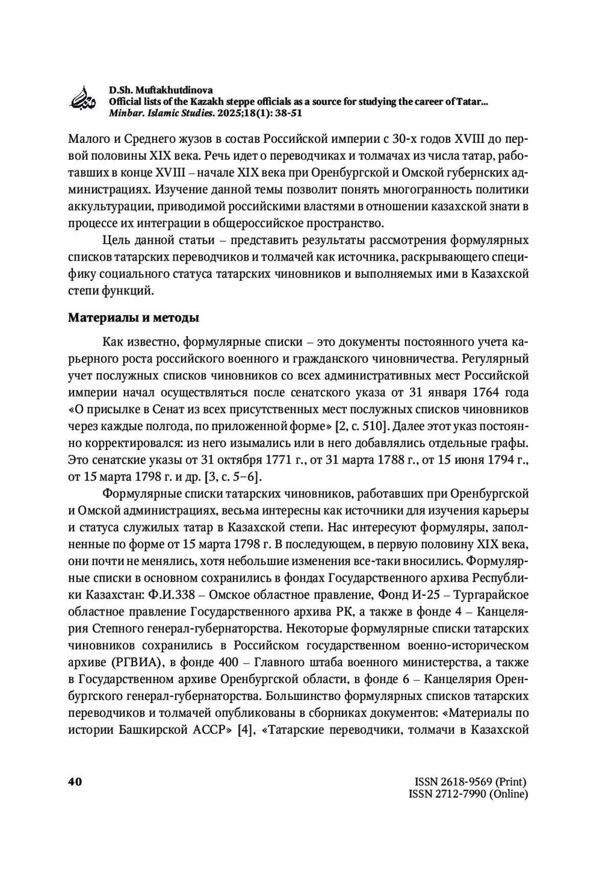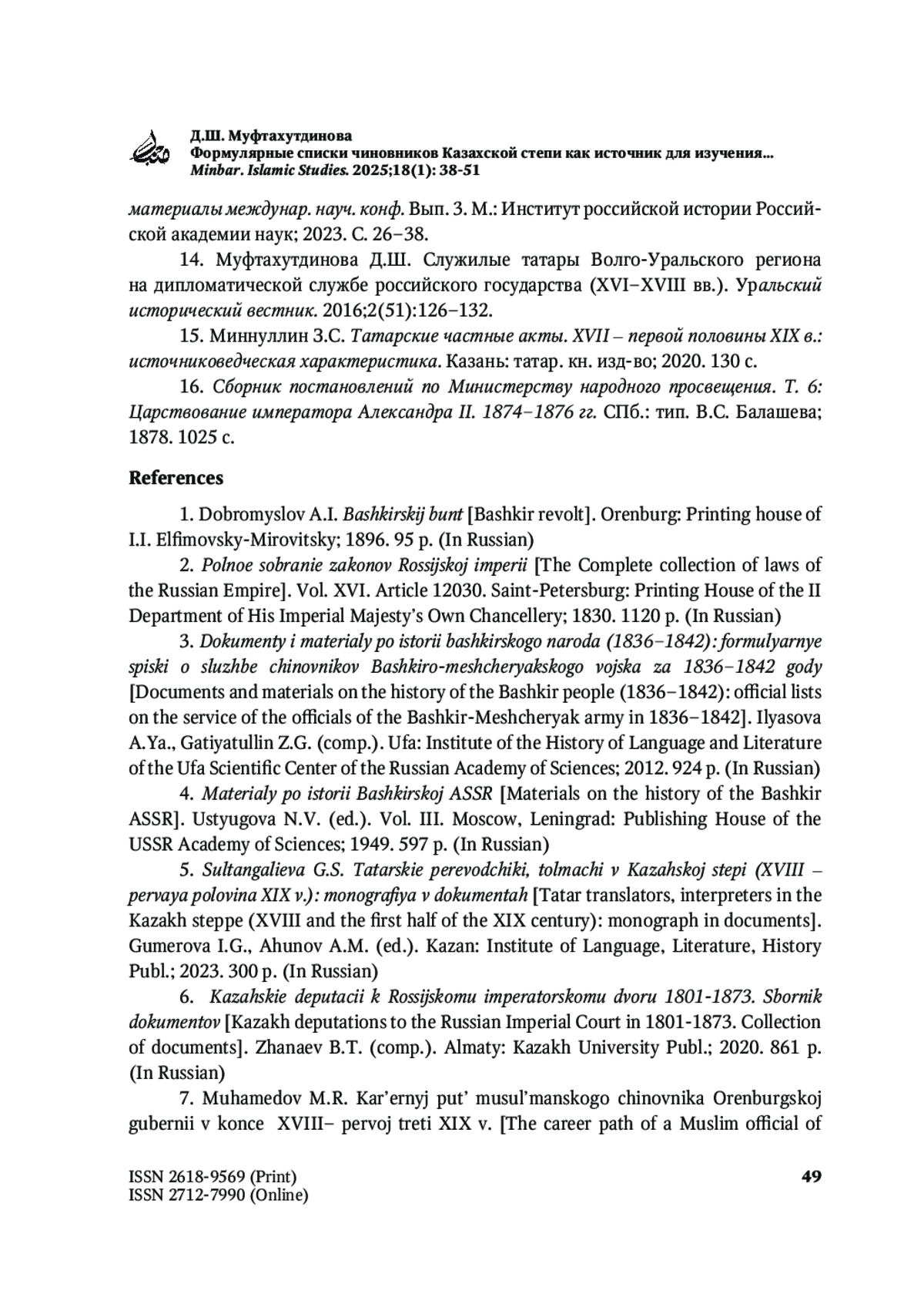 МУФТАХУТДИНОВА Д. Ш. ФОРМУЛЯРНЫЕ СПИСКИ ЧИНОВНИКОВ КАЗАХСКОЙ СТЕПИ КАК ИСТОЧНИК ДЛЯ ИЗУЧЕНИЯ КАРЬЕРЫ ТАТАРСКИХ СЛУЖАЩИХ, РАБОТАВШИХ НА ВОСТОЧНЫХ ОКРАИНАХ РОССИИ // MINBAR. ISLAMIC STUDIES. 2025. № 1, ТОМ 18