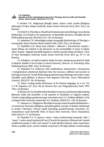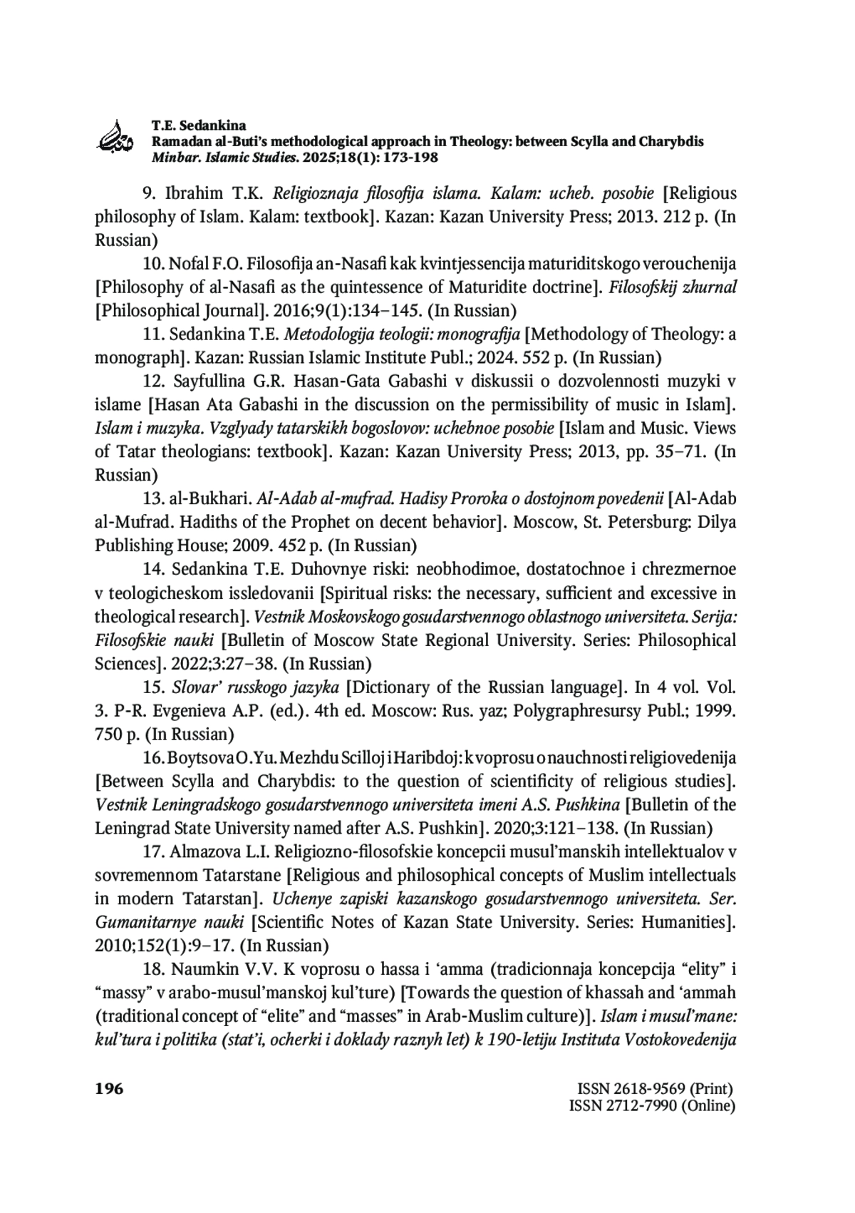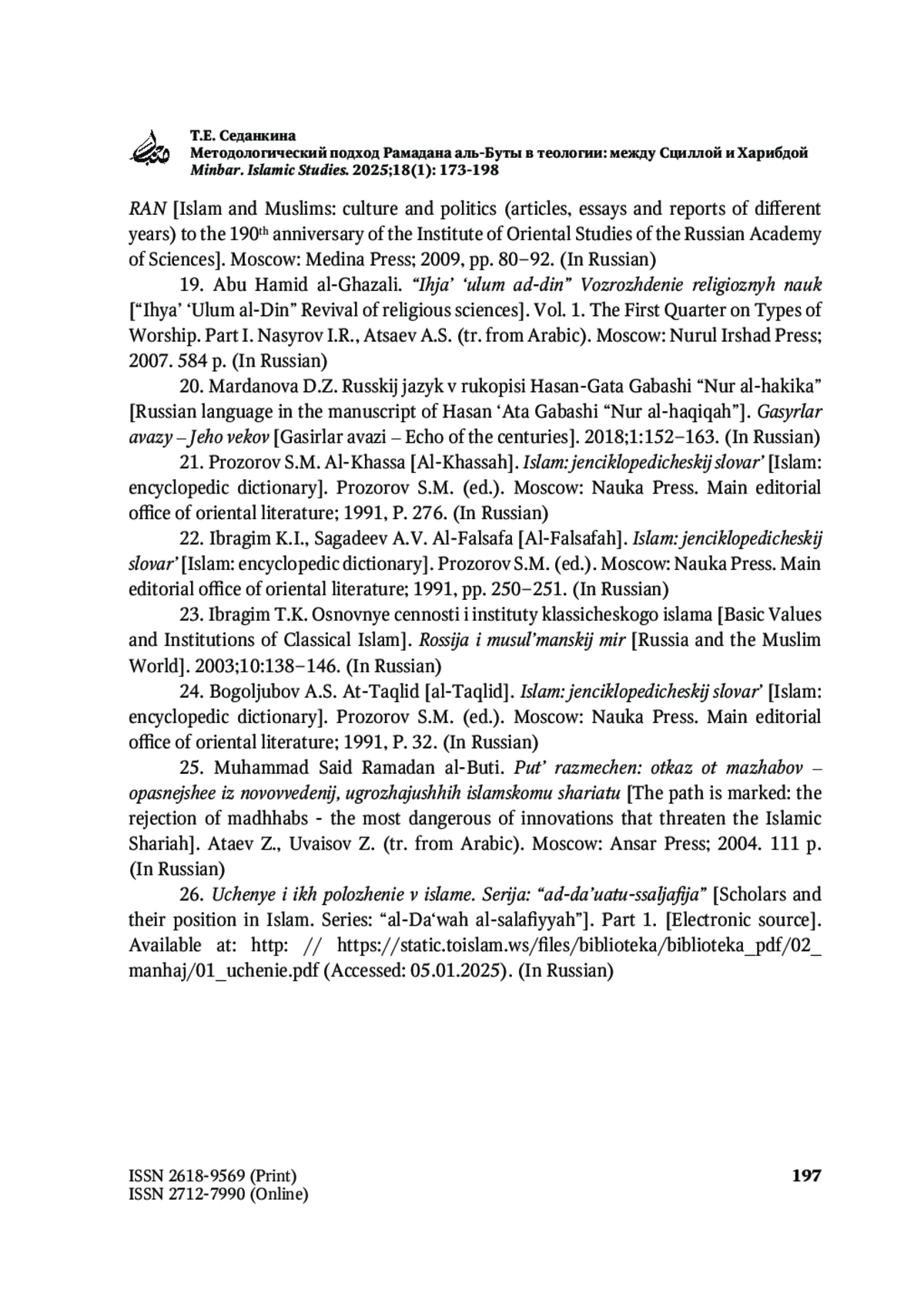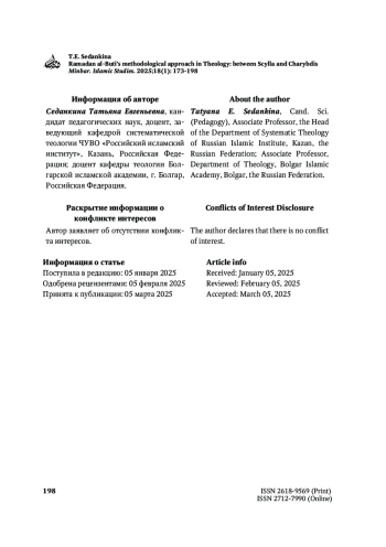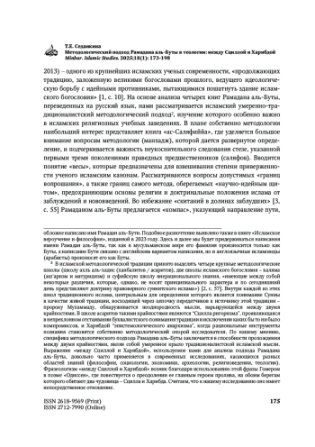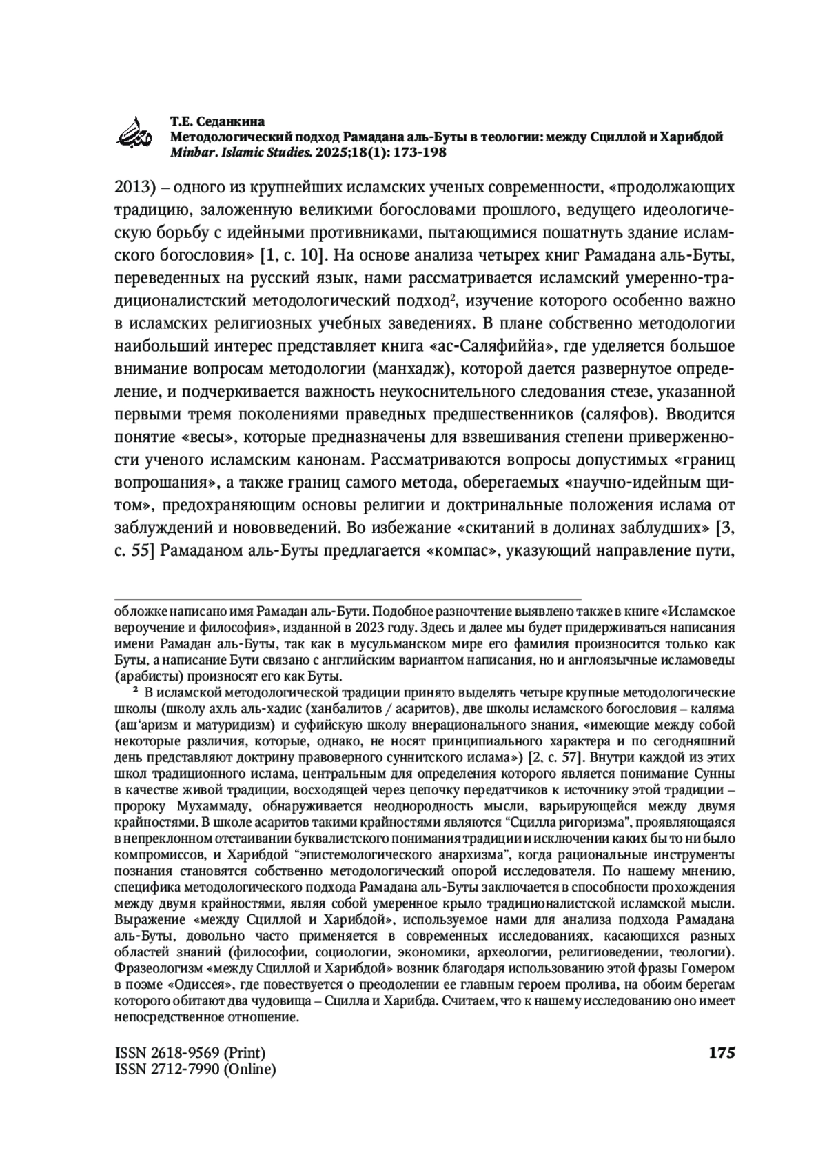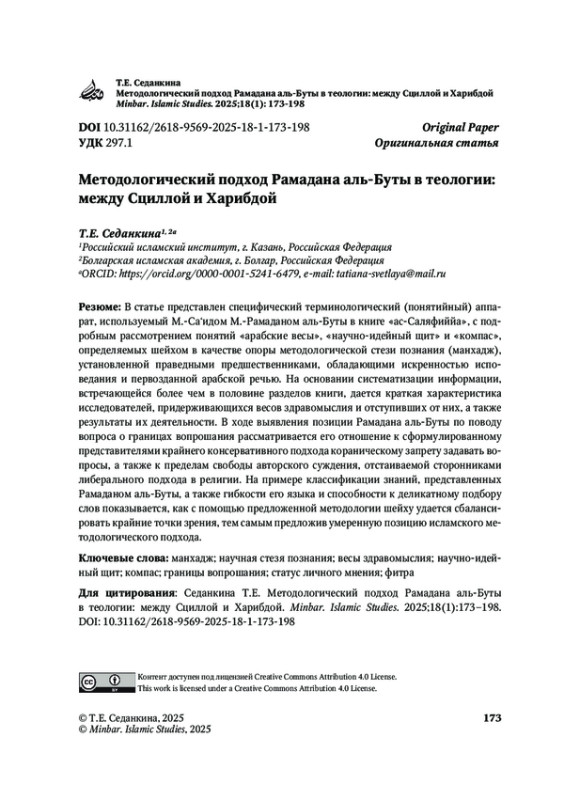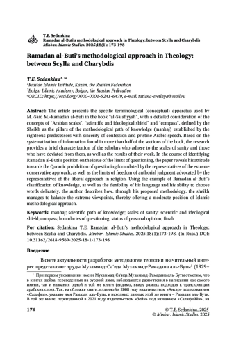 СЕДАНКИНА Т. Е. МЕТОДОЛОГИЧЕСКИЙ ПОДХОД РАМАДАНА АЛЬ-БУТЫ В ТЕОЛОГИИ: МЕЖДУ СЦИЛЛОЙ И ХАРИБДОЙ // MINBAR. ISLAMIC STUDIES. 2025. № 1, ТОМ 18