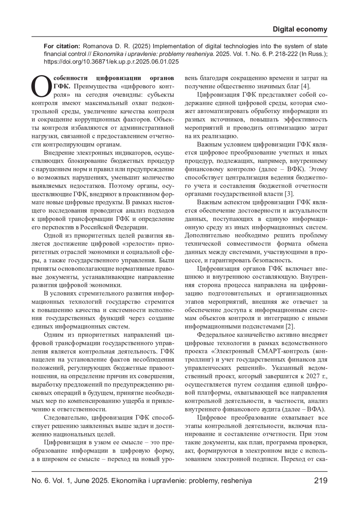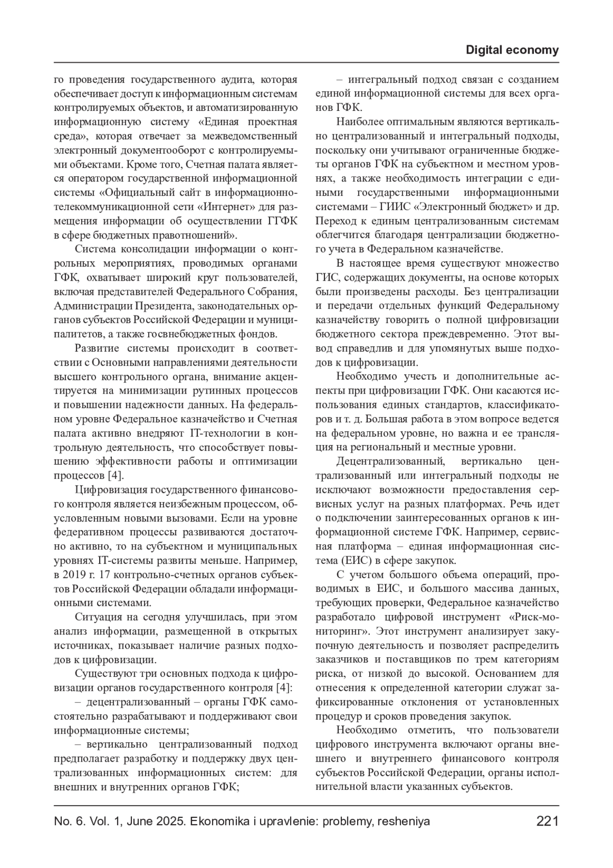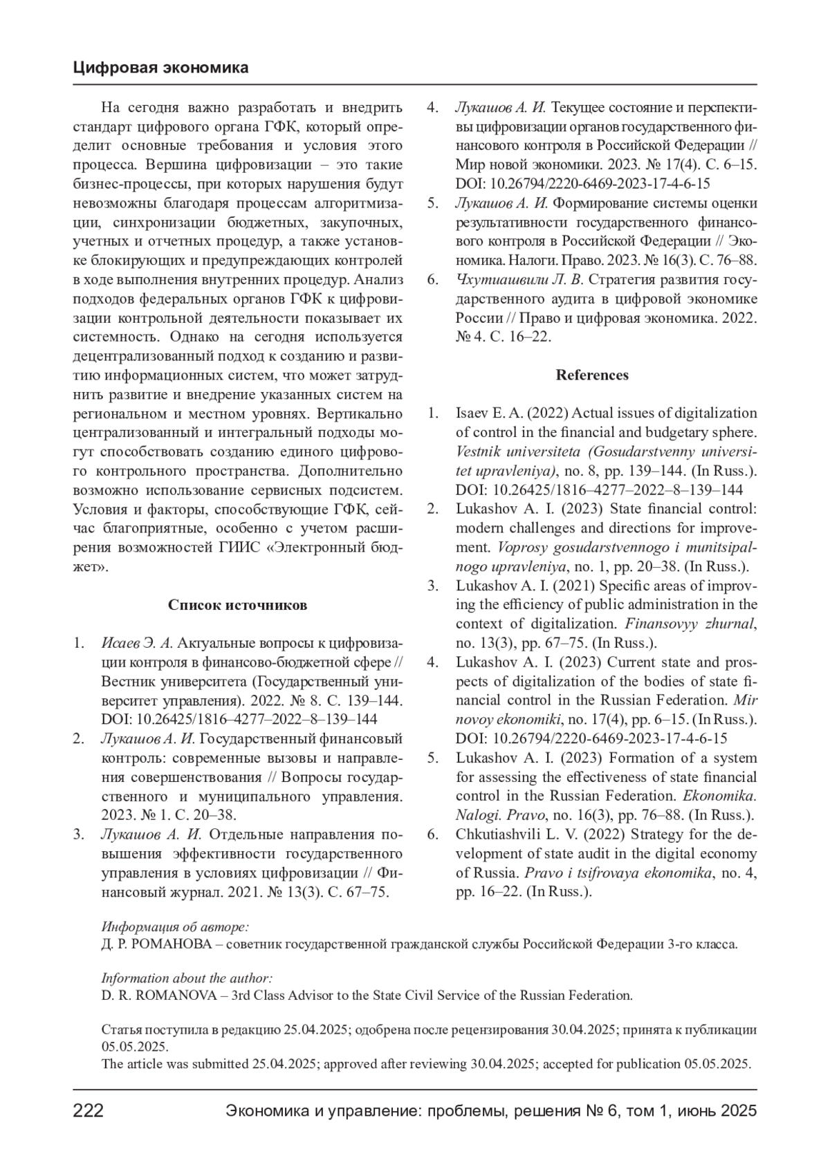 1. Исаев Э. А. Актуальные вопросы к цифровизации контроля в финансово-бюджетной сфере // Вестник университета (Государственный университет управления). 2022. № 8. С. 139-144. DOI: 10.26425/1816-4277-2022-8-139-144