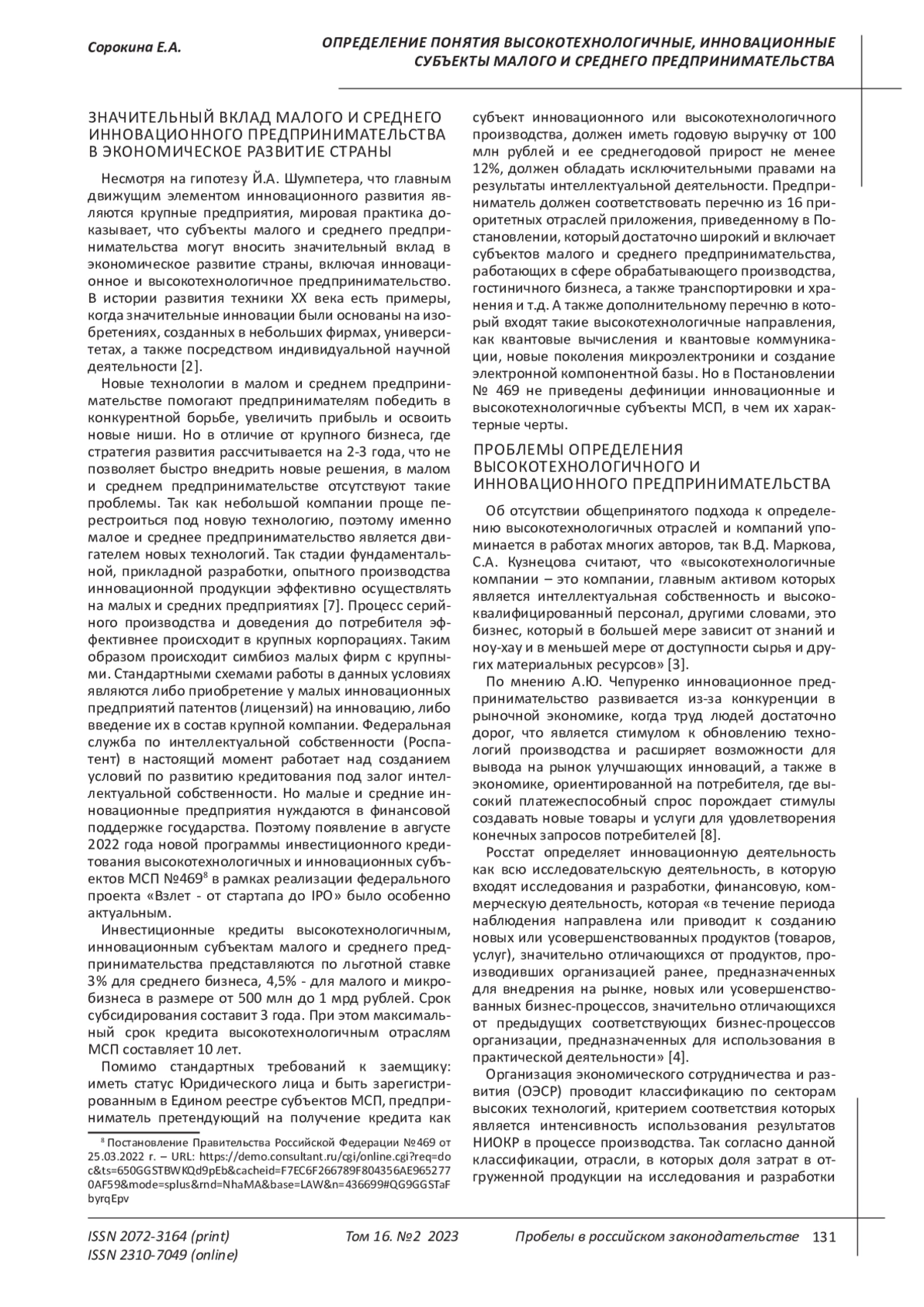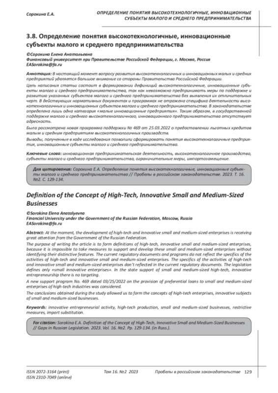 В настоящий момент вопросу развития высокотехнологичных и инновационных малых и средних предприятий уделяется большое внимание со стороны Правительства Российской Федерации. Цель написания статьи состоит в формировании дефиниций высокотехнологичные, инновационные субъекты малого и среднего предпринимательства, так как невозможно предпринимать меры по поддержке и развитию указанных субъектов малого и среднего предпринимательства без выявления их отличительных черт. В действующих нормативных документах и программах не отражена специфика деятельности высокотехнологичных и инновационных субъектов малого и среднего предпринимательства. В законодательстве определена лишь одна категория «малые инновационные предприятия». Таким образом, в государственной поддержке малого и среднего высокотехнологичного, инновационного предпринимательства отсутствует адресность. Была рассмотрена новая программа поддержки № 469 от 25.03.2022 о предоставлении льготных кредитов малым и средним предприятиям высокотехнологичных производств. Выводы, полученные в ходе исследования позволили сформировать понятия высокотехнологичные предприятия, инновационные субъекты малого и среднего предпринимательства.