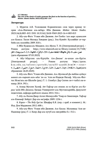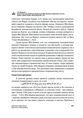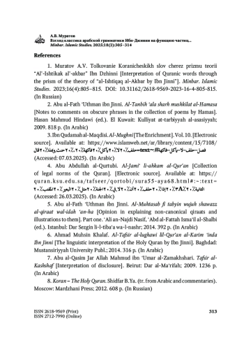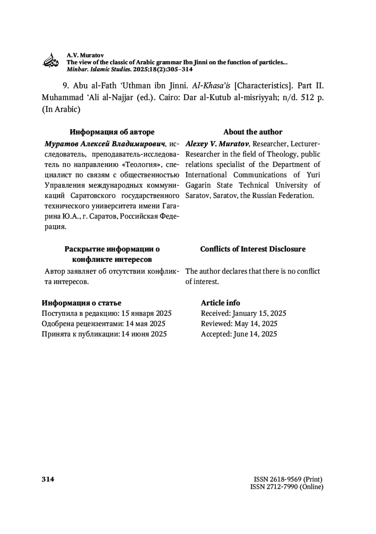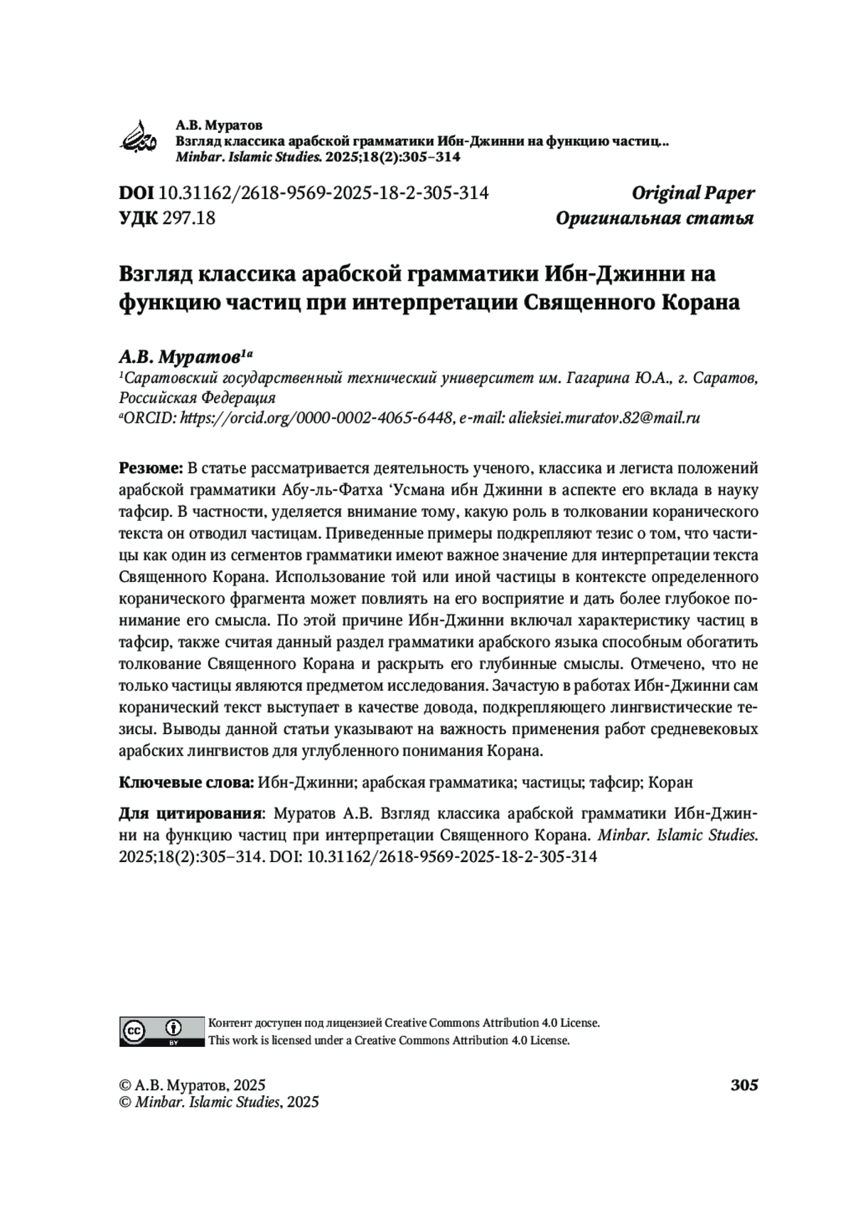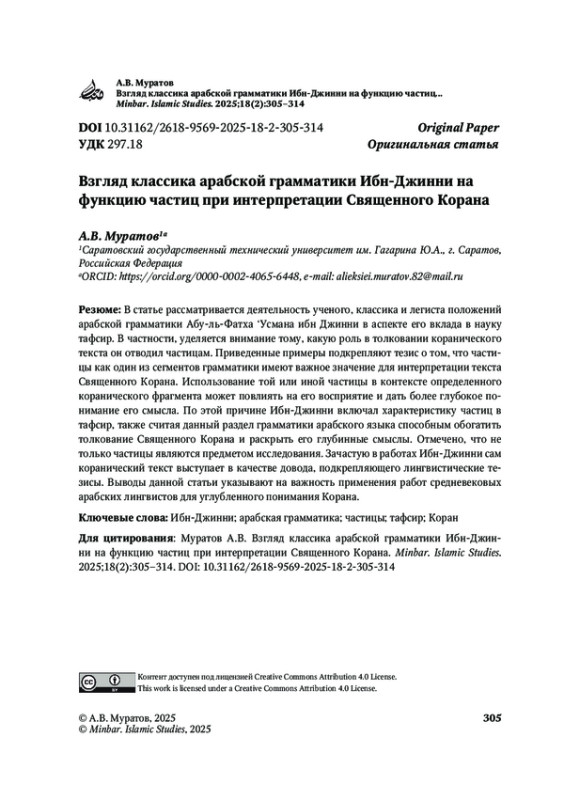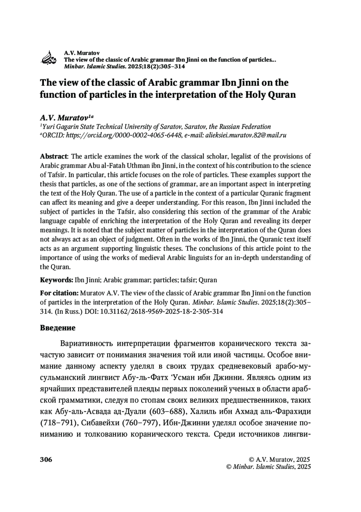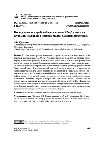 МУРАТОВ А. В. ВЗГЛЯД КЛАССИКА АРАБСКОЙ ГРАММАТИКИ ИБН-ДЖИННИ НА ФУНКЦИЮ ЧАСТИЦ ПРИ ИНТЕРПРЕТАЦИИ СВЯЩЕННОГО КОРАНА // MINBAR. ISLAMIC STUDIES. 2025. № 2, ТОМ 18