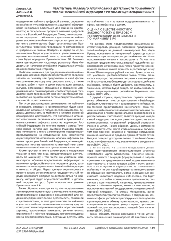 В данной научно-аналитической работе изучаются и анализируются существующие и перспективные решения в сфере правового регулирования майнинга криптовалют в иностранных государствах и Российской Федерации. В рамках научно-аналитического аспекта данной работы рассматриваются юридические и социально-экономические аспекты правового регулирования майнинга криптовалют в России, а также даётся характеристика существующему законопроекту, призванному выстроить систему законодательства вокруг деятельности по майнингу криптовалют.