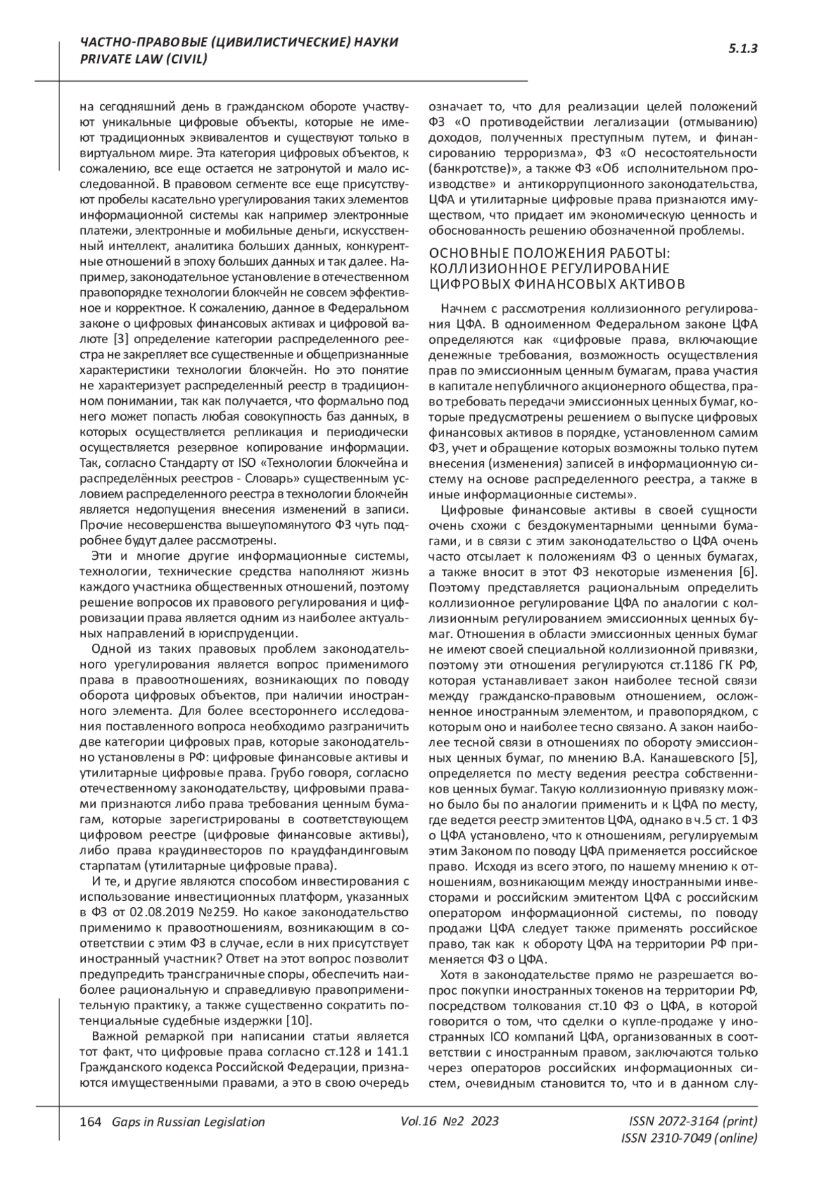 Все гораздо сложнее обстоит с правовым установлением криптовалютных отношений в материальном отечественном правопорядке, не говоря уже о коллизионных привязках. По мнению председателя Высшего арбитражного суда РФ с 26 января 2005 по 6 августа 2014 года Антон Александровича Иванова, которое он высказал на своем YouTube канале1, законодатель также не совсем ясно установил природу и правовой режим технологии блокчейн, которая является системообразующим признаком криптовалюты. Также в российском законодательстве использование цифровой валюты сильно ограничено, более того, между нормами ФЗ о ЦФА, регулирующих цифровую валюту, присутствует противоречие. Пункт 3 статьи 1 этого Федерального закона характеризует цифровую валюту как цифровой код в информационной системе, используемое в качестве средства платежа или инвестиций, в которых отсутствует обязанное лицо, в то время как пункт 5 статьи 14 ограничивает резидентов РФ принимать встречное представление цифровой валютой. То есть резиденты РФ вправе покупать, продавать, передавать по наследству цифровую валюту, но не могут рассчитываться ею за товары, услуги или работы с другими резидентами РФ.