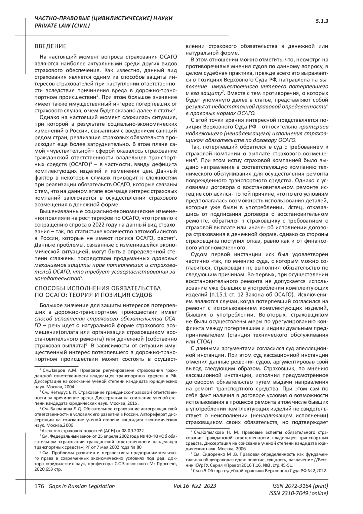 В статье отмечена актуальность на сегодняшний день проблем правоприменения в правоотношениях по страхованию гражданской ответственности владельцев транспортных средств. Автором затронуты экономические и правовые аспекты ОСАГО. Проанализирована судебная практика, выявлены пробелы в законодательстве, сделаны предложения по внесению соответствующих изменений. Выводы. По своей правовой природе субъективное право выбора, предоставленное законом потерпевшему, которое состоит в осуществлении ремонта транспортного средства, (несмотря на несоответствие требованиям) или в отказе от исполнения страхового обязательства в натуре, не является возможностью выбора способа исполнения, под которым понимается денежная или натуральная формы страхового возмещения. По этой причине страховое обязательство для данной категории потерпевших (граждане РФ, которые являются собственниками транспортных средств, зарегистрированных в РФ) не относится к альтернативным. В законодательстве необходимо установить четкие и исчерпывающие основания, которые и являются исключениями из общего правила о натуральной форме возмещения для определенной категории потерпевших (граждане РФ, которые являются собственниками транспортных средств, зарегистрированных в РФ). Страховое обязательство (речь идет, в том числе, и об ОСАГО) и правоотношение по возмещению вреда в той части, в которой он не покрыт страховым возмещением, являются по своей правовой природе самостоятельными обязательствами.
