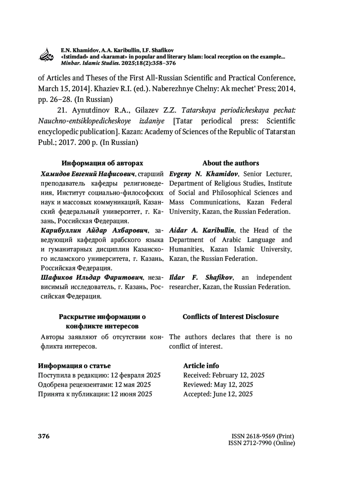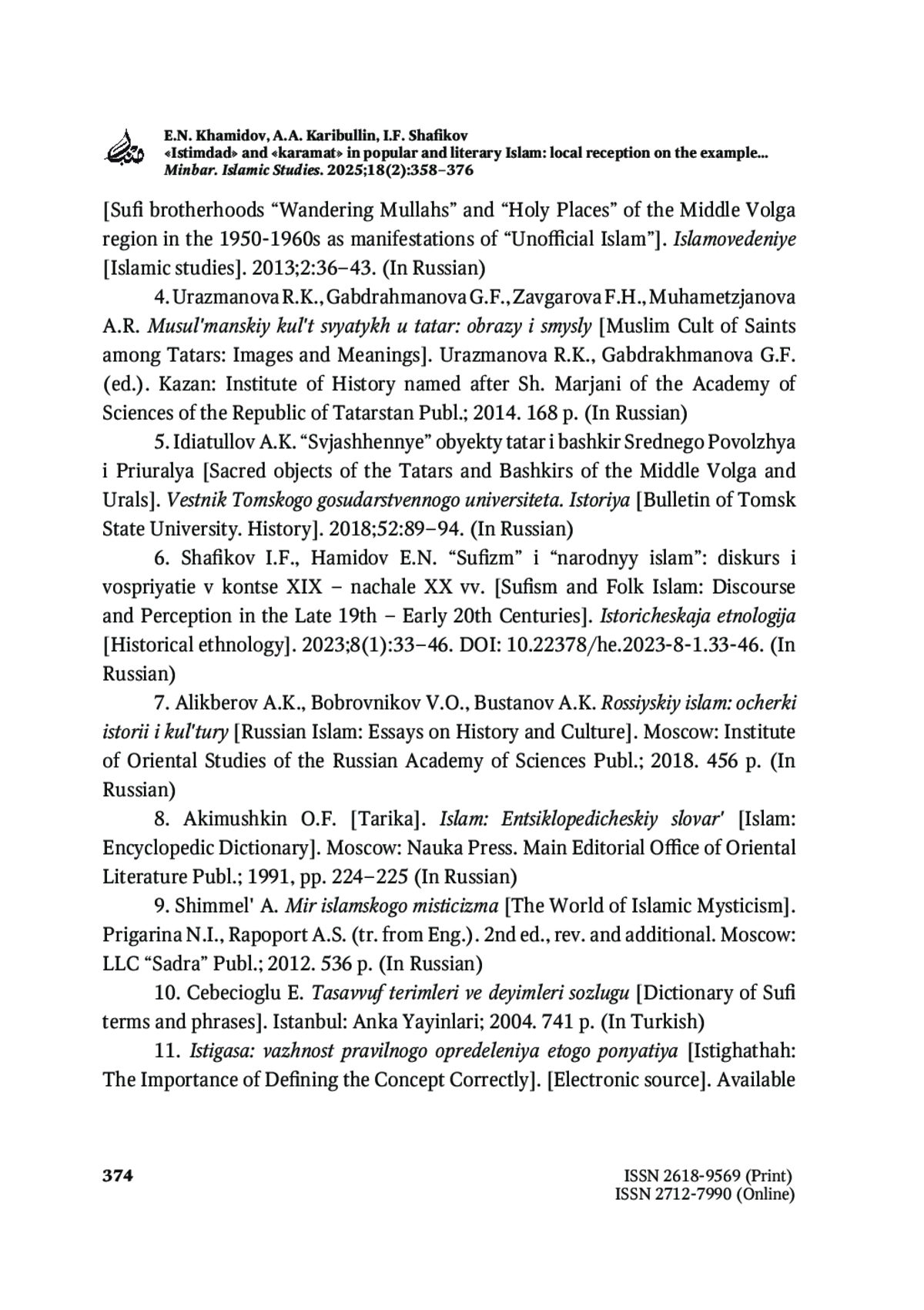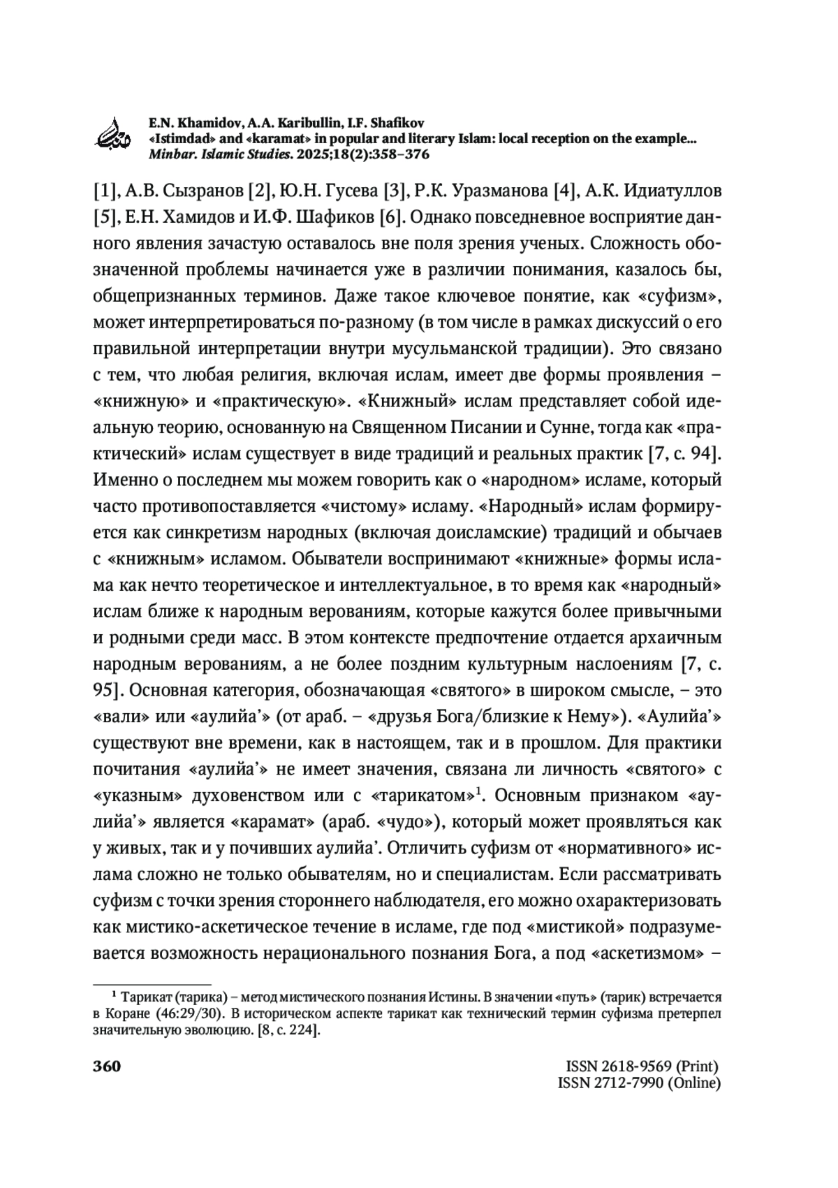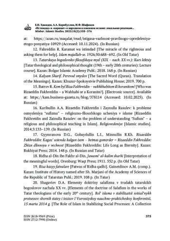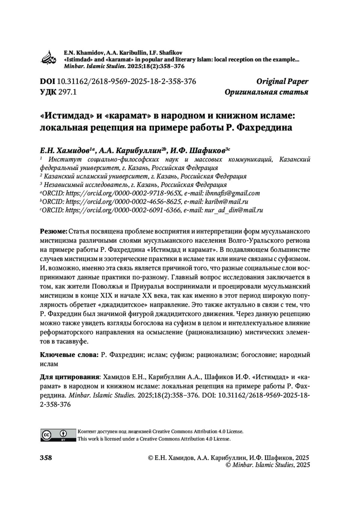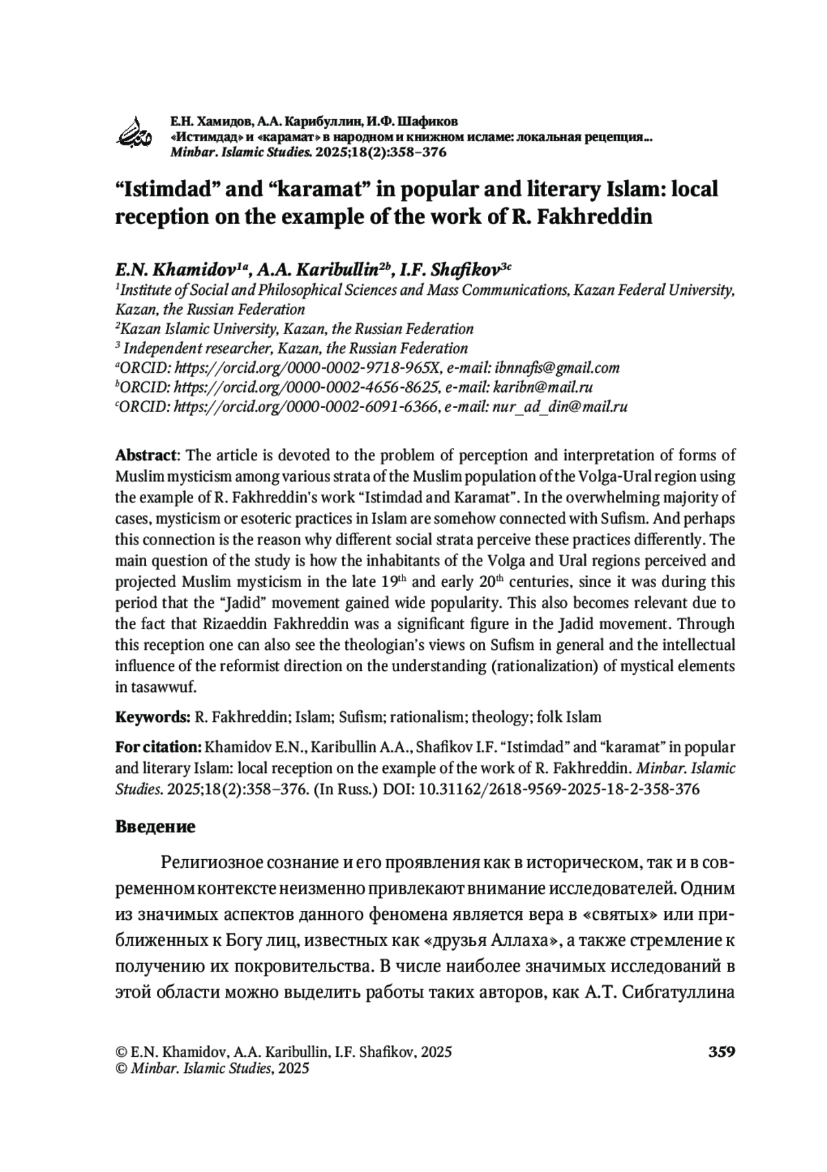 ХАМИДОВ Е. Н., КАРИБУЛЛИН А. А., ШАФИКОВ И. Ф. «ИСТИМДАД» И «КАРАМАТ» В НАРОДНОМ И КНИЖНОМ ИСЛАМЕ: ЛОКАЛЬНАЯ РЕЦЕПЦИЯ НА ПРИМЕРЕ РАБОТЫ Р. ФАХРЕДДИНА // MINBAR. ISLAMIC STUDIES. 2025. № 2, ТОМ 18