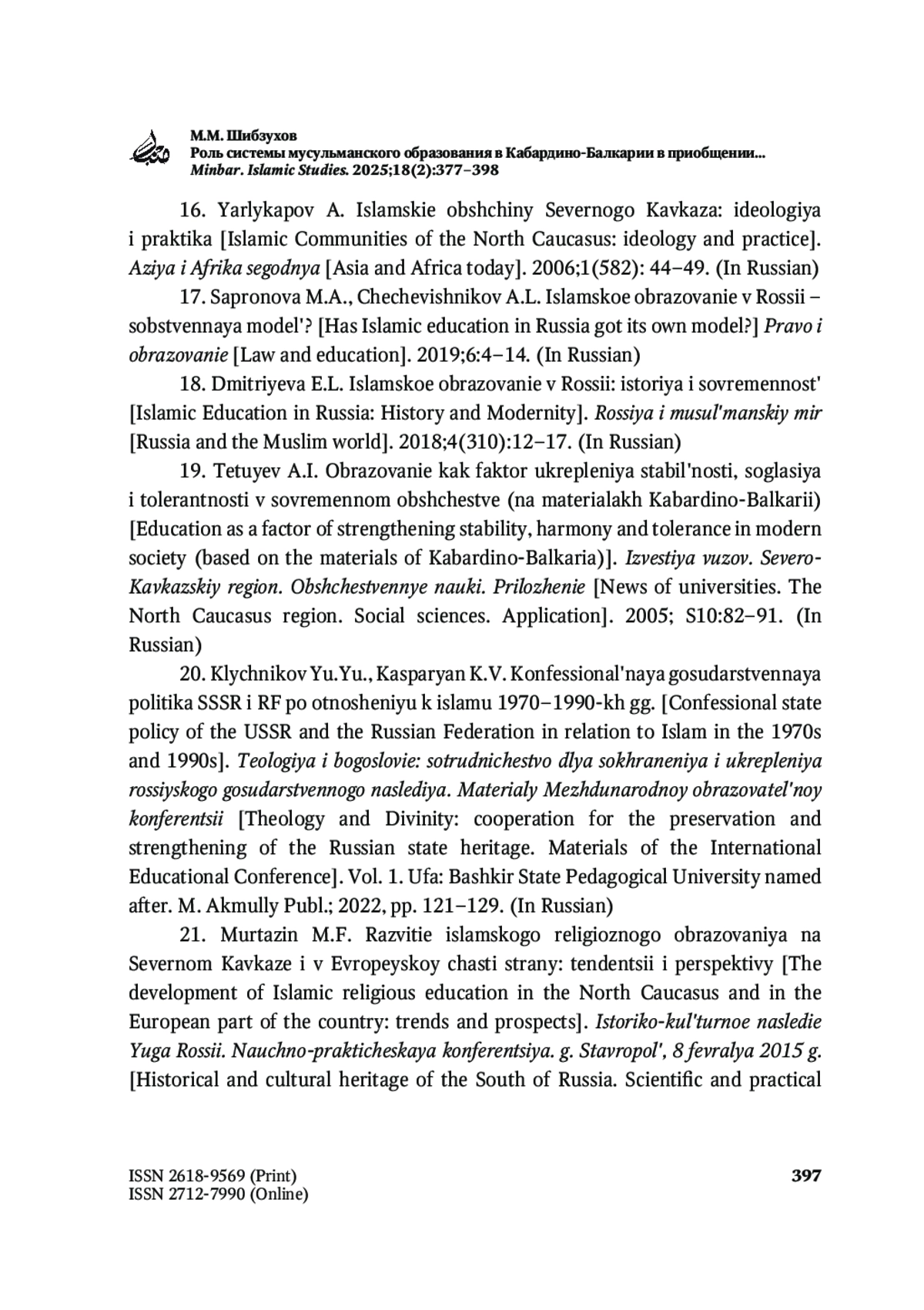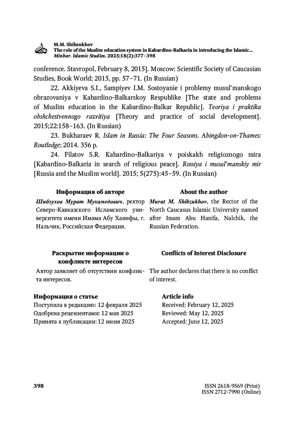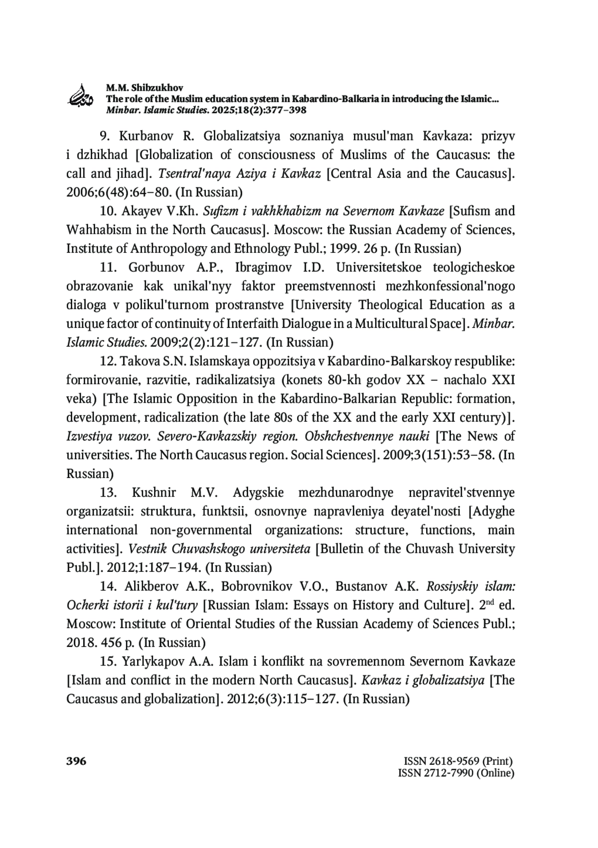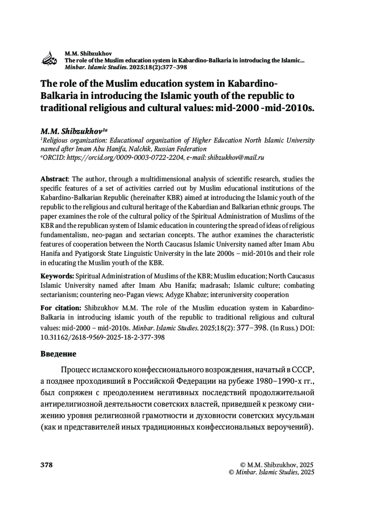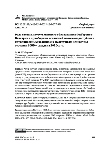 ШИБЗУХОВ М. М. РОЛЬ СИСТЕМЫ МУСУЛЬМАНСКОГО ОБРАЗОВАНИЯ В КАБАРДИНО- БАЛКАРИИ В ПРИОБЩЕНИИ ИСЛАМСКОЙ МОЛОДЕЖИ РЕСПУБЛИКИ К ТРАДИЦИОННЫМ РЕЛИГИОЗНО-КУЛЬТУРНЫМ ЦЕННОСТЯМ: СЕРЕДИНА 2000 – СЕРЕДИНА 2010-Х ГГ. // MINBAR. ISLAMIC STUDIES. 2025. № 2, ТОМ 18