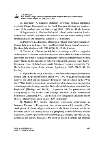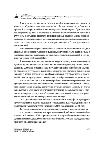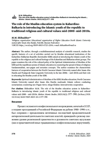 Статья: Роль системы мусульманского образования в Кабардино- Балкарии в приобщении исламской молодежи республики к традиционным религиозно-культурным ценностям: середина 2000 – середина 2010-х гг. (2025)
