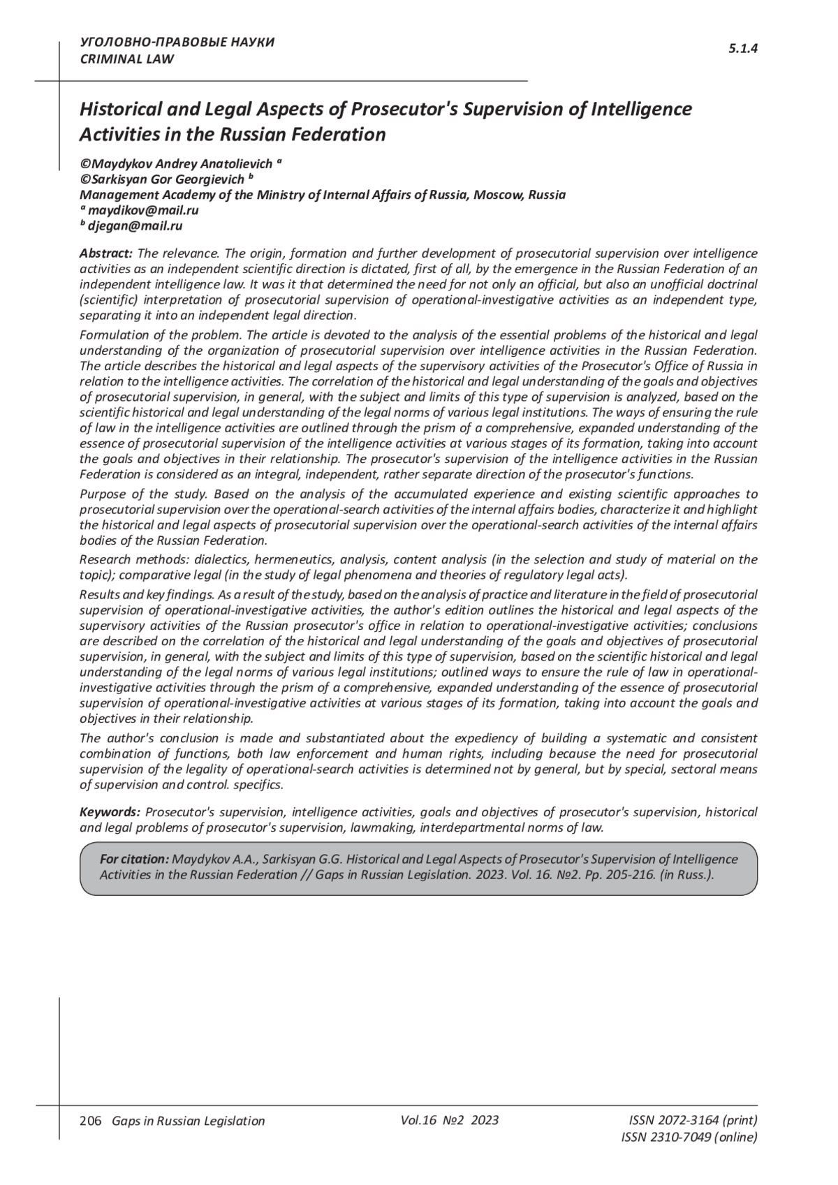 Dytchenko G.V. Development of prosecutorial supervision over the implementation of laws in operational-search activities. (Bachelor’s degree, specialist’s degree, master’s degree, postgraduate study). M.: 2020.