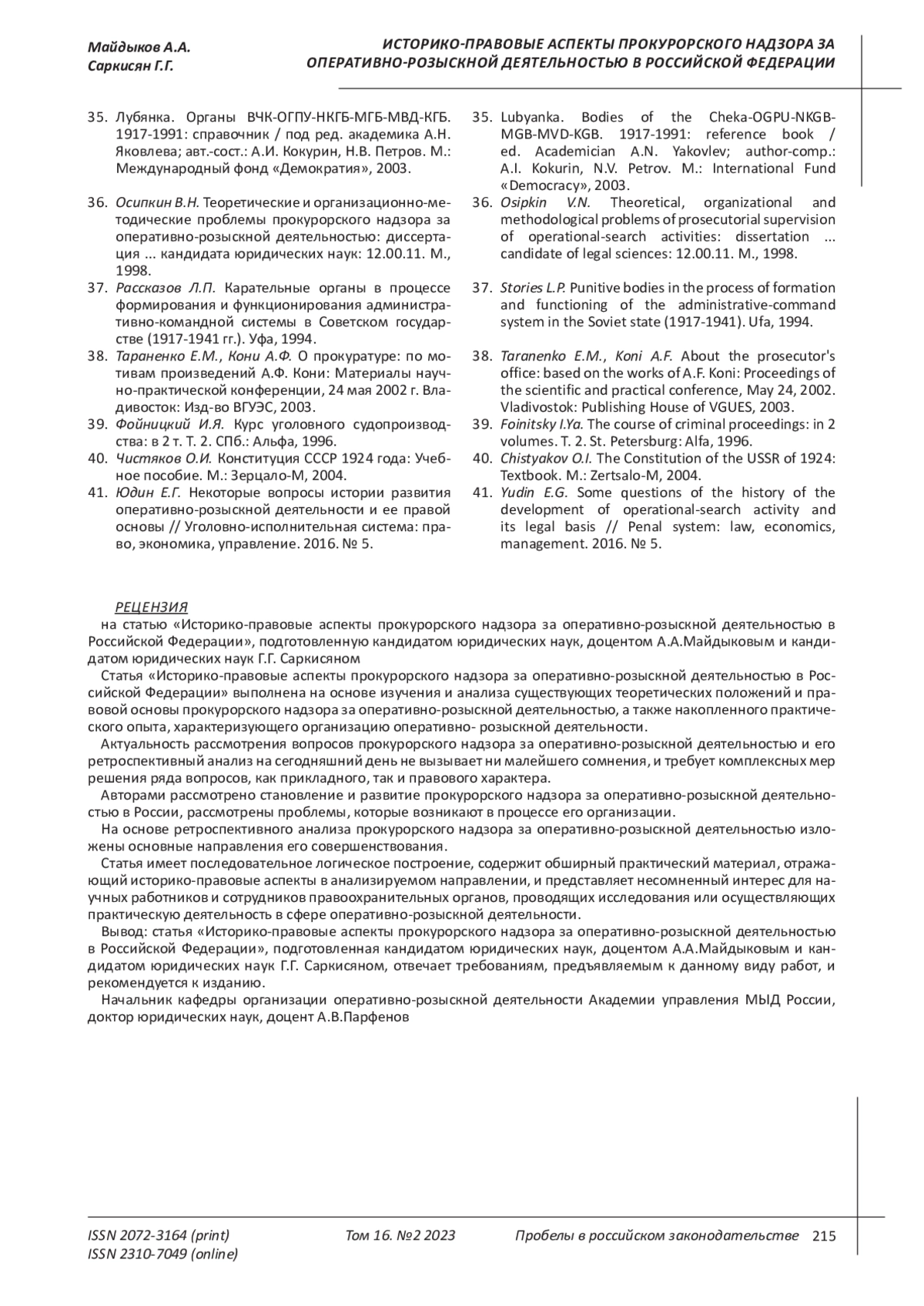 30. Дытченко Г.В. Развитие прокурорского надзора за исполнением законов в оперативно-розыскной деятельности. (Бакалавриат, специалитет, магистратура, аспирантура). М.: 2020. EDN: CVYHDB