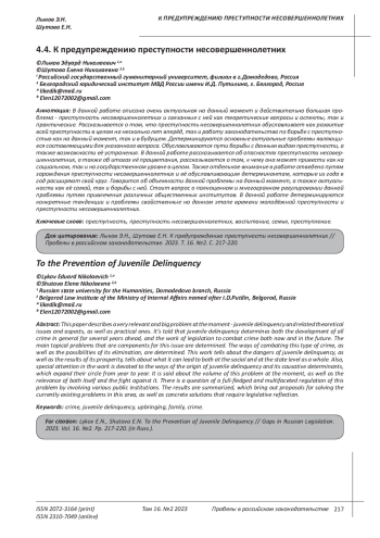 В данной работе описана очень актуальная на данный момент и действительно большая проблема - преступность несовершеннолетних и связанные с ней как теоретические вопросы и аспекты, так и практические. Рассказывается о том, что преступность несовершеннолетних обуславливает как развитие всей преступности в целом на несколько лет вперёд, так и работу законодательства по борьбе с преступностью как на данный момент, так и в будущем. Детерминируются основные актуальные проблемы являющиеся составляющими для указанного вопроса. Обуславливаются пути борьбы с данным видом преступности, а также возможности её устранения. В данной работе рассказывается об опасностях преступности несовершеннолетних, а также об итогах её процветания, рассказывается о том, к чему она может привести как на социальном, так и на государственном уровне в целом. Также отдельное внимание в работе отведено путям зарождения преступности несовершеннолетних и её обуславливающим детерминантам, которые из года в год расширяют свой круг. Говорится об объемности данной проблемы на данный момент, а также актуальности как её самой, так и борьбы с ней. Стоит вопрос о полноценном и многогранном регулировании данной проблемы путем привлечения различных общественных институтов. В данной работе детерминируются конкретные тенденции и проблемы свойственные на данном этапе времени молодёжной преступности и преступности несовершеннолетних.