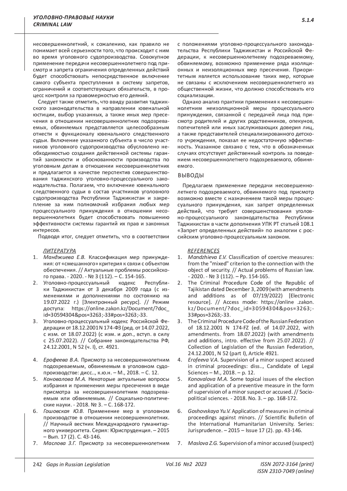 6. Гошовская Ю.В. Применение мер в уголовном производстве в отношении несовершеннолетних. // Научный вестник Международного гуманитарного университета. Серия: Юриспруденция. - 2015 - Вып. 17 (2). С. 43-146.
